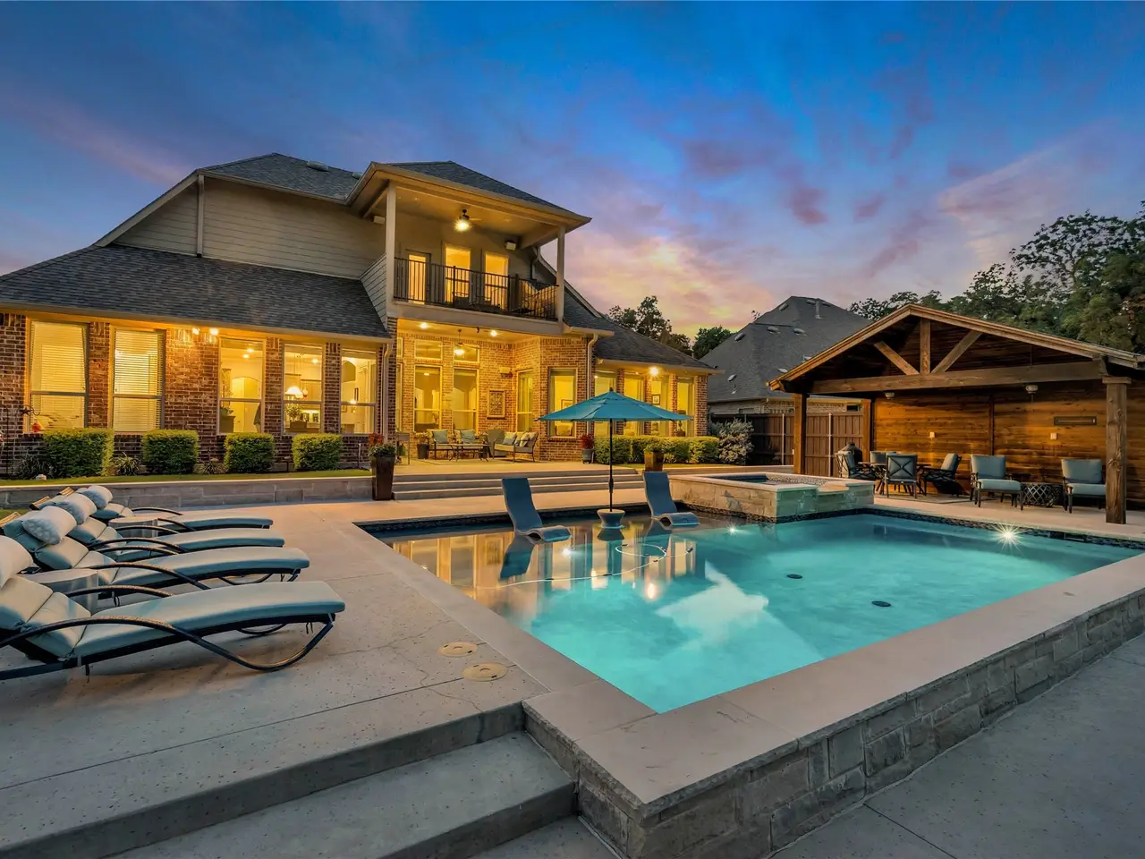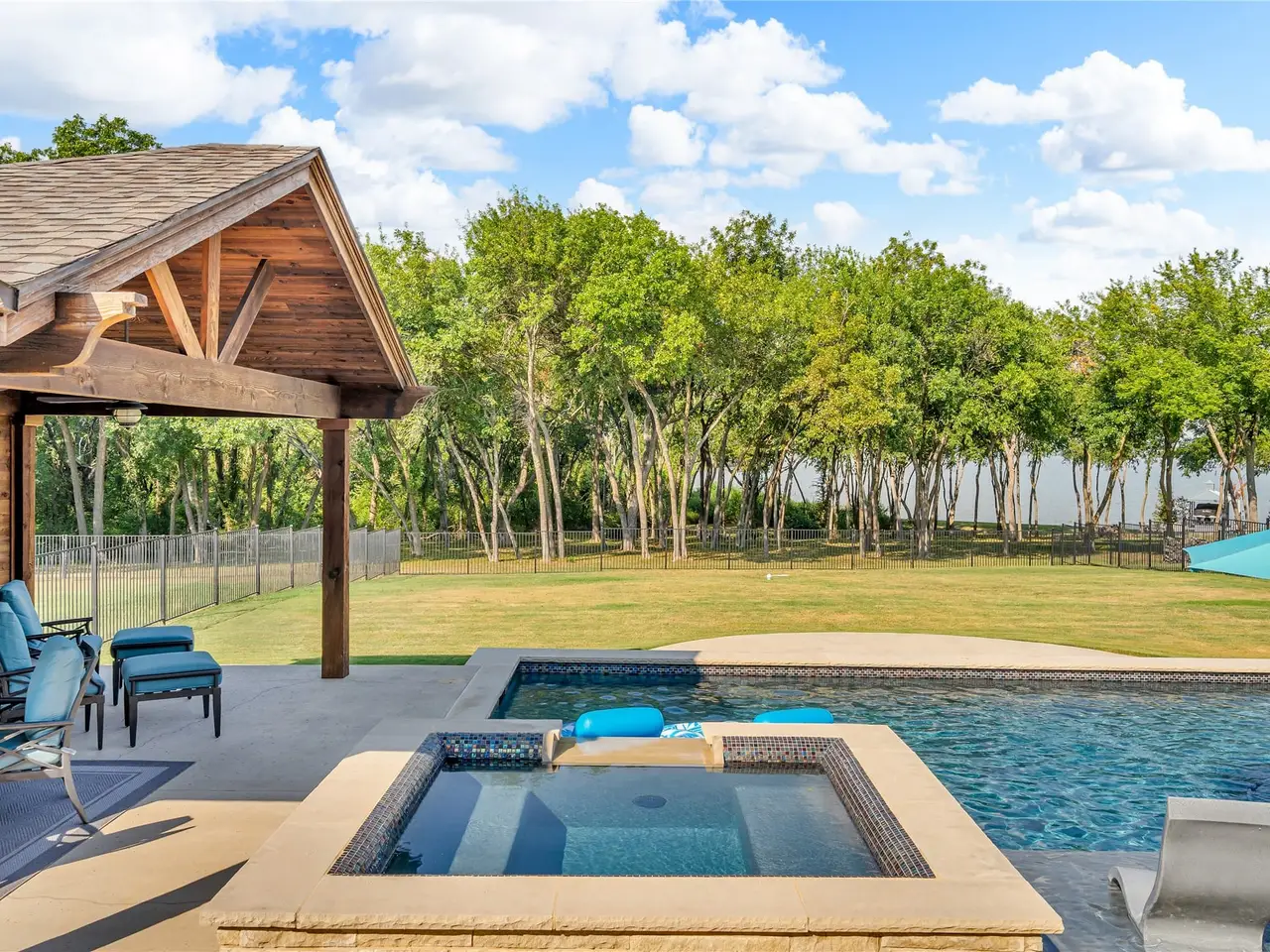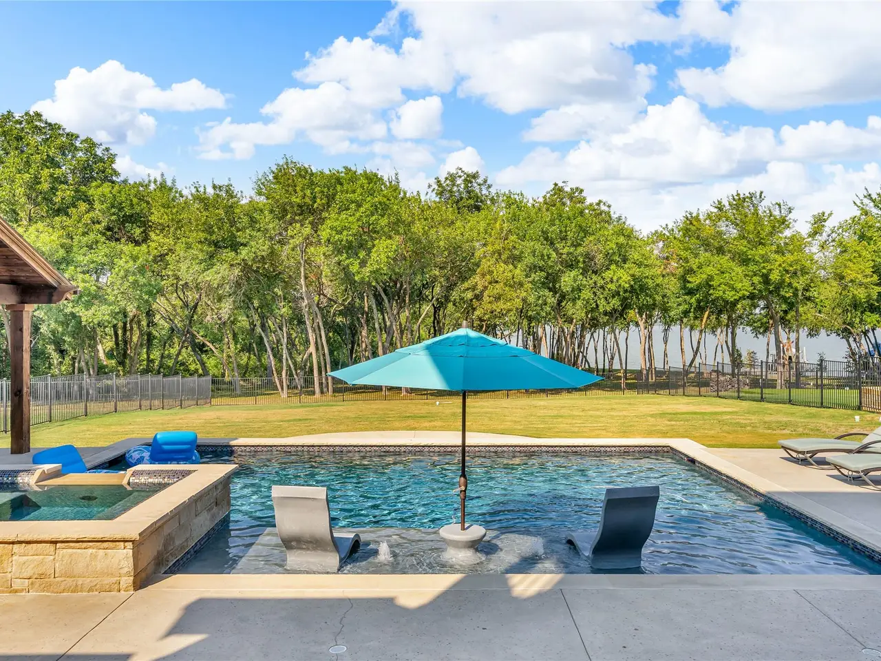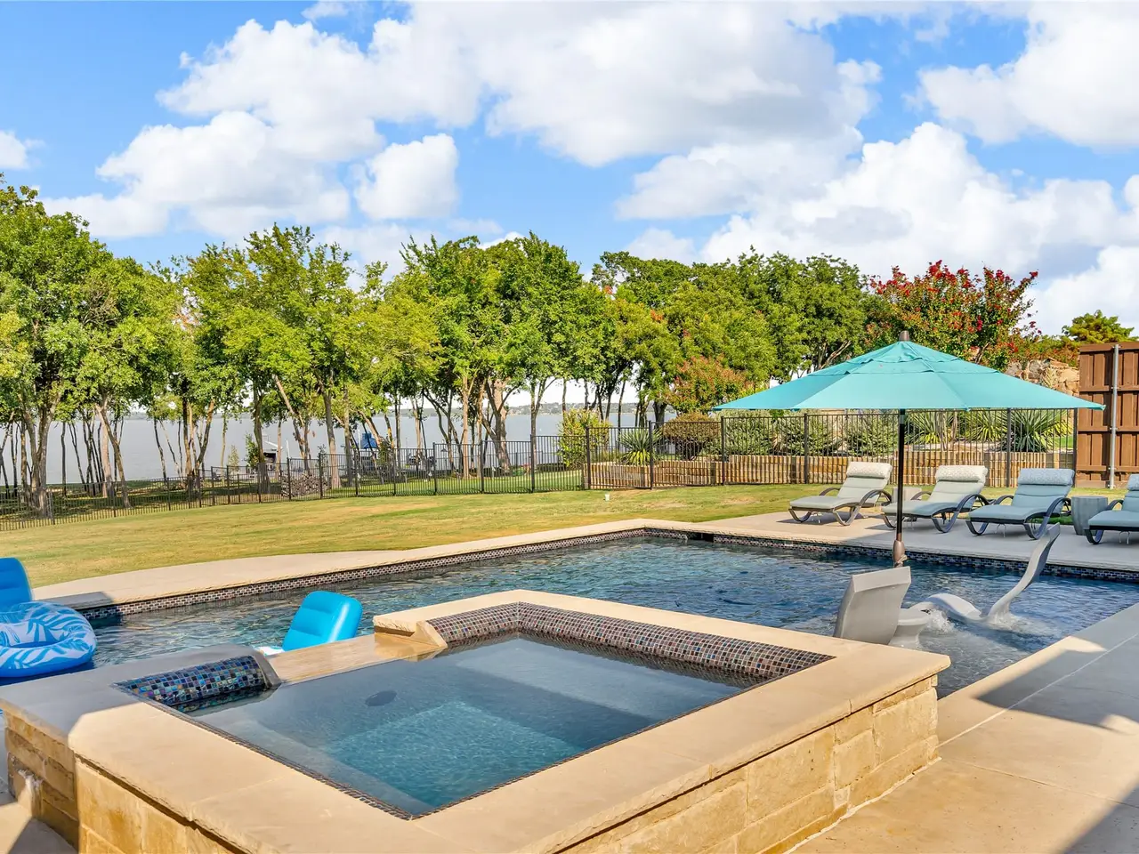 Resort-style backyard with saltwater pool, spa, and water features