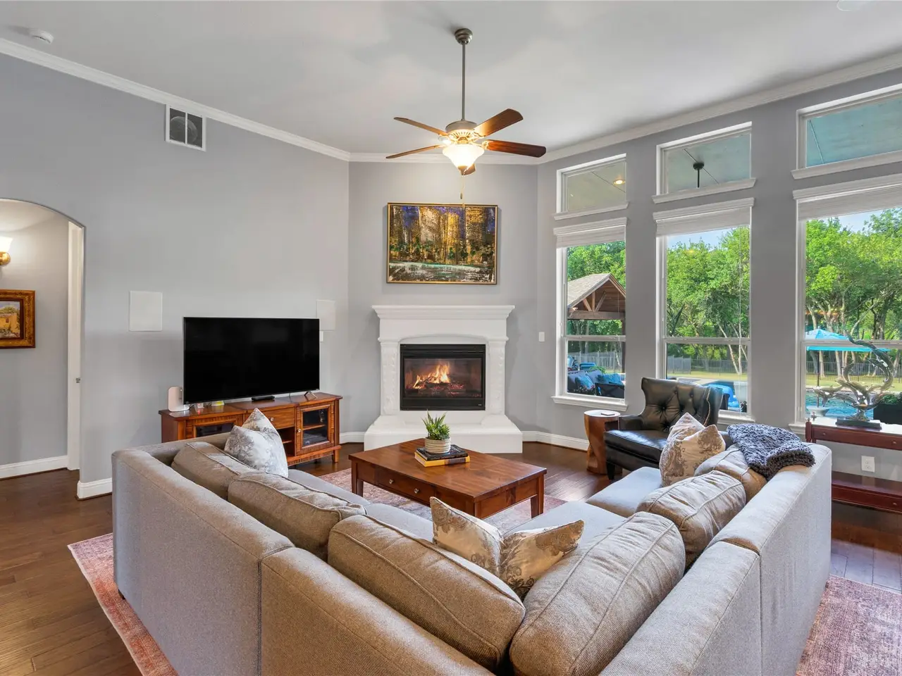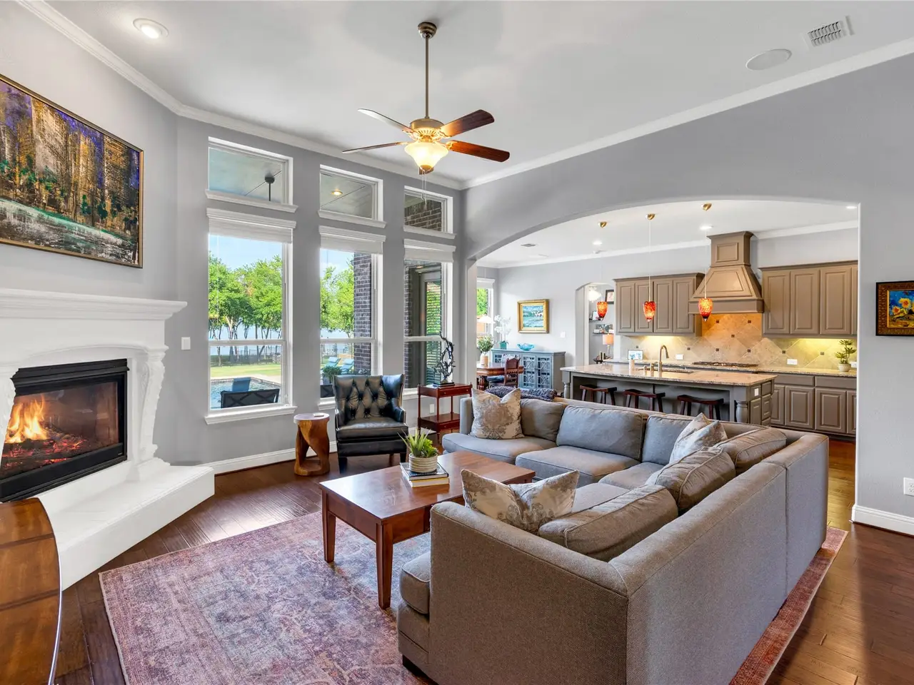 Fireplace in living room with expansive windows