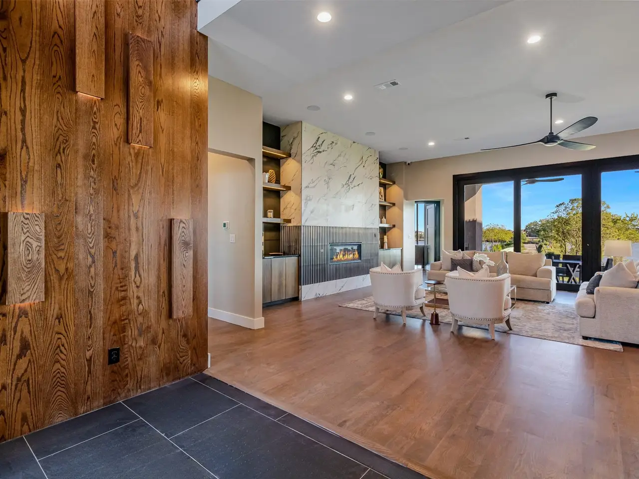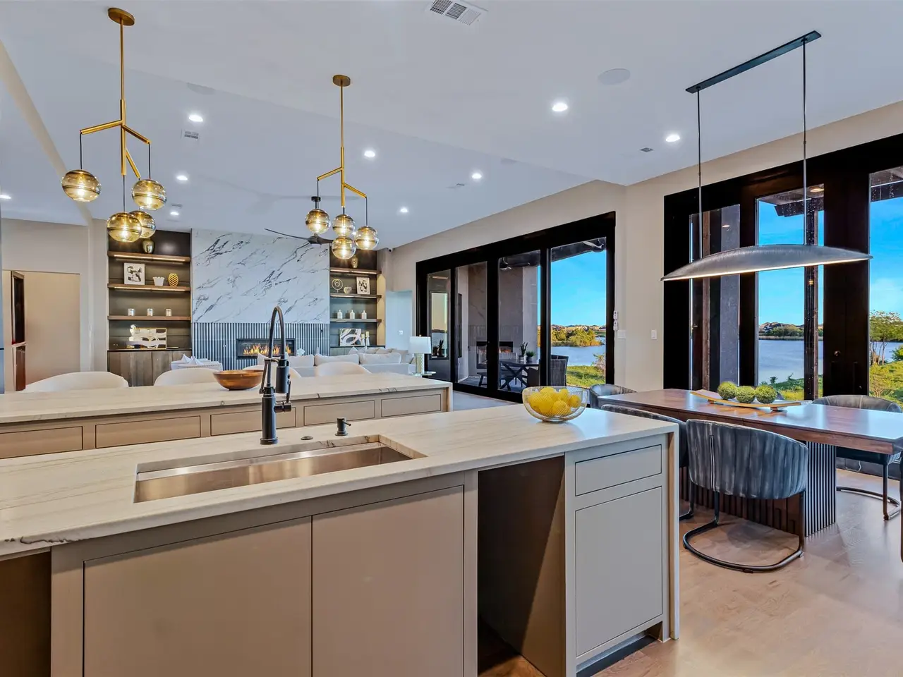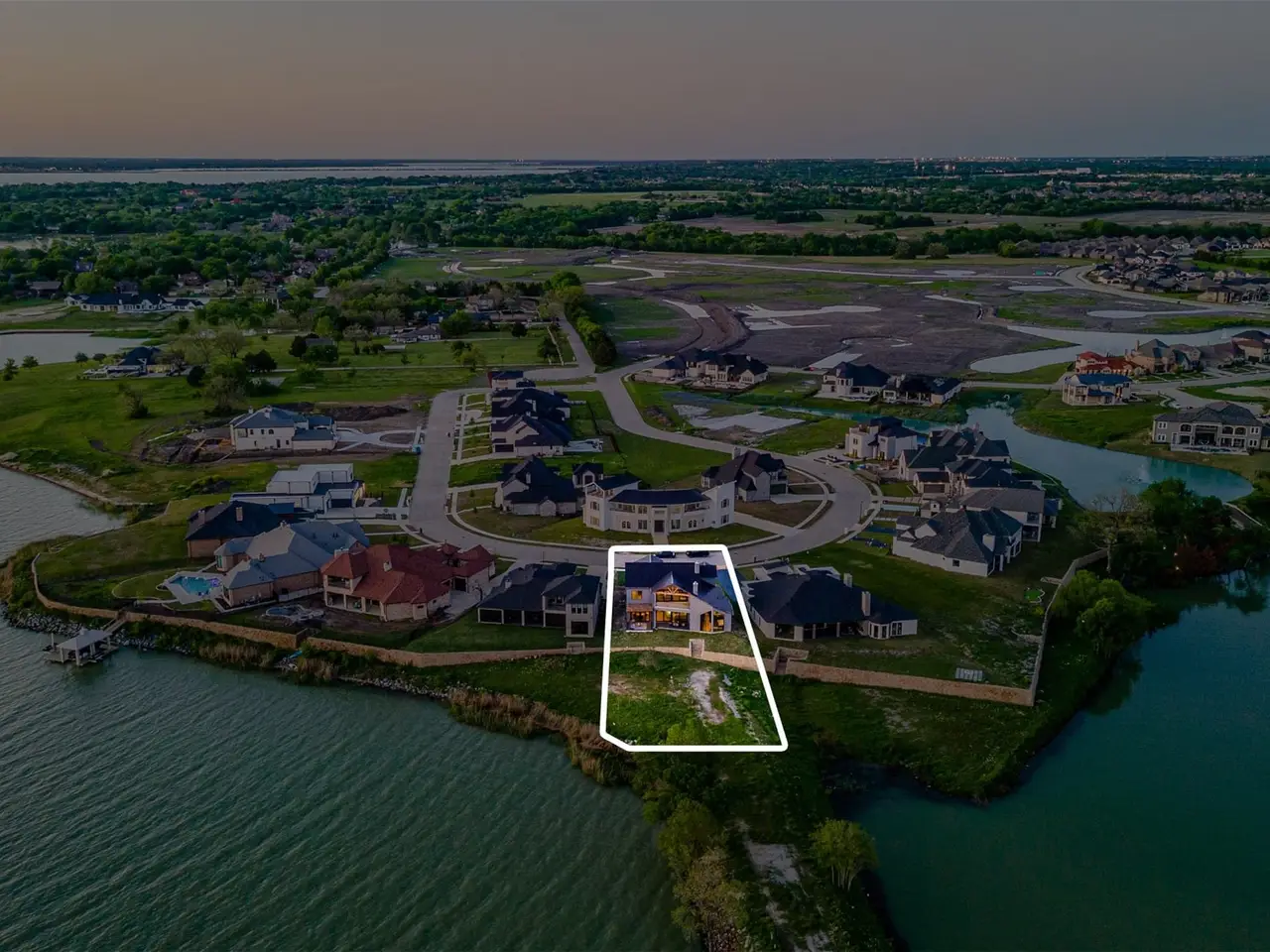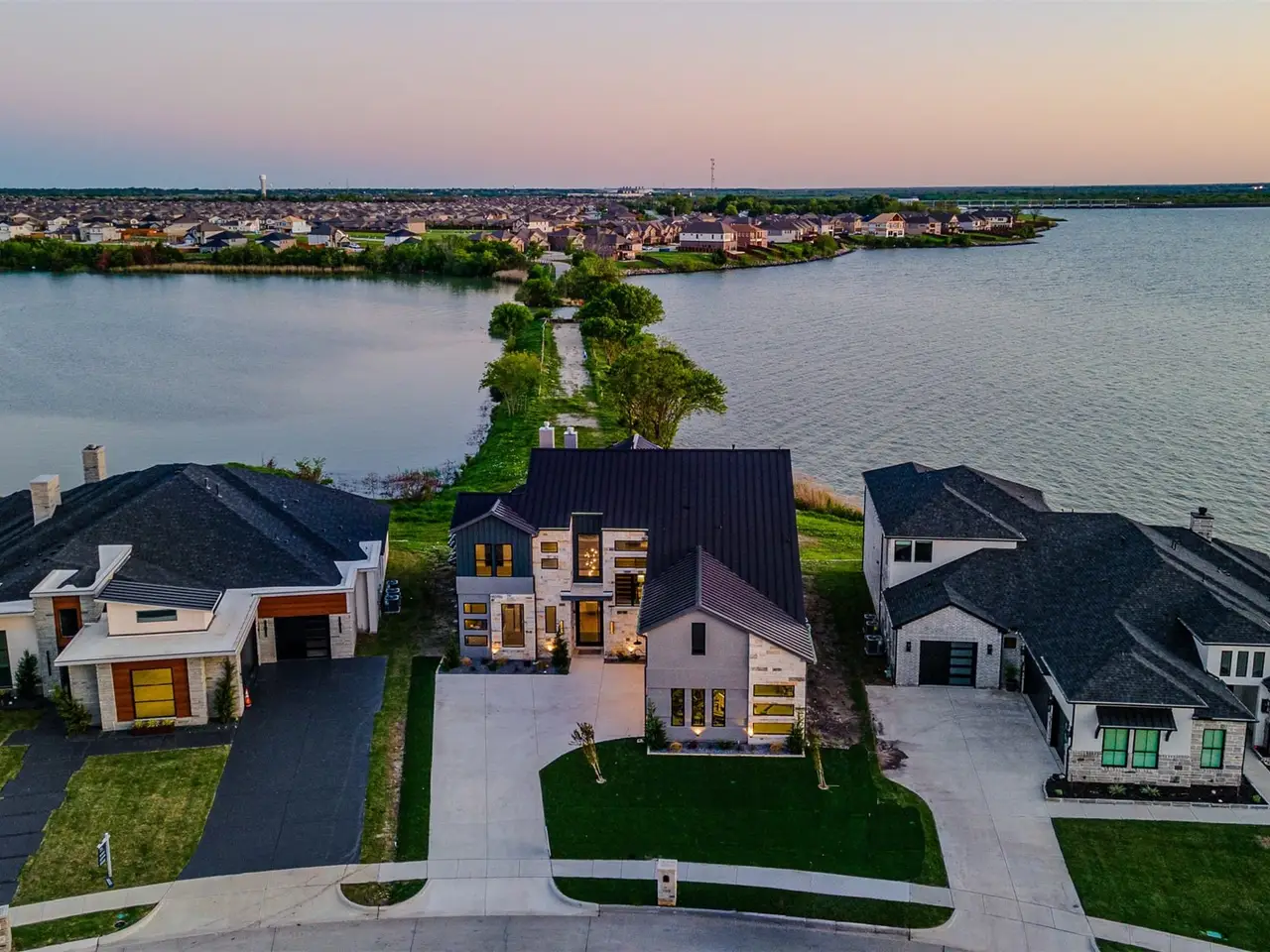 Luxury Lakefront Home, Modern Custom Architectural Design. Private peninsula on Lake Ray Hubbard with enough shoreline for a boathouse. Bespoke designer finishes throughout including Ivory Macabus quartzite countertops, European oak wood and large format slate tile floors, designer lighting and 12-foot ceilings throughout. Immediately walking into the grandeur of the open concept living space, dining room, and kitchen the stunning 12' sliding iron doors with floor to ceiling windows envelop you into this luxury lake home with picturesque views of Lake Ray Hubbard. Enjoy the peaceful tranquility of these waterfront views from the master bedroom which features cathedral ceilings, ensuite bath with walk-in dual shower, freestanding soaking tub, custom closet system, quartz countertops and dual sinks. Upstairs the spacious loft perfectly suited for both a media room and game room feature sliding glass door system open to the balcony where you can enjoy watching the sunset sailing regatta.