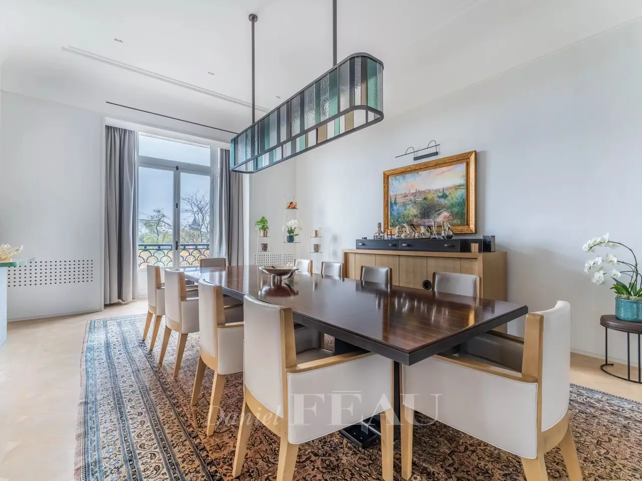 Boulevard Maurice Barrès. This beautifully appointed 380 sqm apartment occupying the whole 3rd floor of a fine 1930s building with a caretaker has been renovated throughout by a renowned interior decorator. Fully south-facing and commanding a magnificent view of the woods, it includes a triple living/reception room with a fireplace, a study, a kitchen with dining facilities and a pantry, a utility room, and three suites including a master. With several fitted closets. With a cellar and a double lock-up garage. A 20 sqm studio apartment on the sixth floor may be acquired for a further 220000€.