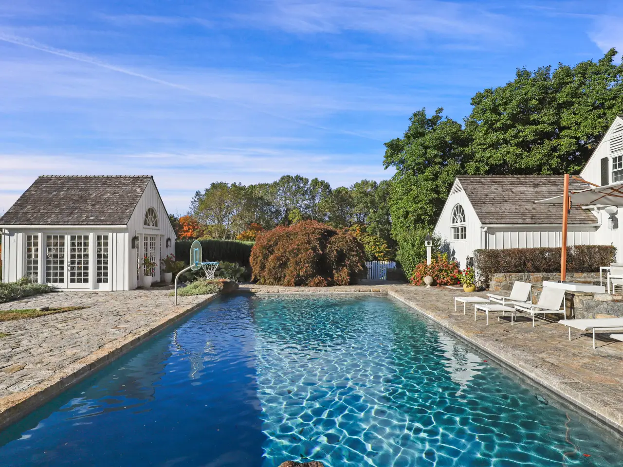 Skyland Farm. Set on one of the most prestigious country lanes, this Bedford estate sits on over 25 acres of spectacular property with rolling land, scenic views and gorgeous landscape. The up-to-the minute, beautifully executed 5 bedroom main residence has a spectacular great room as its focal point with a fieldstone fireplace, barn beam ceilings and an open style designer kitchen extending to both dining and lounging areas. Two bedroom guest cottage, pool, pool house, tennis court, gym house, art studio, sports barn, 5 stall barn with wash stall and tack room, riding ring, paddocks, greenhouse and garaging for 4 cars make this one of the most compelling offerings in the area. The beautiful primary suite includes a walk-in dressing closet, wet bath with rain shower, soaking tub, dual sinks and adjacent paneled library/study with fireplace, office and French doors to the pool. Sophistication and style is evidenced throughout the estate. The property is on the BRLA for amazing walking and riding and is less than 1 hour to NYC.