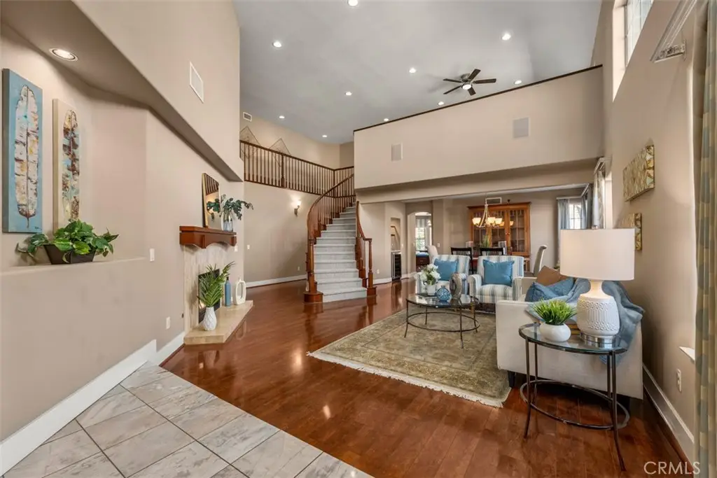 Welcome to Fairmont Terrace, a gated community offering privacy and convenience. This spacious 4 bedroom home, 3 baths with a loft and three-car garage showcases an open floor plan with thoughtful upgrades throughout. The main level features a bedroom and bath, perfect for guests or multigenerational living. Enjoy gatherings in the living room with a custom-tiled fireplace and wood mantle, a formal dining room with a dry bar and wine fridge, and a family room complete with fireplace, built-ins, and French doors that open to the backyard retreat. The remodeled chef's kitchen boasts custom cabinetry, granite countertops, designer tile backsplash, stainless steel appliances including a Wolf six-burner cooktop, built-in Sub-Zero refrigerator, Sharp drawer microwave, walk-in pantry, and a cozy breakfast nook. Upstairs, a versatile loft with ceiling fan complements two secondary bedrooms and the luxurious primary suite, featuring vaulted ceilings, dual closets including a custom walk-in, and a spa-like bath with quartz countertops, soaking tub, walk-in shower, and light-up mirrors. Step outside to a private oasis with a saltwater pool and spa with waterfall accents, fire pit, and plenty of room to relax or entertain. Additional highlights include: steamer shower downstairs, interior laundry, surround sound, water softener and reverse osmosis system, updated HVAC upgrade, Lenox furnace/AC/ducting, new carpet, vinyl flooring, garage with built-in cabinets, Generac 24w generator and two EV chargers. Ideally located within the award-winning Plac/Yorba Linda school district and walking distance to parks and schools, this home combines elegance, function, and lifestyle in one perfect package. Your home search is over!