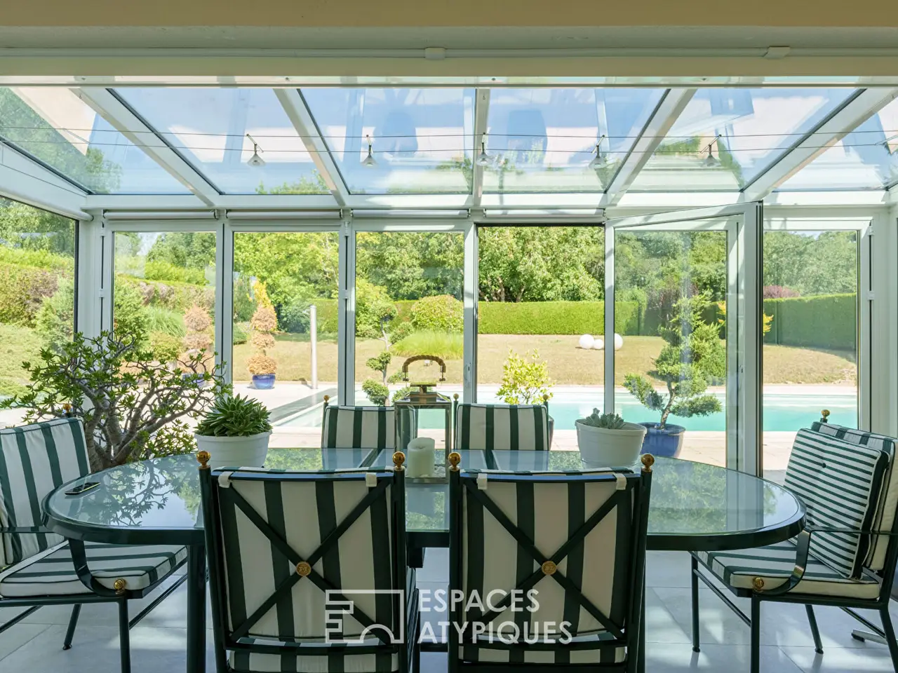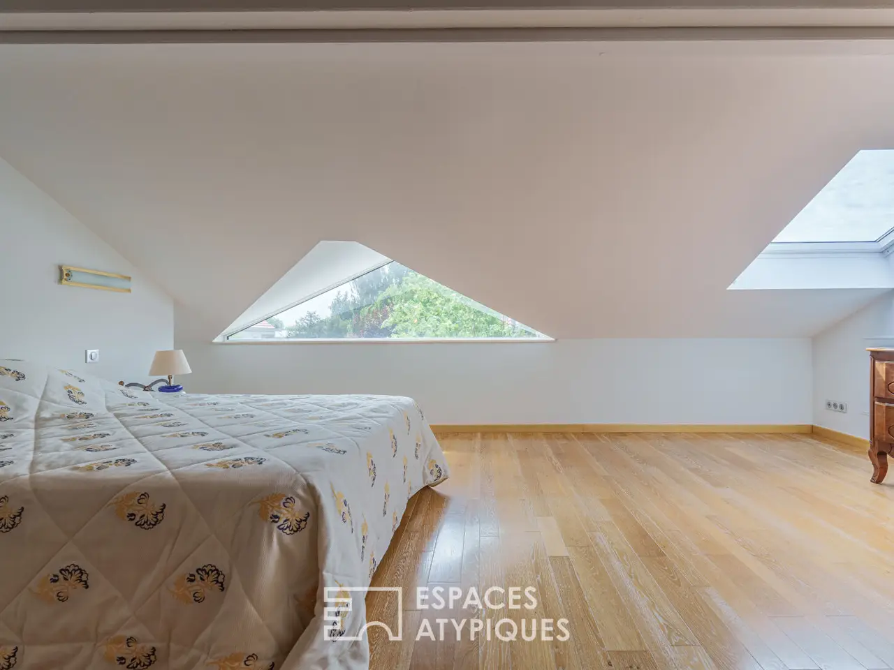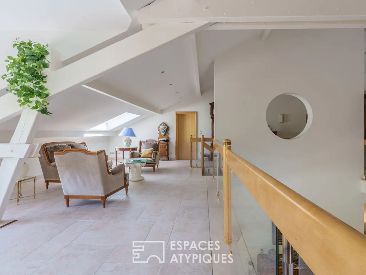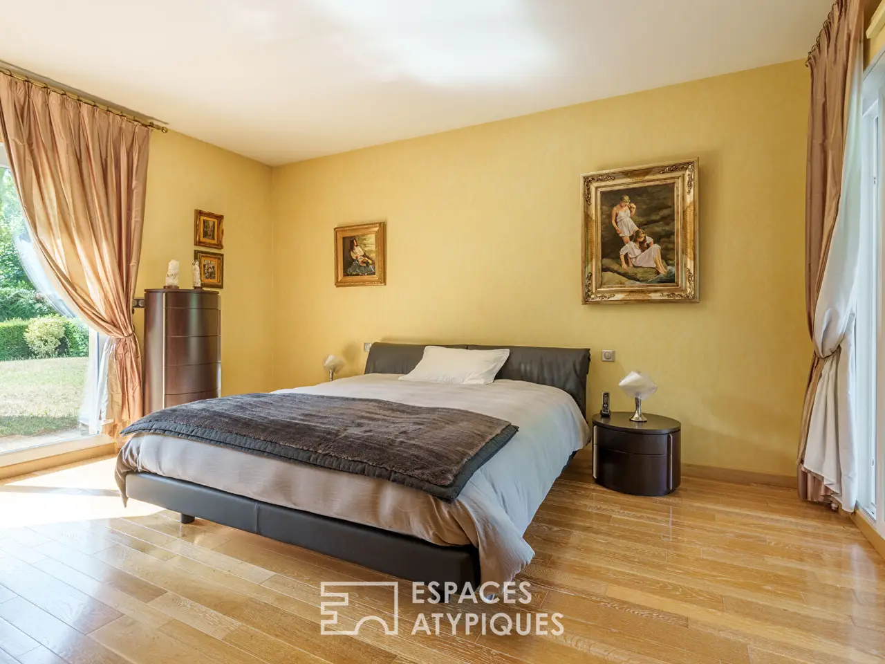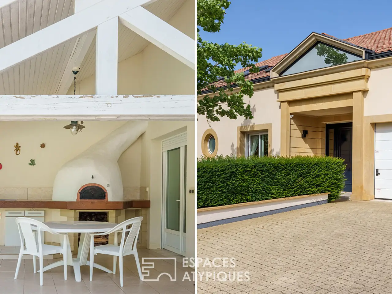 Located in the sought-after town of Sainte-Ruffine, just ten minutes from Metz city centre, this architect-designed house, built by Atelier 3 in the 2000s, offers 376 m2 of living space on a 15-acre wooded plot. Built in a quiet neighbourhood on the edge of a forest, it enjoys a privileged setting and a layout designed to combine comfort, generous volumes and harmonious outdoor living. Its landscaped garden, 12×5 swimming pool with roller shutter, veranda and high-end materials make it a truly unique property.The ground floor opens onto a spacious entrance hall leading to all the rooms.The night wing comprises a study, a bathroom with a spa bath and shower, and a bright bedroom with bay windows. A corridor with a custom-made dressing room connects these rooms seamlessly. The living area is centred around a living room with 7-metre-high ceilings, a dining room and a separate, fully fitted and equipped kitchen. These rooms open onto a light-filled veranda. The ground floor also includes a laundry room, direct access to a double garage and a single garage.The marble staircase leading to the first floor opens onto a mezzanine with a private terrace overlooking the garden and forest. This leads to a large multipurpose room and a second adjoining room, two bedrooms and a half-level room that can be used as a dressing room or office. The first floor is completed by a shower room.Outside, the house is set in lush green surroundings. The generously sized swimming pool opens onto a terrace, ideal for relaxing. A summer kitchen with a wood-burning oven extends the reception areas. The carefully maintained garden provides a beautiful continuity between the house and nature. A utility room completes the outdoor facilities. The house benefits from its close proximity to schools, shops and sports facilities in the Metz metropolitan area.With its distinctive architecture, high-end amenities, impressive volumes and sought-after location, this family home will appeal to property enthusiasts looking for space, tranquillity and uniqueness.Shops 4 minutes away by carNursery and primary schools 5 minutes away on footMotorway access 7 minutes away by carREF. 562Additional information* 8 rooms* 4 bedrooms* 2 bathrooms* 1 bathroom* Outdoor space : 1489 SQM* Parking : 5 parking spaces* Property tax : 3 500 €Energy Performance CertificatePrimary energy consumptionc : 122 kWh/m2.yearHigh performance housing*A*B*122kWh/m2.year25*kg CO2/m2.yearC*D*E*F*GExtremely poor housing performance* Of which greenhouse gas emissionsc : 25 kg CO2/m2.yearLow CO2 emissions*A*B*25kg CO2/m2.yearC*D*E*F*GVery high CO2 emissionsEstimated average annual energy costs for standard use, indexed to specific years 2021, 2022, 2023 : between 3940 € and 5380 € Subscription IncludedAgency feesThe fees include VAT and are payable by the vendorMediatorMediation Franchise-Consommateurswww.mediation-franchise.com29 Boulevard de Courcelles 75008 ParisInformation on the risks to which this property is exposed is available on the Geohazards website : www.georisques.gouv.fr