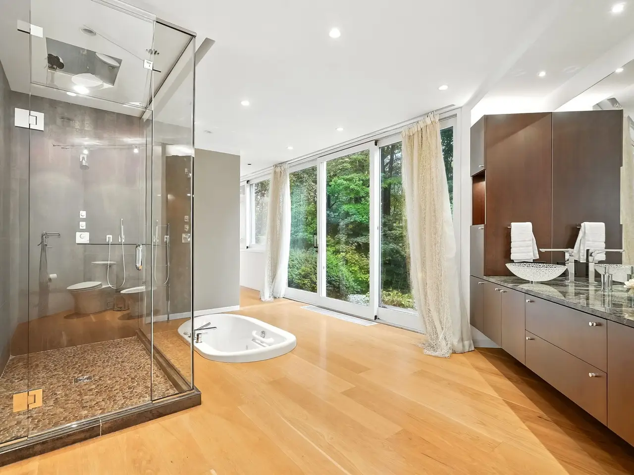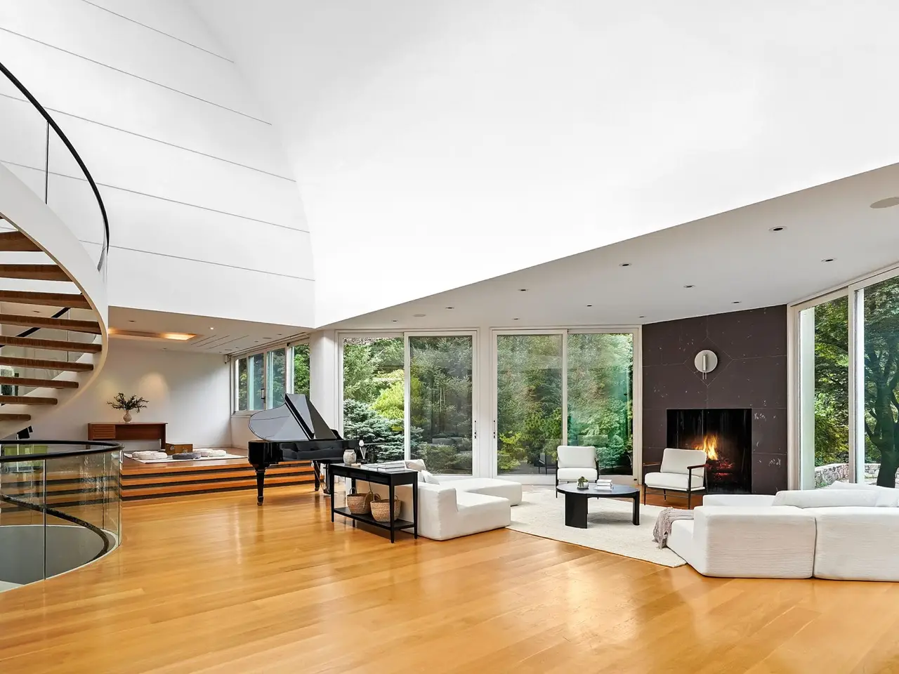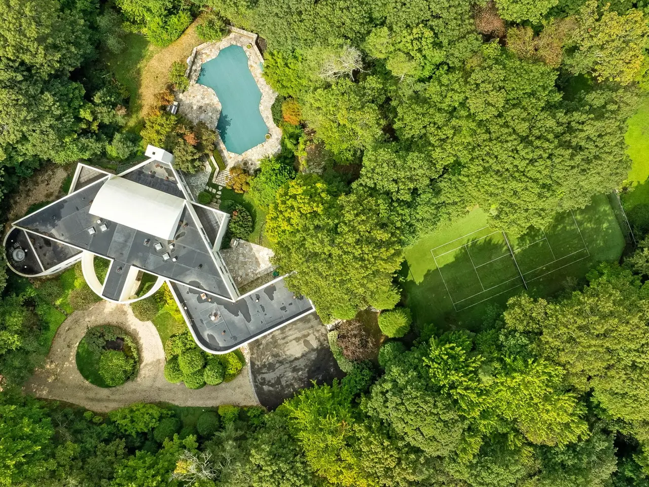 Nestled in breathtaking natural surroundings, this modern architectural masterpiece by renowned designer Myron Goldfinger offers three levels of striking contemporary design. The residence features a soaring three-story curved ceiling, a dramatic floating staircase, and expansive open-plan living and entertaining spaces that frame the home's private setting. The main-level primary suite provides a serene retreat, while the sleek, state-of-the-art kitchen is ideal for both everyday living and entertaining. Additional highlights include a fitness room, Shoreline pool with cabana, and a private tennis court. A 4+ car attached garage and below-ground oil heating add convenience. Located just 45 minutes from New York City, this one-of-a-kind residence blends luxury, privacy, and timeless modern design.