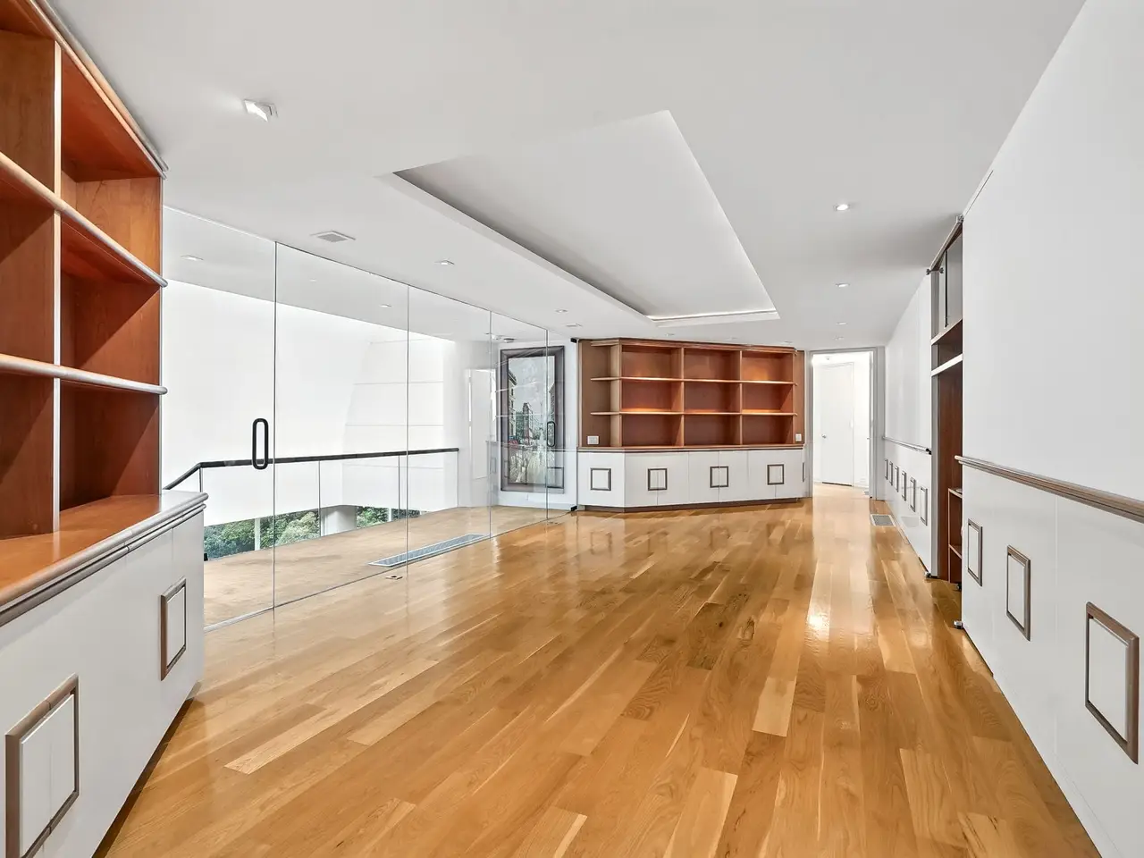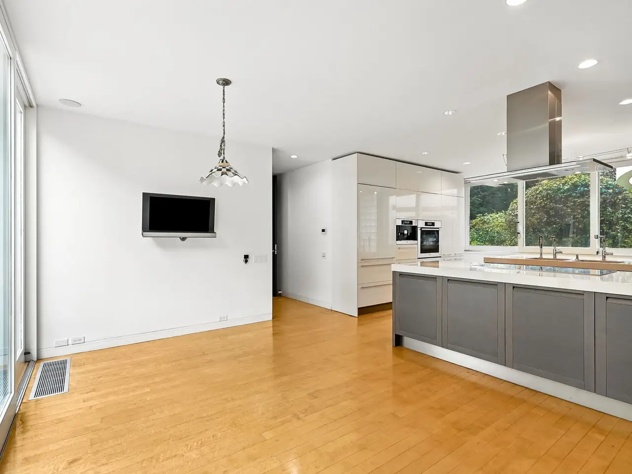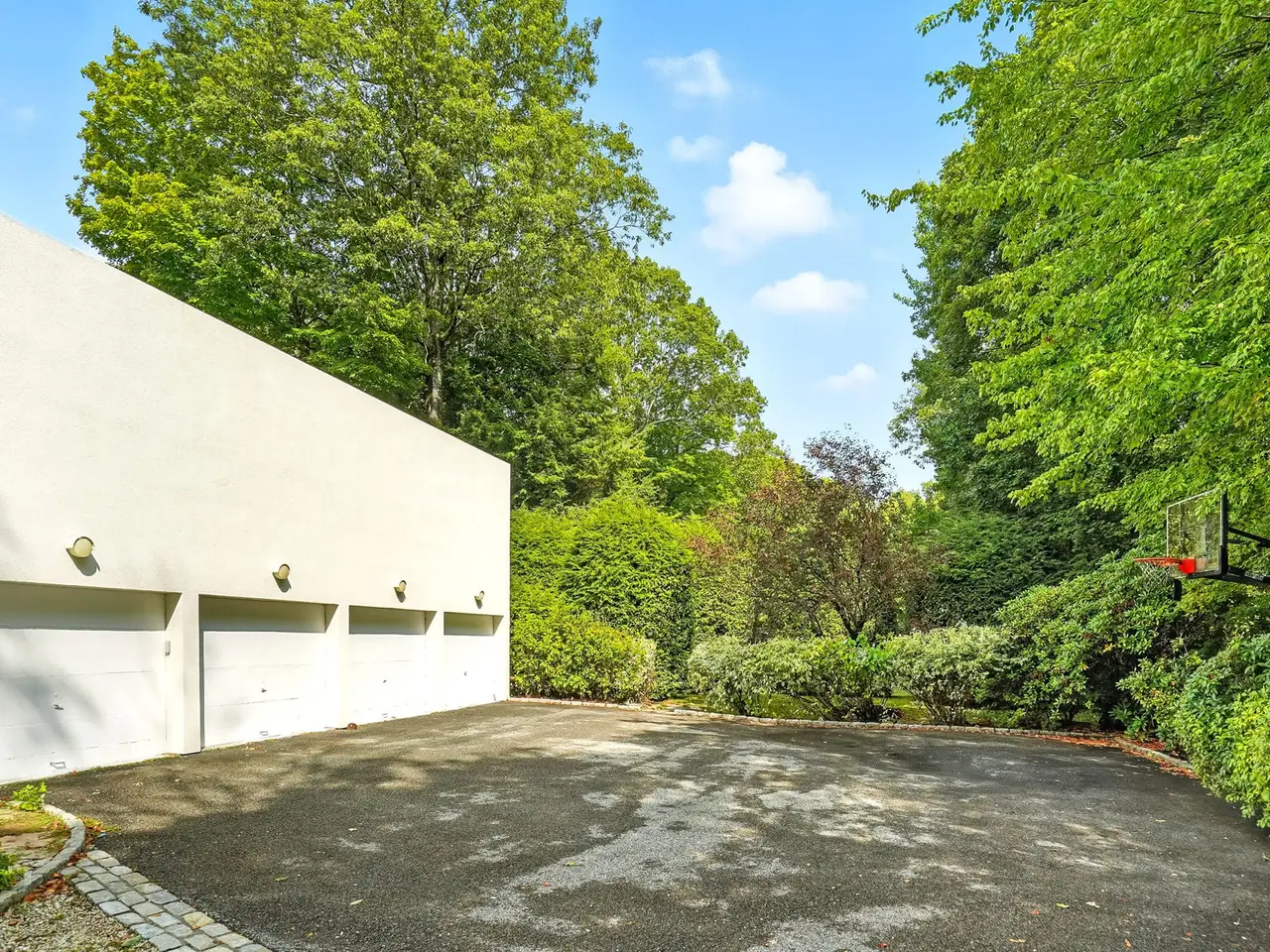 Nestled in breathtaking natural surroundings, this modern architectural masterpiece by renowned designer Myron Goldfinger offers three levels of striking contemporary design. The residence features a soaring three-story curved ceiling, a dramatic floating staircase, and expansive open-plan living and entertaining spaces that frame the home's private setting. The main-level primary suite provides a serene retreat, while the sleek, state-of-the-art kitchen is ideal for both everyday living and entertaining. Additional highlights include a fitness room, Shoreline pool with cabana, and a private tennis court. A 4+ car attached garage and below-ground oil heating add convenience. Located just 45 minutes from New York City, this one-of-a-kind residence blends luxury, privacy, and timeless modern design.