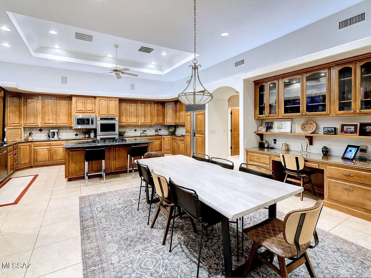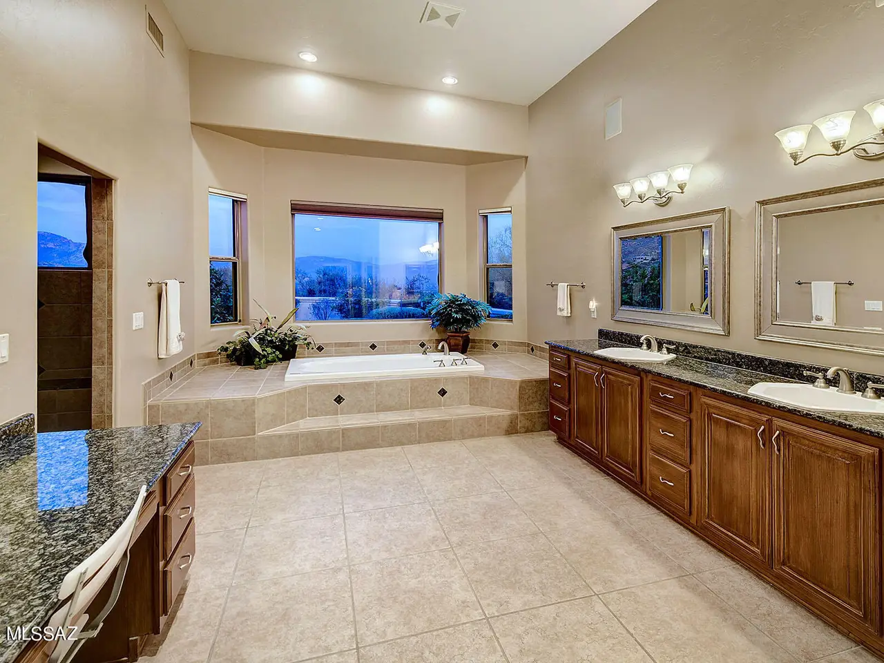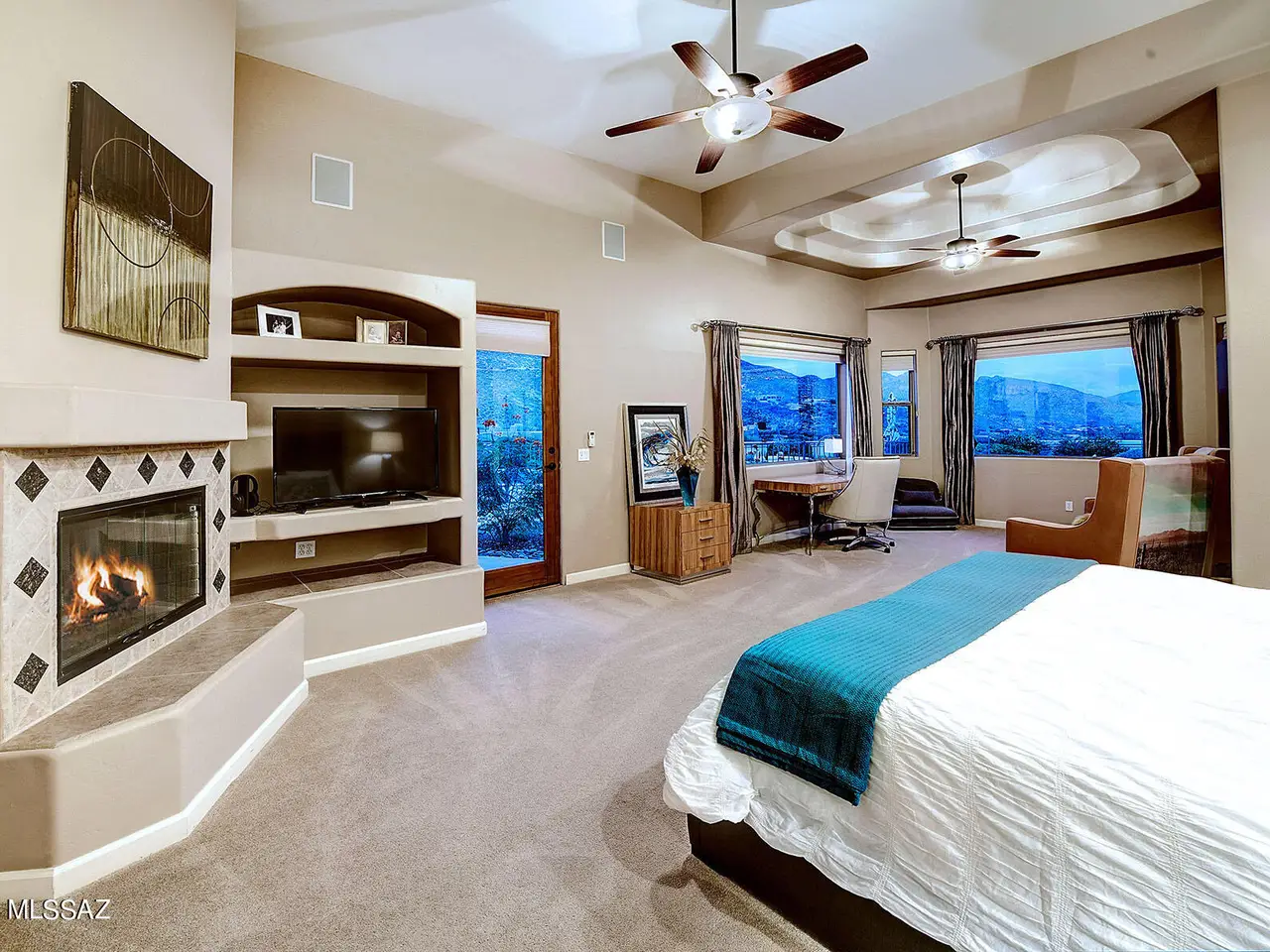 Stunning Mediterranean/contemporary in prestigious, gated Miramist at Ventana in the Catalina Foothills high above Tucson. Located on a cul-de-sac on a 1.45 acre hilltop lot, this 5,735 sq. ft., 5-bedroom, 5 1/2-bath home offers breathtaking views . . . picture windows focus on the center of Ventana Canyon itself, with views from the Catalina to the Rincon Mountains, of Sabino Canyon and city light views of Tucson. With no interior steps, enter into living room with soaring ceilings, walls of windows, formal dining room, fireplace and wet bar, leading into expansive family room/gourmet kitchen with fireplace, kitchen island granite counters and stainless steel appliances. Gracious primary suite is 17'7'' x 31'11'' with fireplace, dual vanities, generous primary closet and spa tub.
