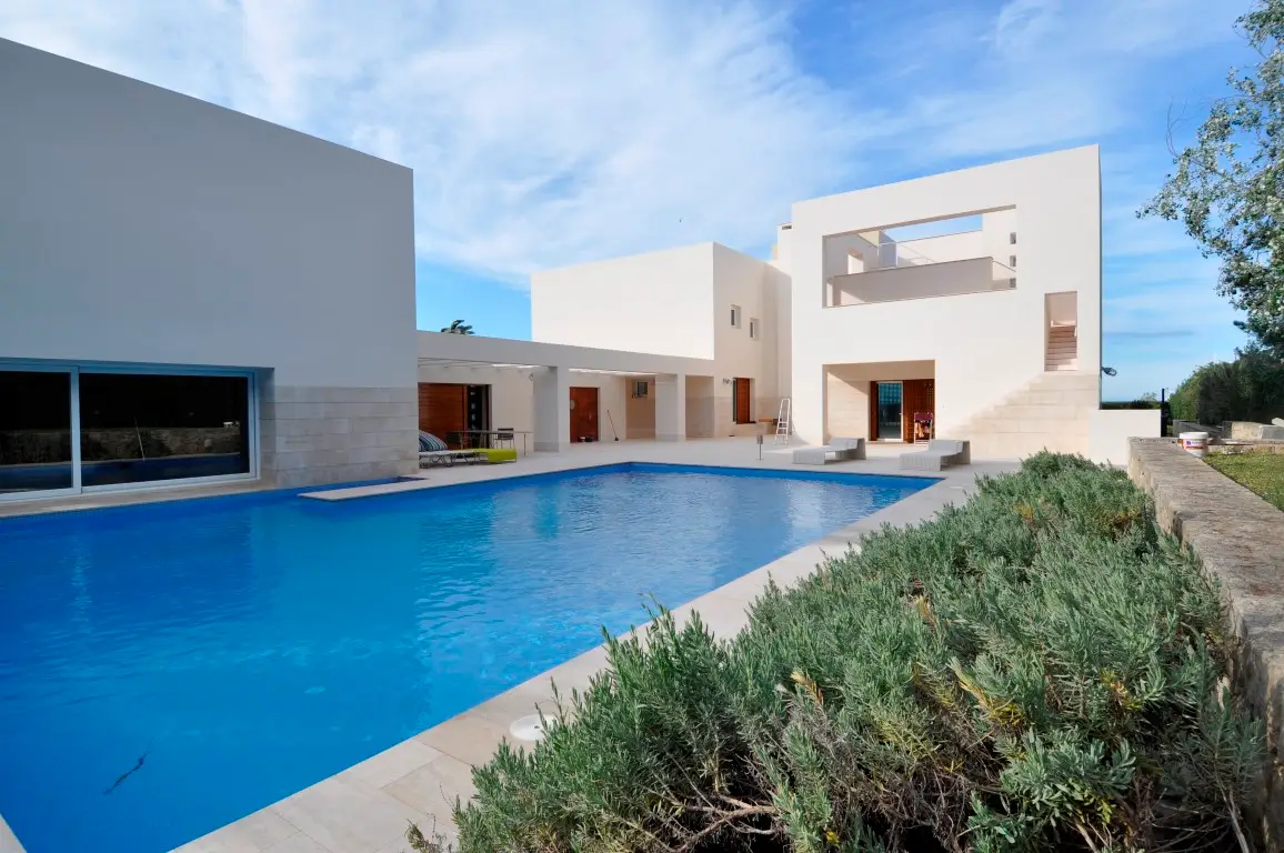 Designed by the prestigious architect Manuel Portaceli, the property has a magnificent style of construction with straight lines and large windows with views, as well as direct access to the sea The two-storey villa has a total area of 719m2 and sits on a spacious plot of 2.893 m2. The ground floor is distributed in a spacious entrance hall, living room with beautiful marble fireplace, large panoramic windows with access to the terrace and garden. It also includes a dining room in the upper part of the living room, a fully equipped design kitchen, a large pantry, a refrigerator, a laundry area with a bathroom and an additional design bathroom. The rest area is on the upper floor to which you can access through a fabulous wooden staircase or the lift. On this floor there are four double bedrooms, all with large windows overlooking the sea and two full bathrooms. The master bedroom includes an en suite bathroom with hot tub and dressing area. Next to the large pool is located the gym and changing rooms with shower. In the front you will find the garden with access to the beach. The villa has marble floors, underfloor heating and air conditioning. In addition, it is completely fenced and has access through electric door with plenty of space to park both in the garage and in the covered parking area. The villa has a privileged location and has been built with high quality materials.