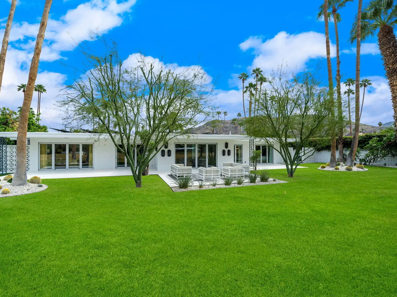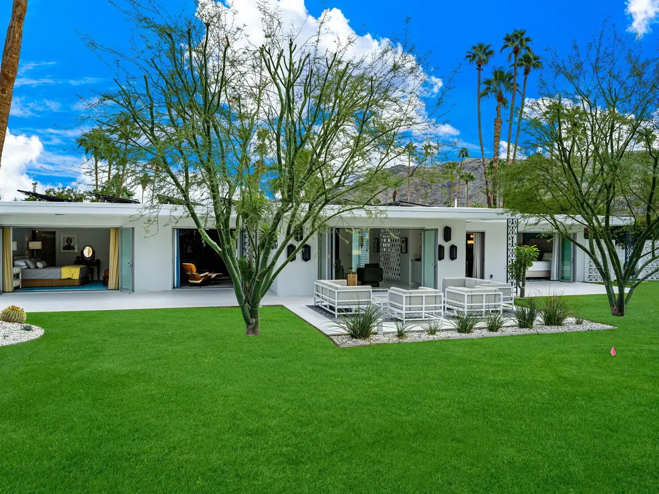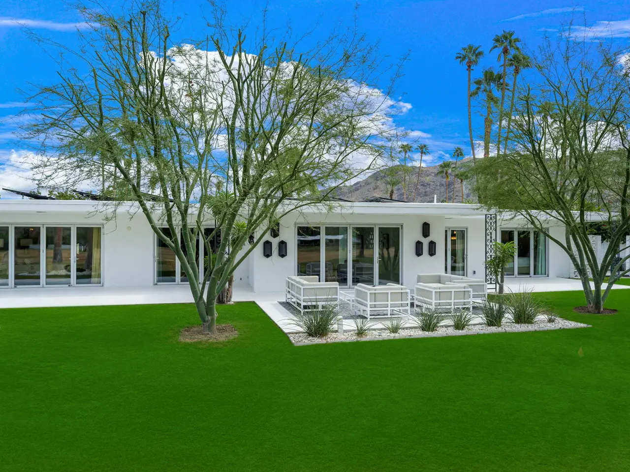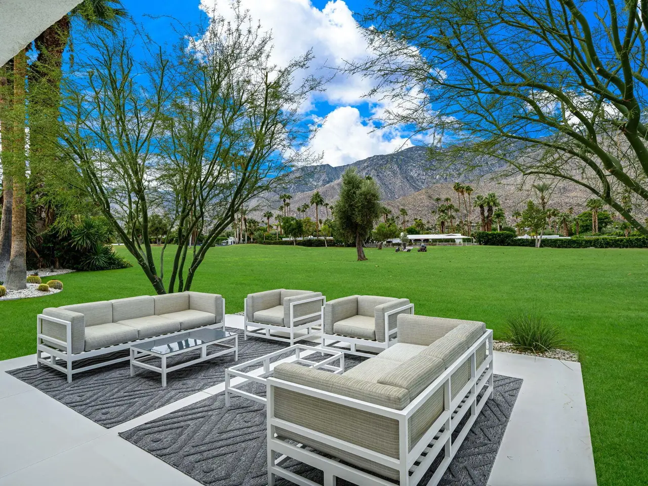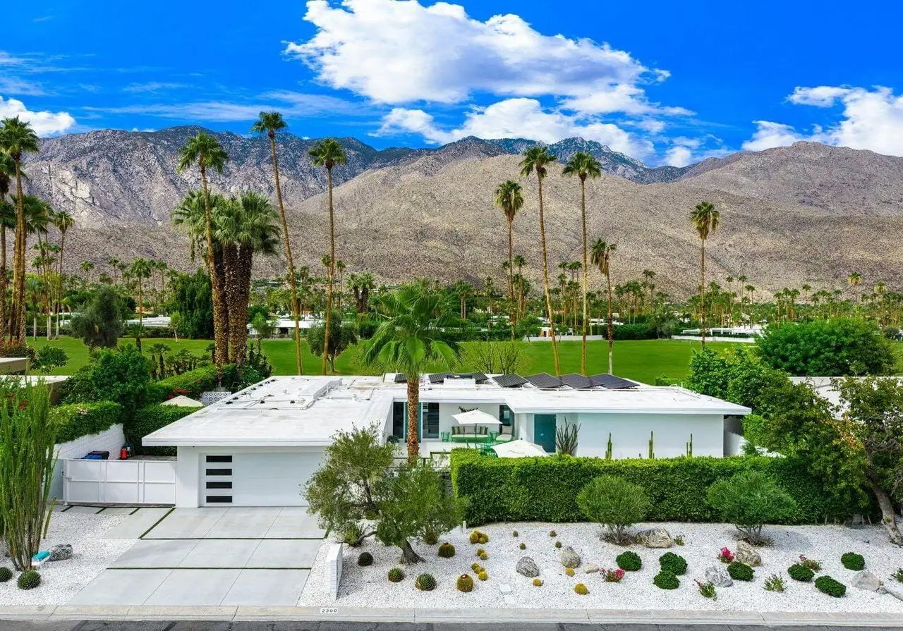 This exceptional midcentury residence is located on the 17th fairway of the Indian Canyons golf course in South Palm Springs, offering 360-degree mountain views. Meticulously remodeled by renowned Palm Springs designer Christopher Kennedy and previously showcased as the Modernism Week Showhouse, this home seamlessly integrates stunning La Cantina folding and pocketing glass doors to frame the spectacular fairway and mountain vistas. The property features multiple elegantly appointed outdoor living areas, including a convenient pass-through window from the kitchen for effortless entertaining. Upgrades include new front gates, a dedicated catering kitchen adjacent to the main social kitchen equipped with Wolf and Sub-Zero appliances, two dishwashers, and premium plumbing fixtures from Dornbracht, Brizio, and Duravit. Additional highlights include designer wall treatments, custom window coverings, bespoke cabinetry in the fully finished garage, a 35-panel owned solar system, automated blinds, and oversized porcelain slabs throughout the exterior spaces. Situated in one of Palm Springs' most desirable neighborhoods, this home exemplifies sophisticated, high-end design.
