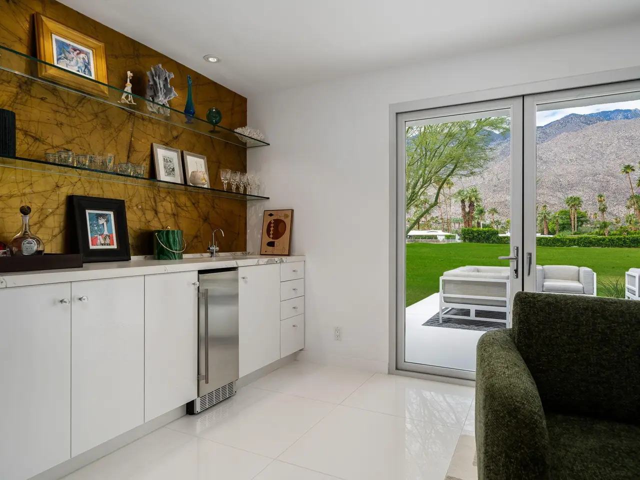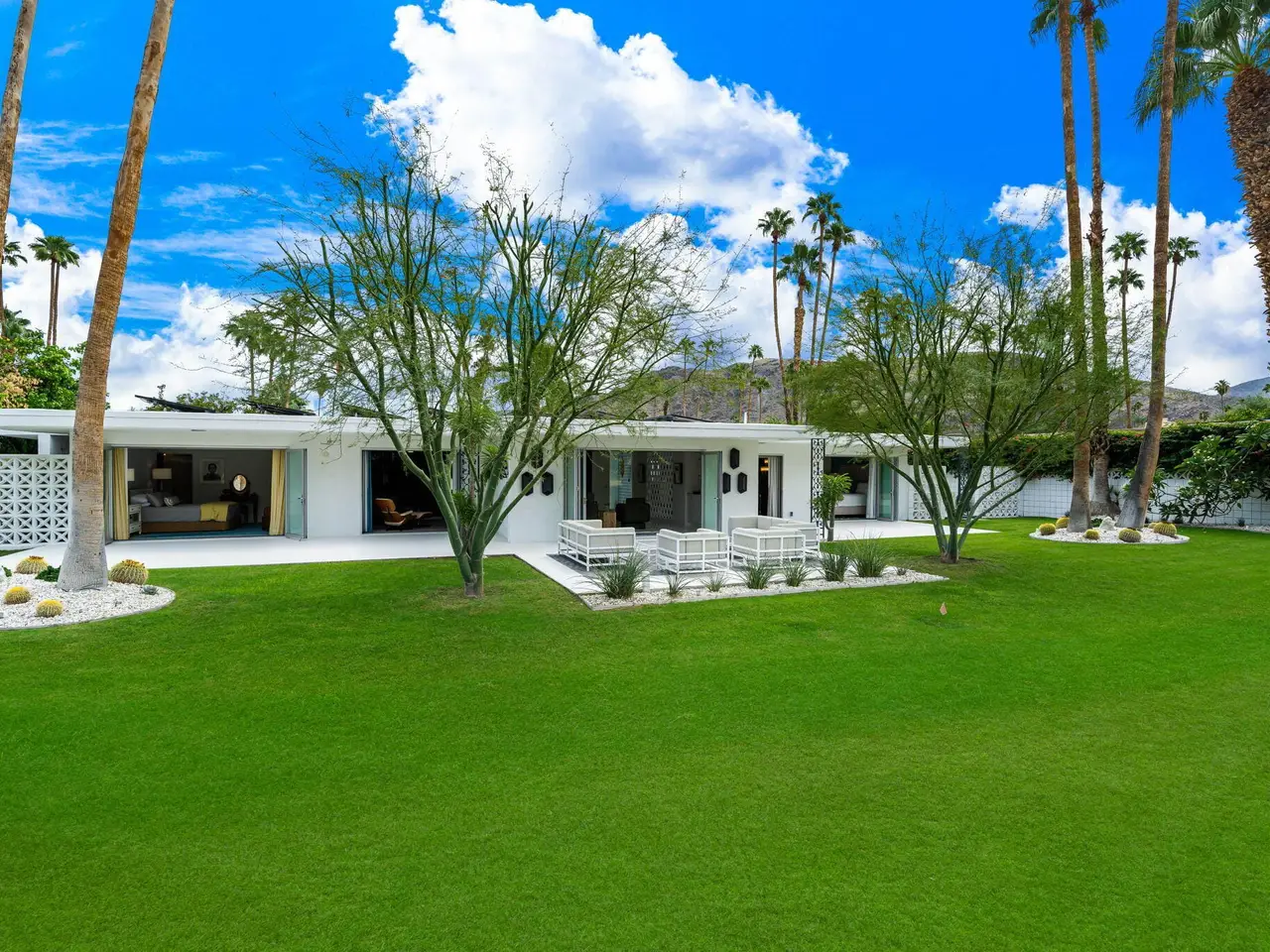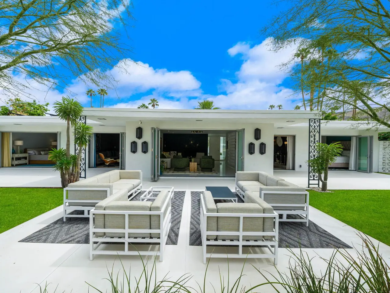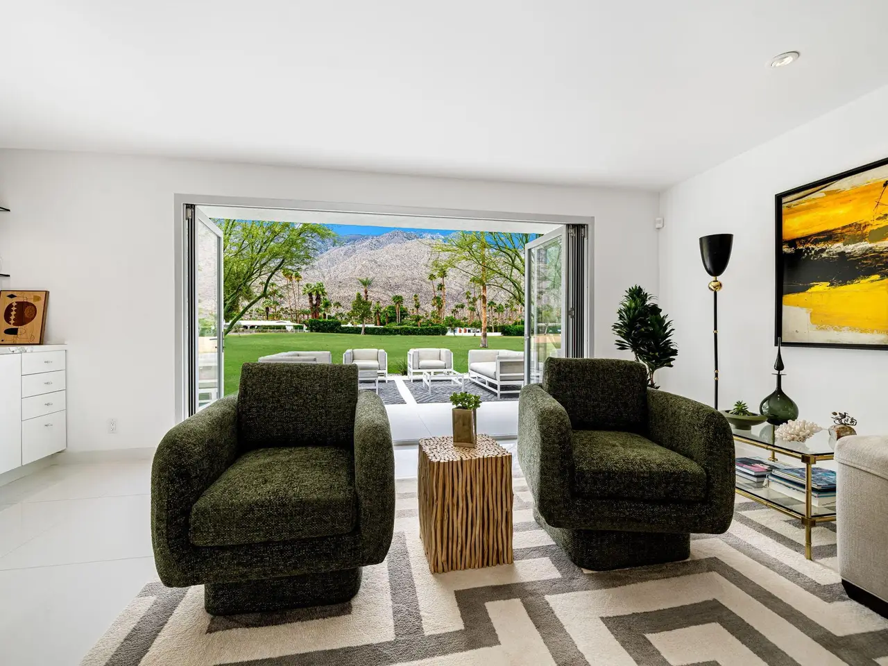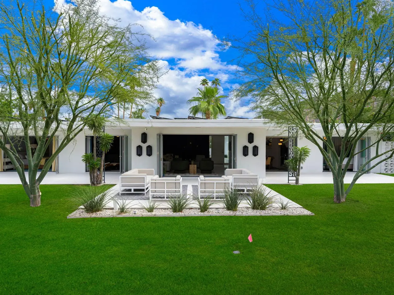 This exceptional midcentury residence is located on the 17th fairway of the Indian Canyons golf course in South Palm Springs, offering 360-degree mountain views. Meticulously remodeled by renowned Palm Springs designer Christopher Kennedy and previously showcased as the Modernism Week Showhouse, this home seamlessly integrates stunning La Cantina folding and pocketing glass doors to frame the spectacular fairway and mountain vistas. The property features multiple elegantly appointed outdoor living areas, including a convenient pass-through window from the kitchen for effortless entertaining. Upgrades include new front gates, a dedicated catering kitchen adjacent to the main social kitchen equipped with Wolf and Sub-Zero appliances, two dishwashers, and premium plumbing fixtures from Dornbracht, Brizio, and Duravit. Additional highlights include designer wall treatments, custom window coverings, bespoke cabinetry in the fully finished garage, a 35-panel owned solar system, automated blinds, and oversized porcelain slabs throughout the exterior spaces. Situated in one of Palm Springs' most desirable neighborhoods, this home exemplifies sophisticated, high-end design.