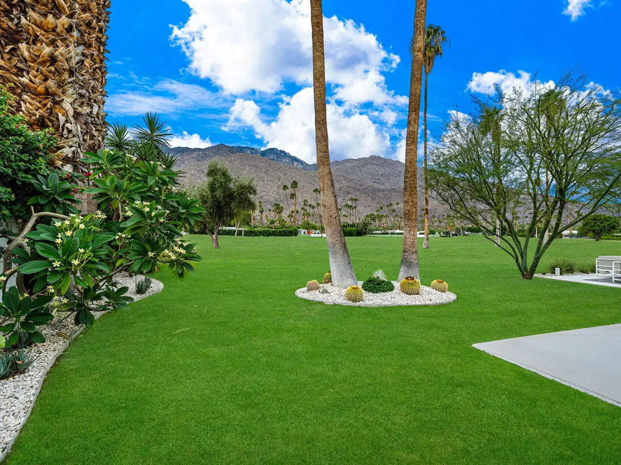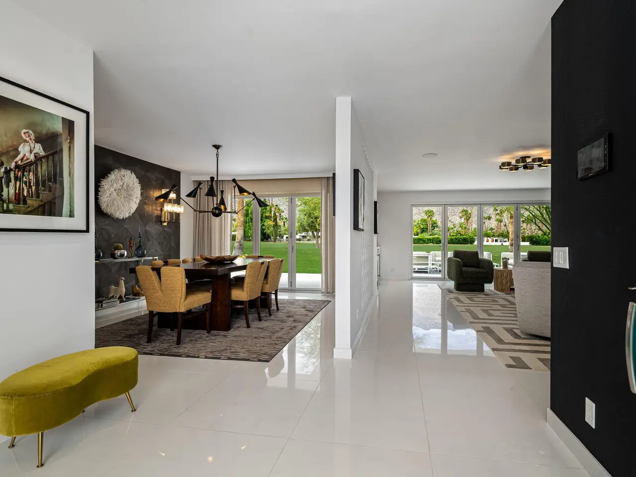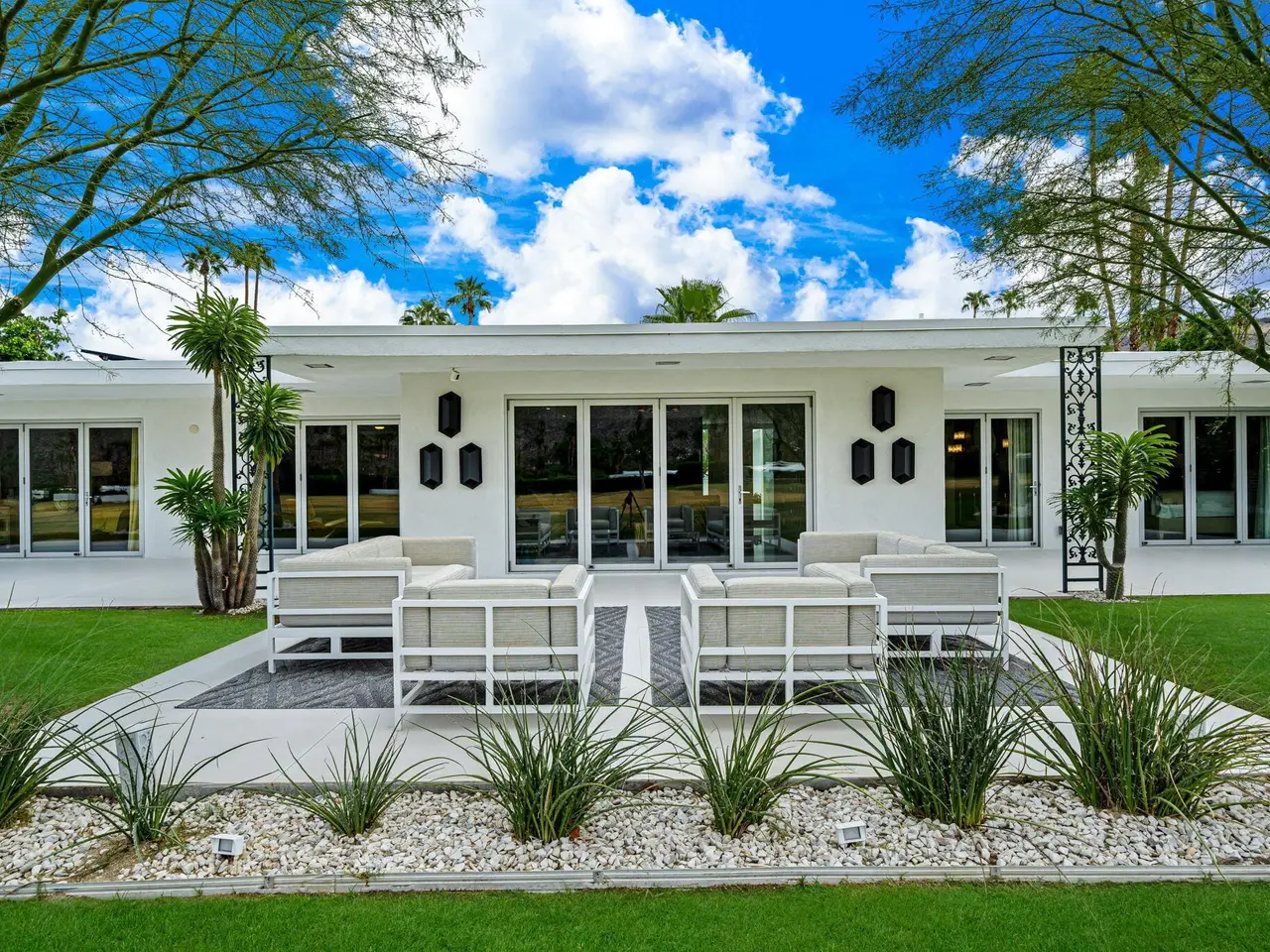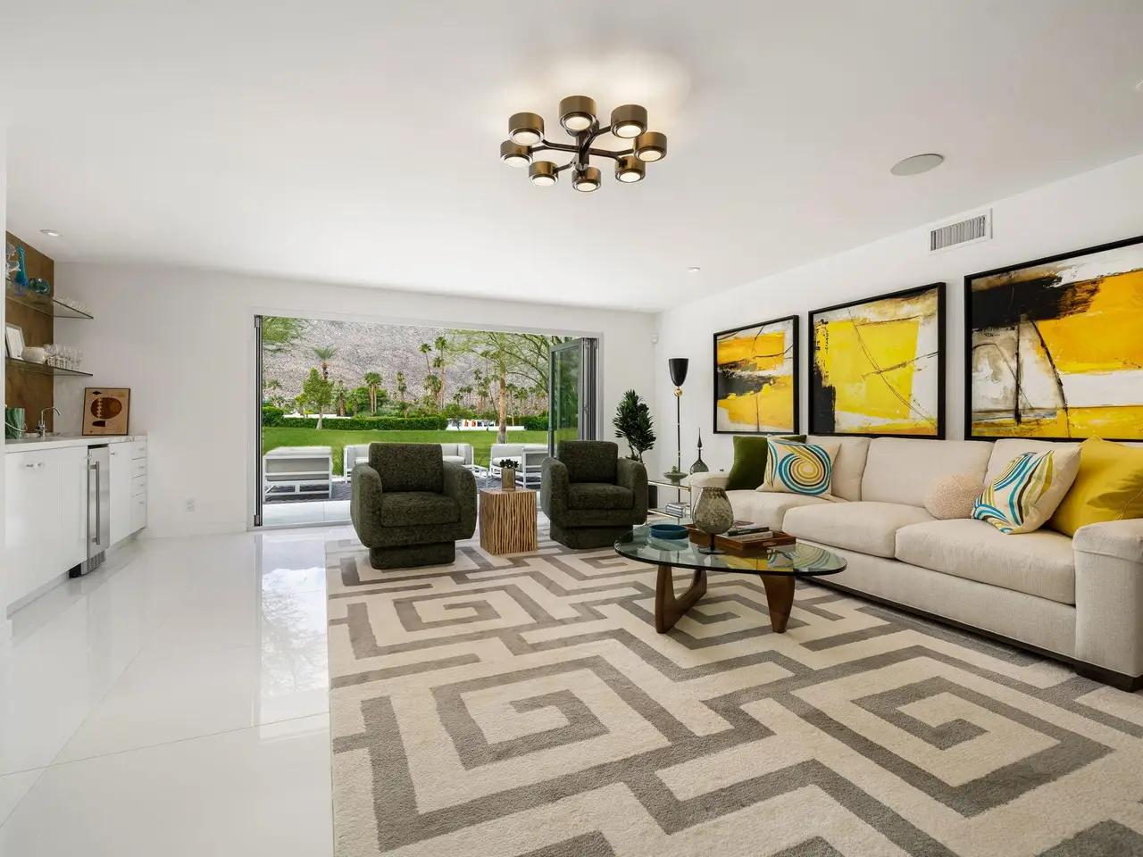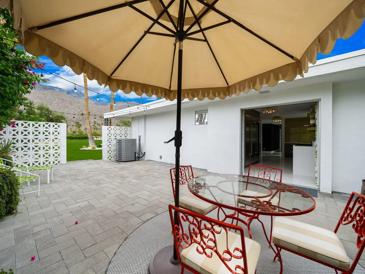 This exceptional midcentury residence is located on the 17th fairway of the Indian Canyons golf course in South Palm Springs, offering 360-degree mountain views. Meticulously remodeled by renowned Palm Springs designer Christopher Kennedy and previously showcased as the Modernism Week Showhouse, this home seamlessly integrates stunning La Cantina folding and pocketing glass doors to frame the spectacular fairway and mountain vistas. The property features multiple elegantly appointed outdoor living areas, including a convenient pass-through window from the kitchen for effortless entertaining. Upgrades include new front gates, a dedicated catering kitchen adjacent to the main social kitchen equipped with Wolf and Sub-Zero appliances, two dishwashers, and premium plumbing fixtures from Dornbracht, Brizio, and Duravit. Additional highlights include designer wall treatments, custom window coverings, bespoke cabinetry in the fully finished garage, a 35-panel owned solar system, automated blinds, and oversized porcelain slabs throughout the exterior spaces. Situated in one of Palm Springs' most desirable neighborhoods, this home exemplifies sophisticated, high-end design.