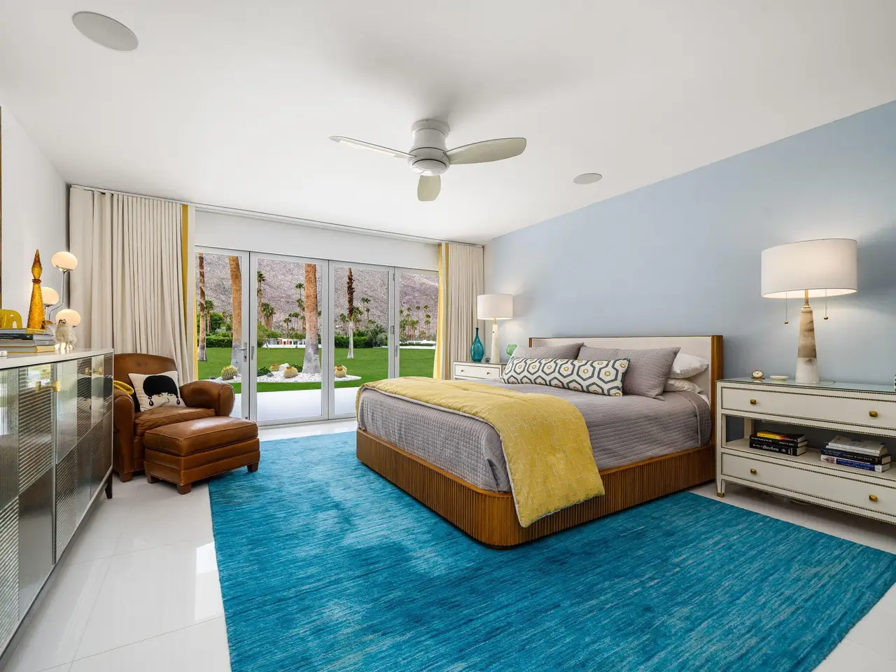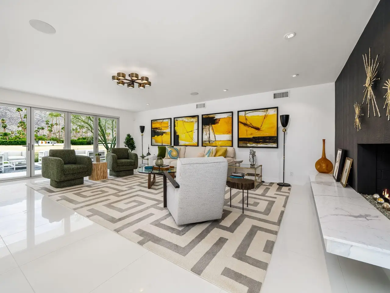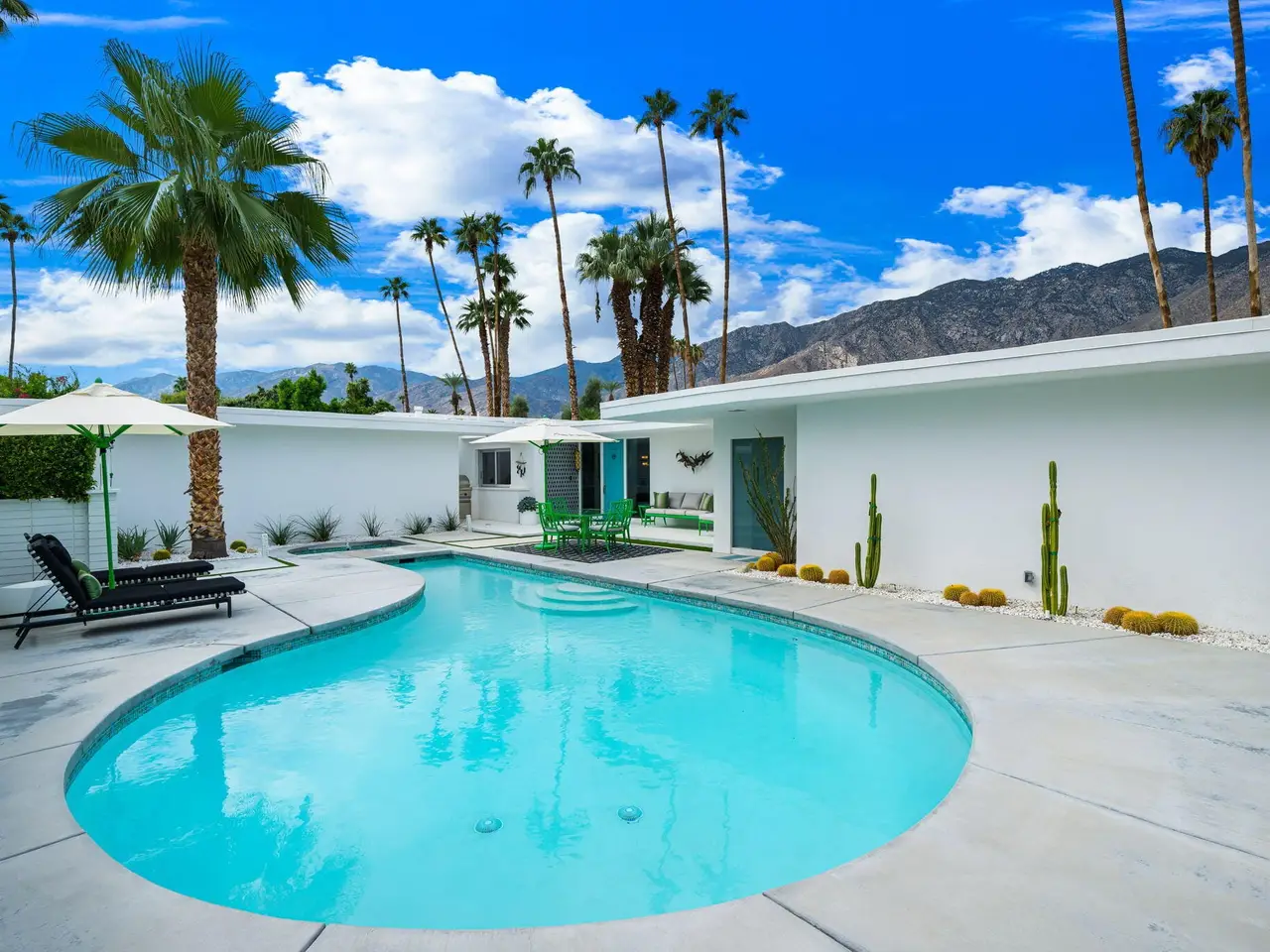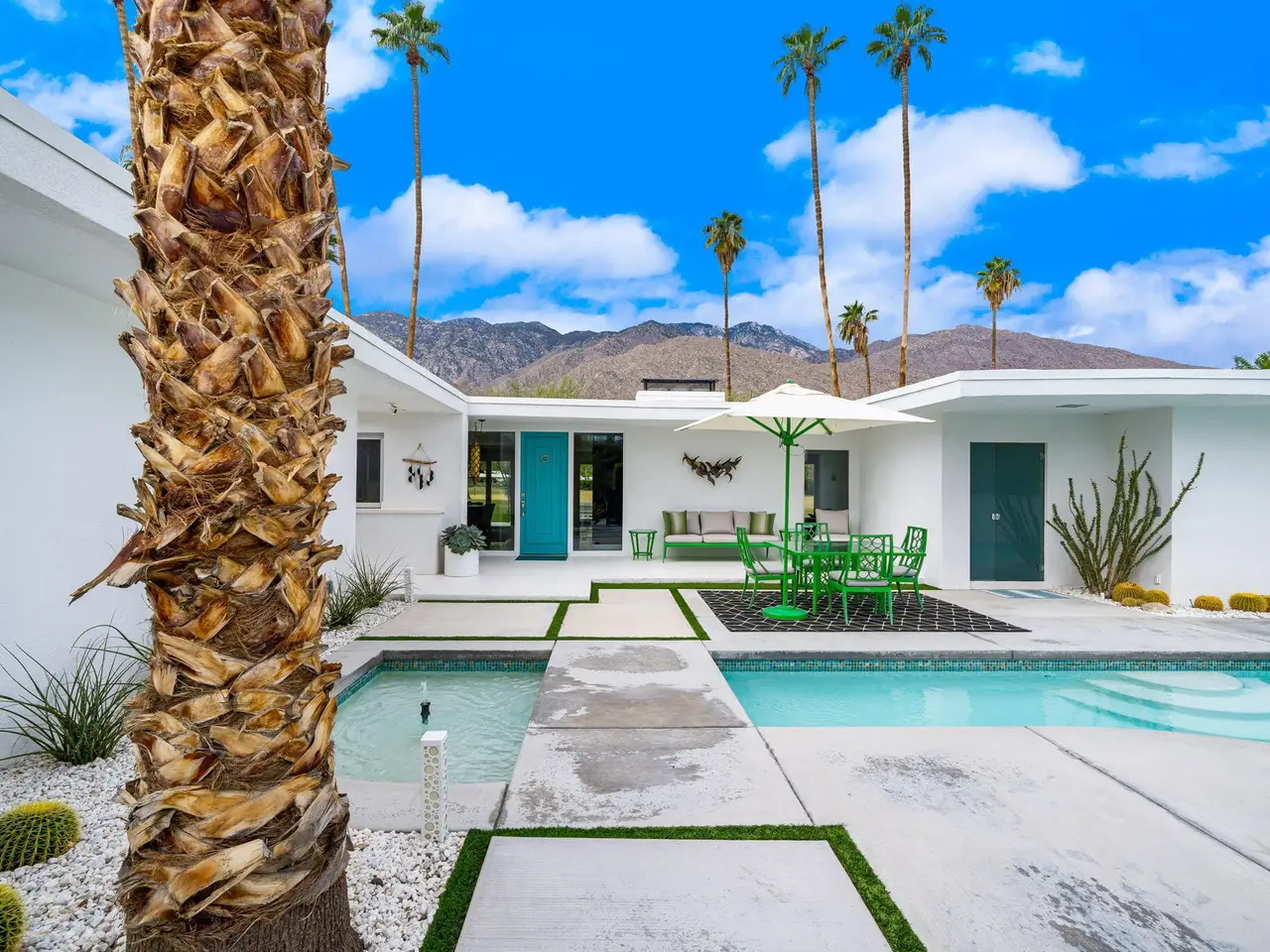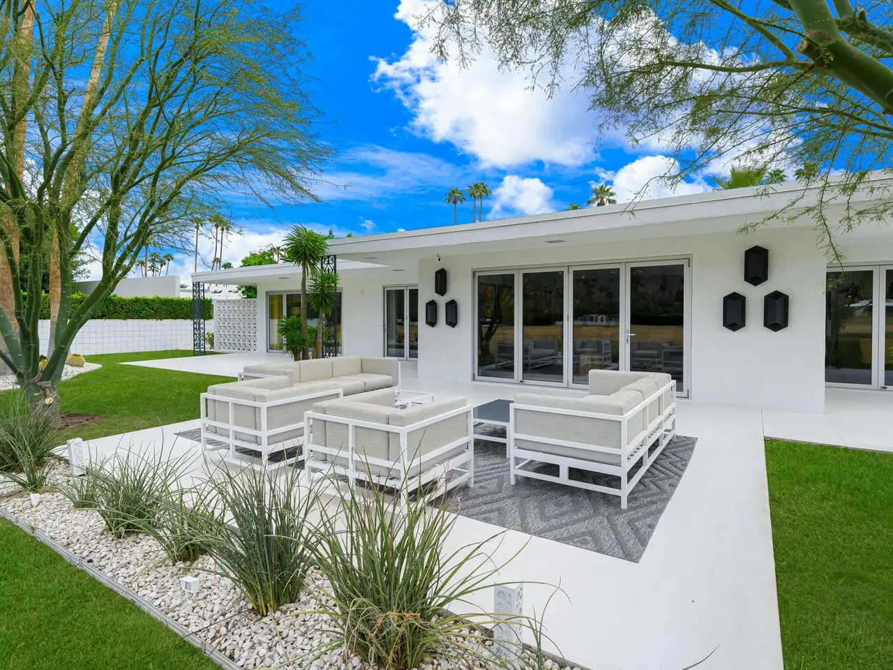 This exceptional midcentury residence is located on the 17th fairway of the Indian Canyons golf course in South Palm Springs, offering 360-degree mountain views. Meticulously remodeled by renowned Palm Springs designer Christopher Kennedy and previously showcased as the Modernism Week Showhouse, this home seamlessly integrates stunning La Cantina folding and pocketing glass doors to frame the spectacular fairway and mountain vistas. The property features multiple elegantly appointed outdoor living areas, including a convenient pass-through window from the kitchen for effortless entertaining. Upgrades include new front gates, a dedicated catering kitchen adjacent to the main social kitchen equipped with Wolf and Sub-Zero appliances, two dishwashers, and premium plumbing fixtures from Dornbracht, Brizio, and Duravit. Additional highlights include designer wall treatments, custom window coverings, bespoke cabinetry in the fully finished garage, a 35-panel owned solar system, automated blinds, and oversized porcelain slabs throughout the exterior spaces. Situated in one of Palm Springs' most desirable neighborhoods, this home exemplifies sophisticated, high-end design.