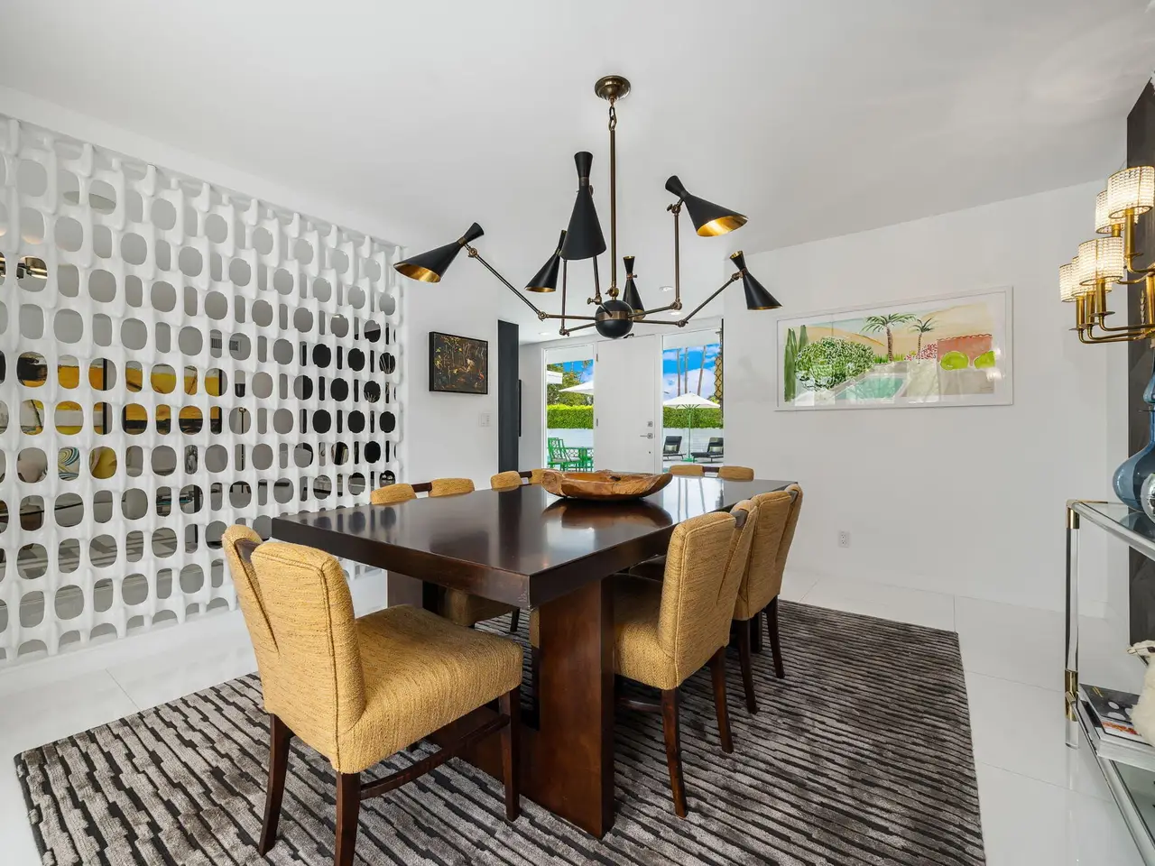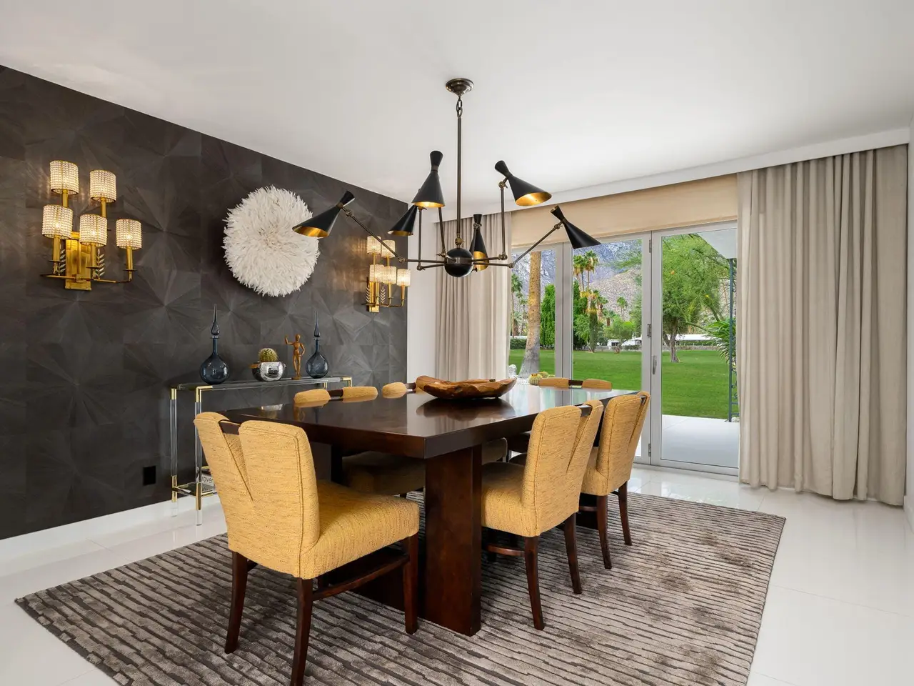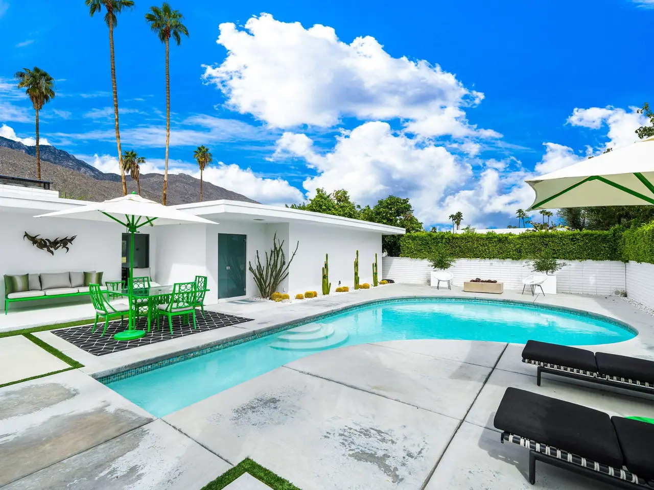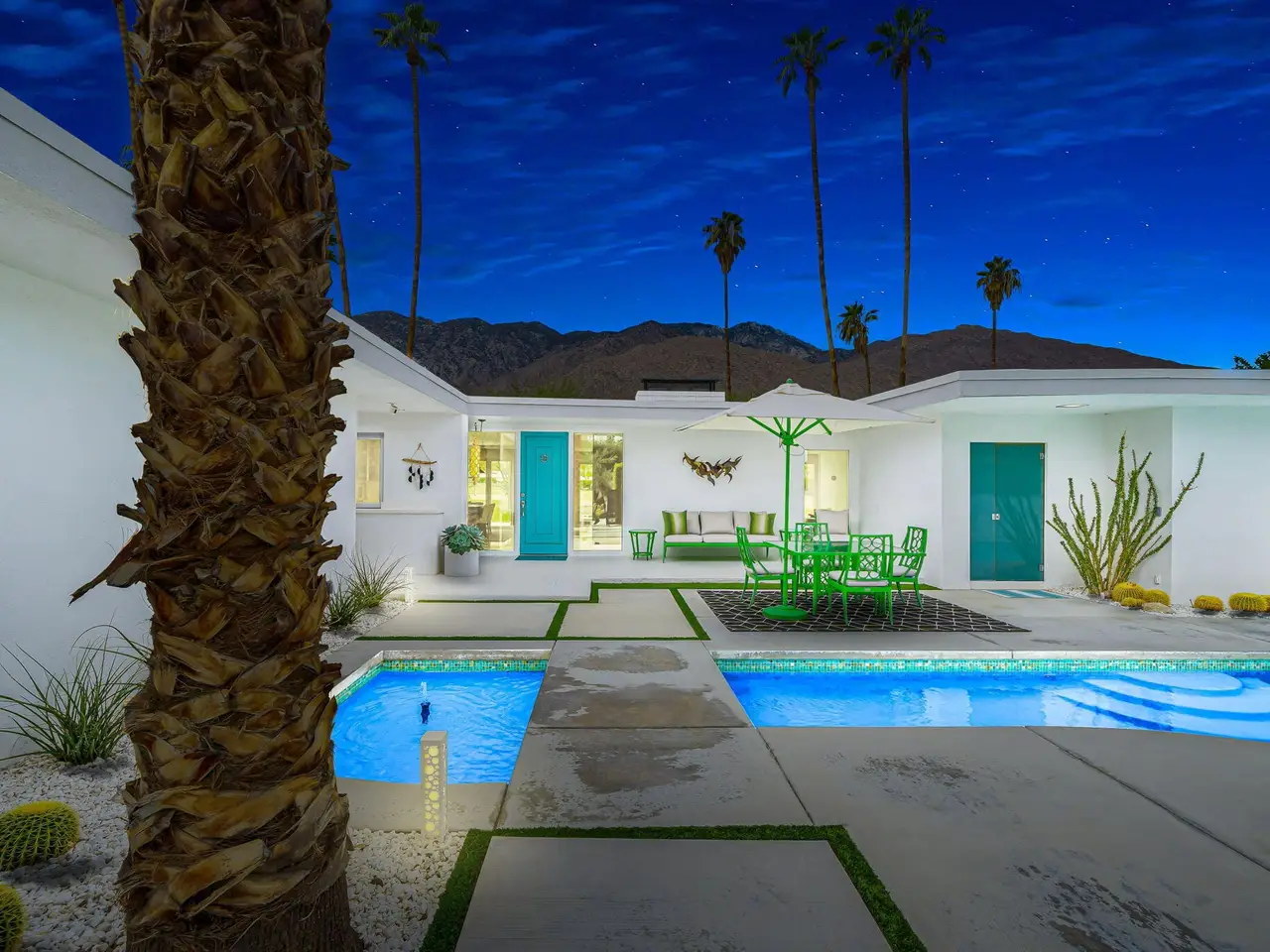 This exceptional midcentury residence is located on the 17th fairway of the Indian Canyons golf course in South Palm Springs, offering 360-degree mountain views. Meticulously remodeled by renowned Palm Springs designer Christopher Kennedy and previously showcased as the Modernism Week Showhouse, this home seamlessly integrates stunning La Cantina folding and pocketing glass doors to frame the spectacular fairway and mountain vistas. The property features multiple elegantly appointed outdoor living areas, including a convenient pass-through window from the kitchen for effortless entertaining. Upgrades include new front gates, a dedicated catering kitchen adjacent to the main social kitchen equipped with Wolf and Sub-Zero appliances, two dishwashers, and premium plumbing fixtures from Dornbracht, Brizio, and Duravit. Additional highlights include designer wall treatments, custom window coverings, bespoke cabinetry in the fully finished garage, a 35-panel owned solar system, automated blinds, and oversized porcelain slabs throughout the exterior spaces. Situated in one of Palm Springs' most desirable neighborhoods, this home exemplifies sophisticated, high-end design.