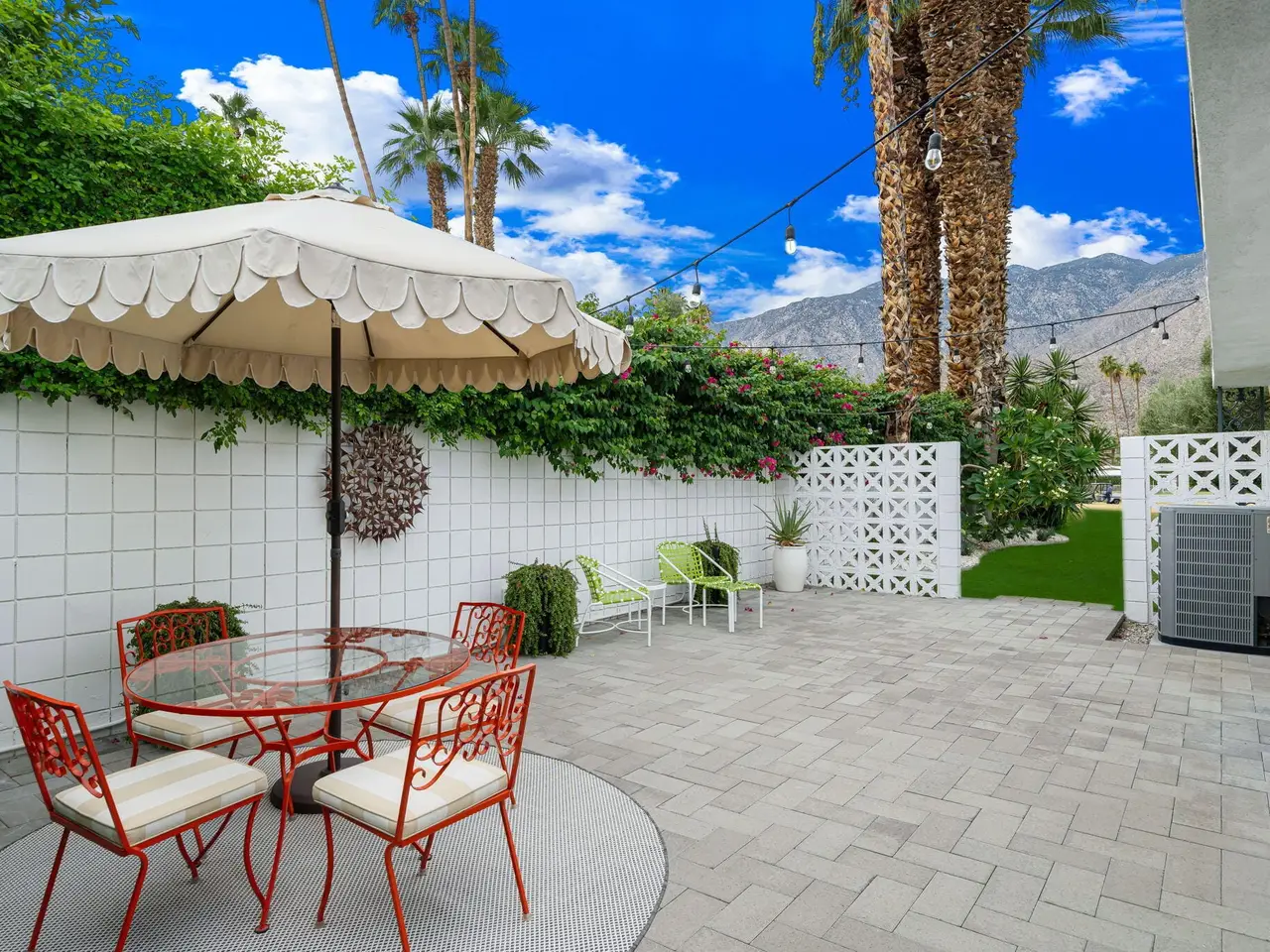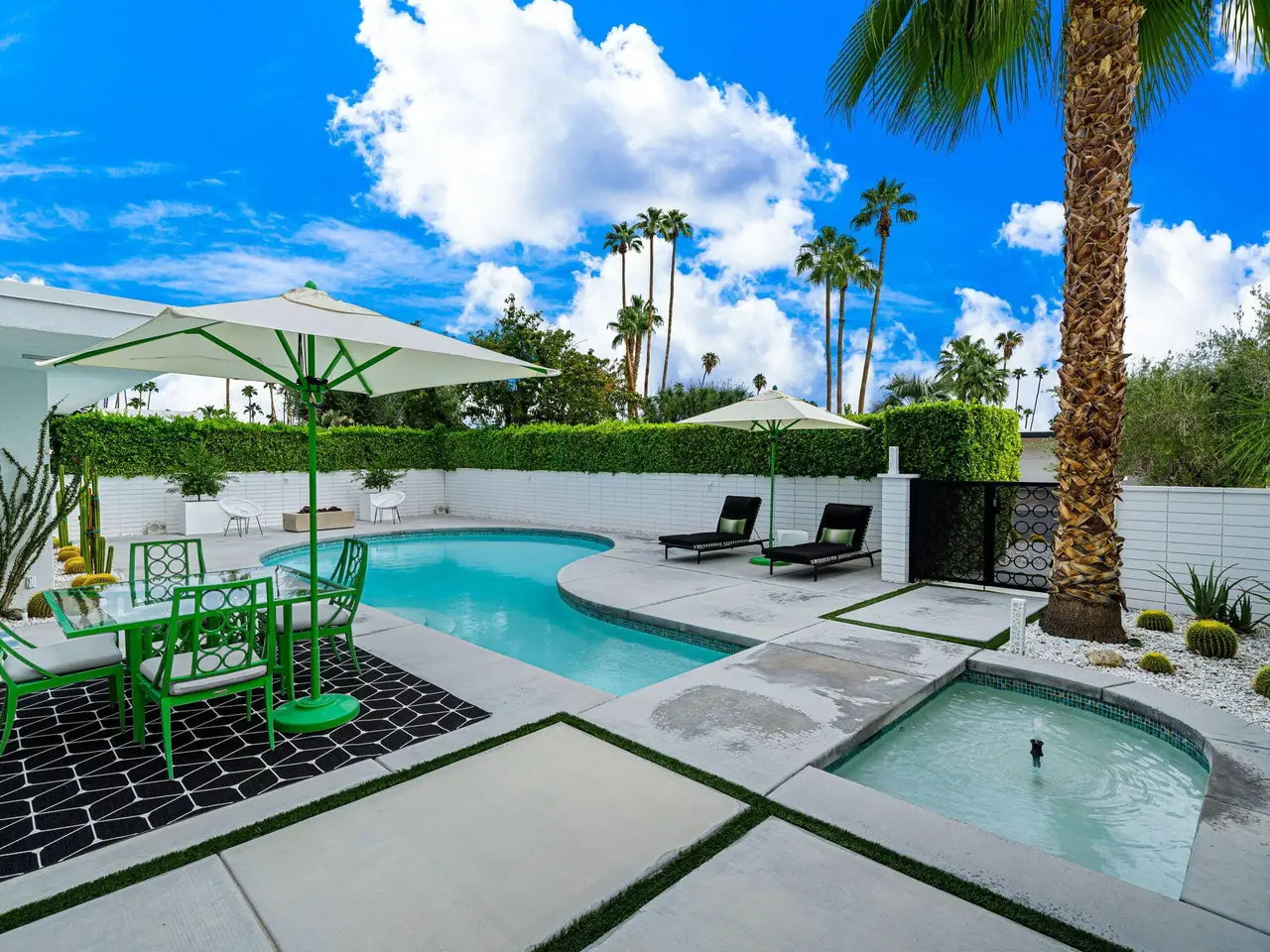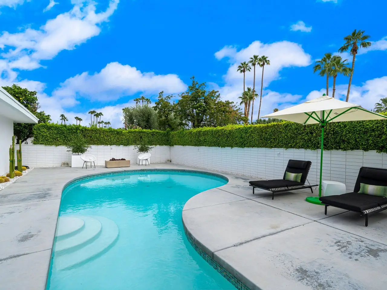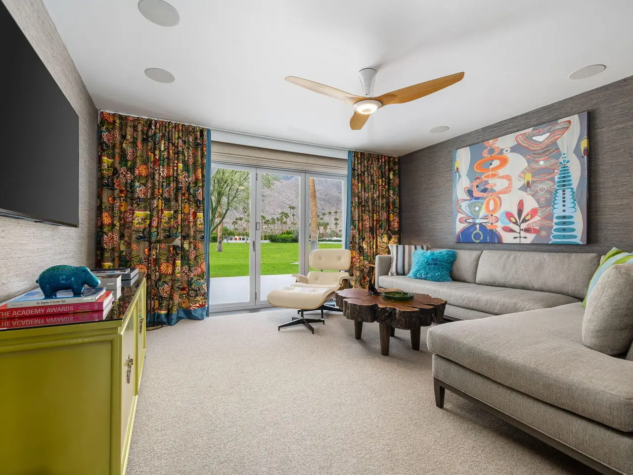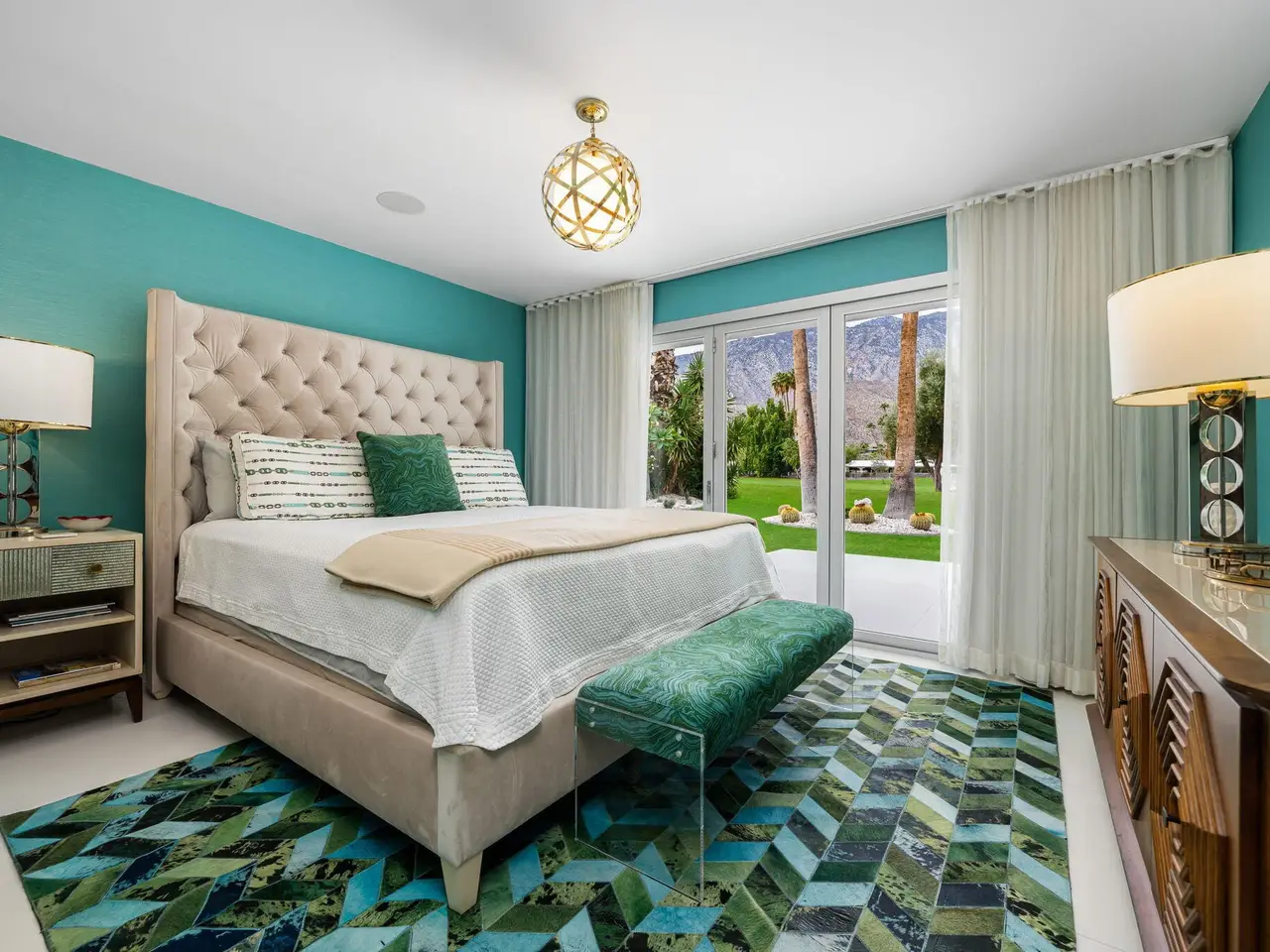 This exceptional midcentury residence is located on the 17th fairway of the Indian Canyons golf course in South Palm Springs, offering 360-degree mountain views. Meticulously remodeled by renowned Palm Springs designer Christopher Kennedy and previously showcased as the Modernism Week Showhouse, this home seamlessly integrates stunning La Cantina folding and pocketing glass doors to frame the spectacular fairway and mountain vistas. The property features multiple elegantly appointed outdoor living areas, including a convenient pass-through window from the kitchen for effortless entertaining. Upgrades include new front gates, a dedicated catering kitchen adjacent to the main social kitchen equipped with Wolf and Sub-Zero appliances, two dishwashers, and premium plumbing fixtures from Dornbracht, Brizio, and Duravit. Additional highlights include designer wall treatments, custom window coverings, bespoke cabinetry in the fully finished garage, a 35-panel owned solar system, automated blinds, and oversized porcelain slabs throughout the exterior spaces. Situated in one of Palm Springs' most desirable neighborhoods, this home exemplifies sophisticated, high-end design.