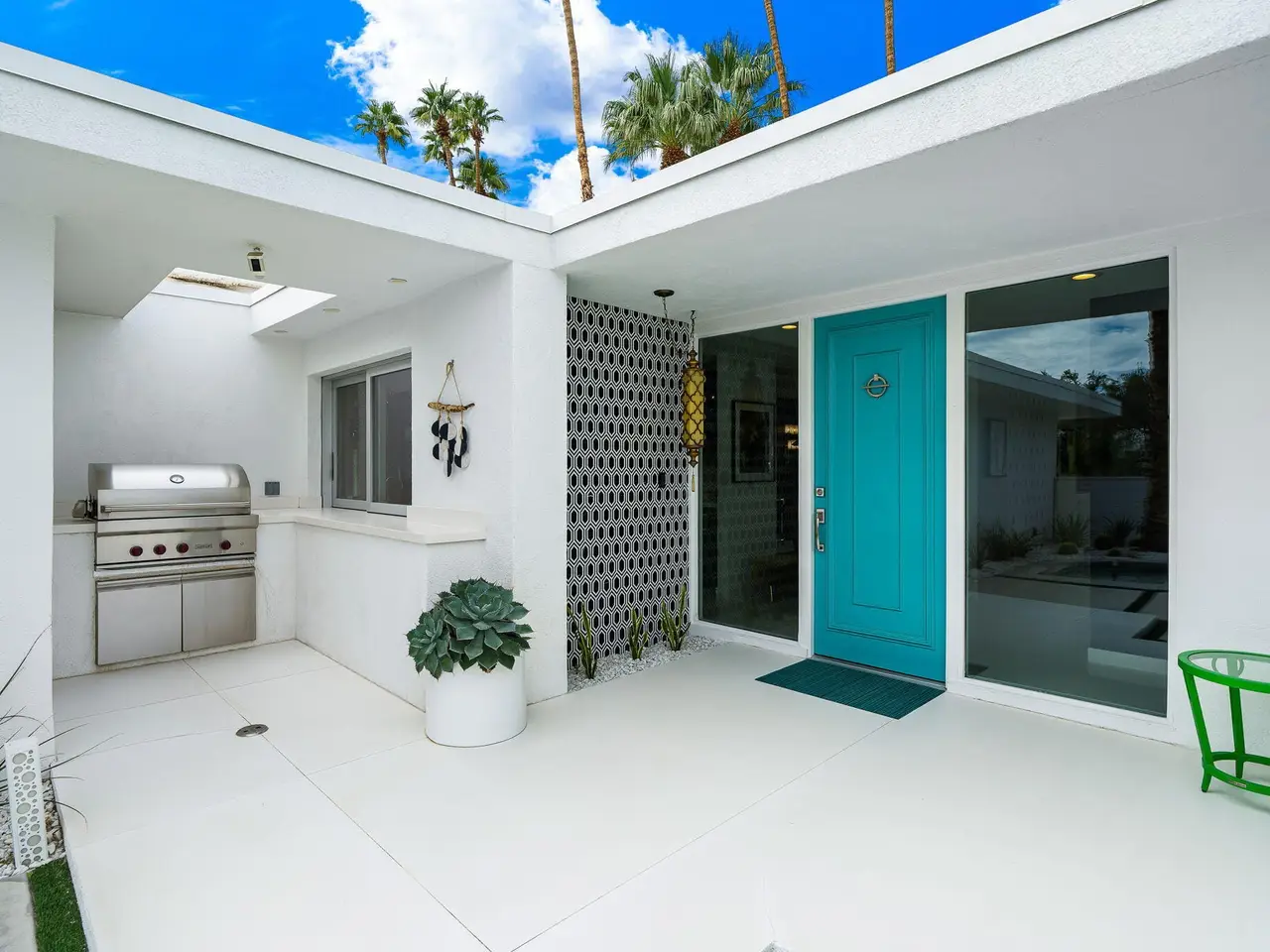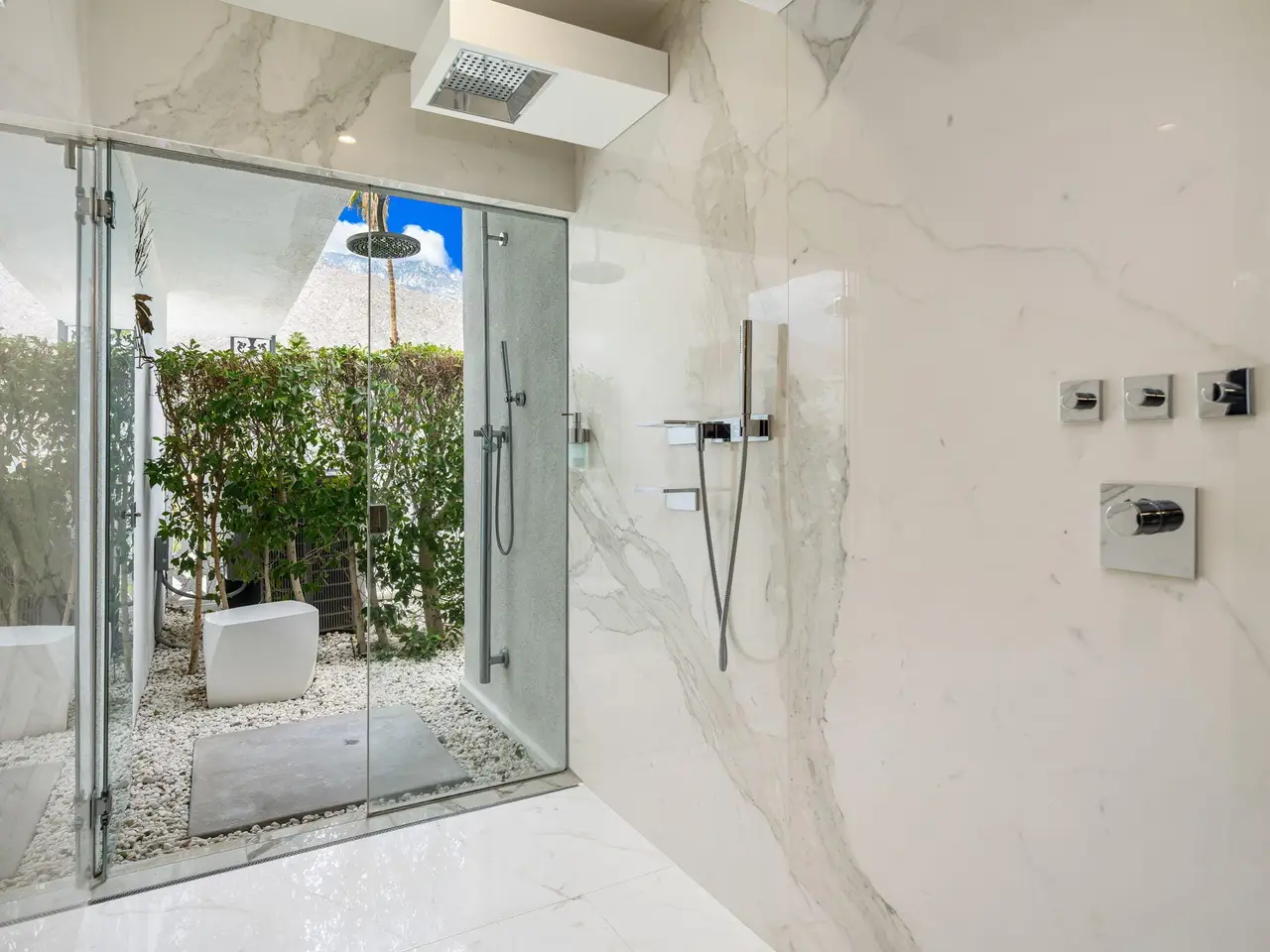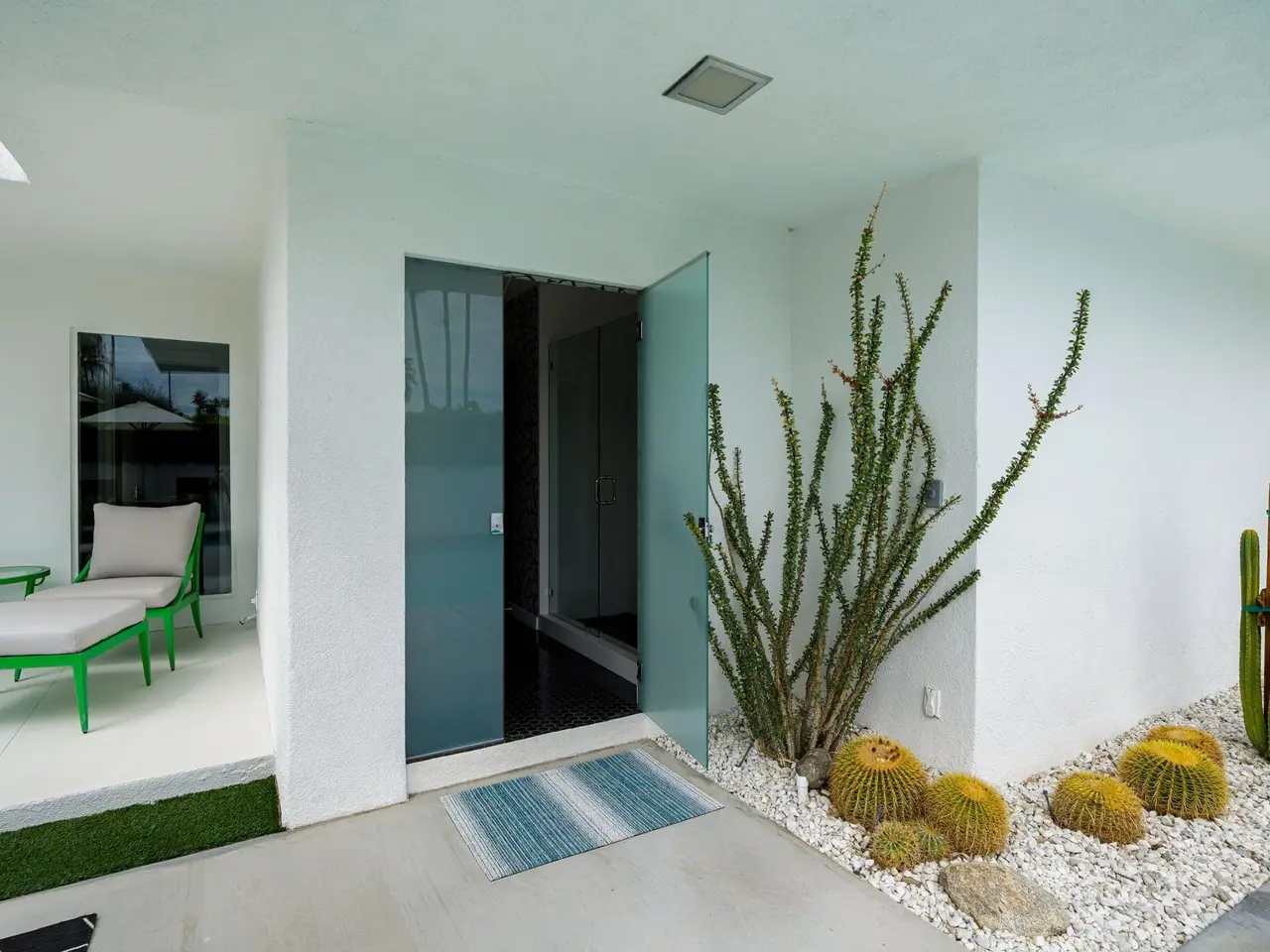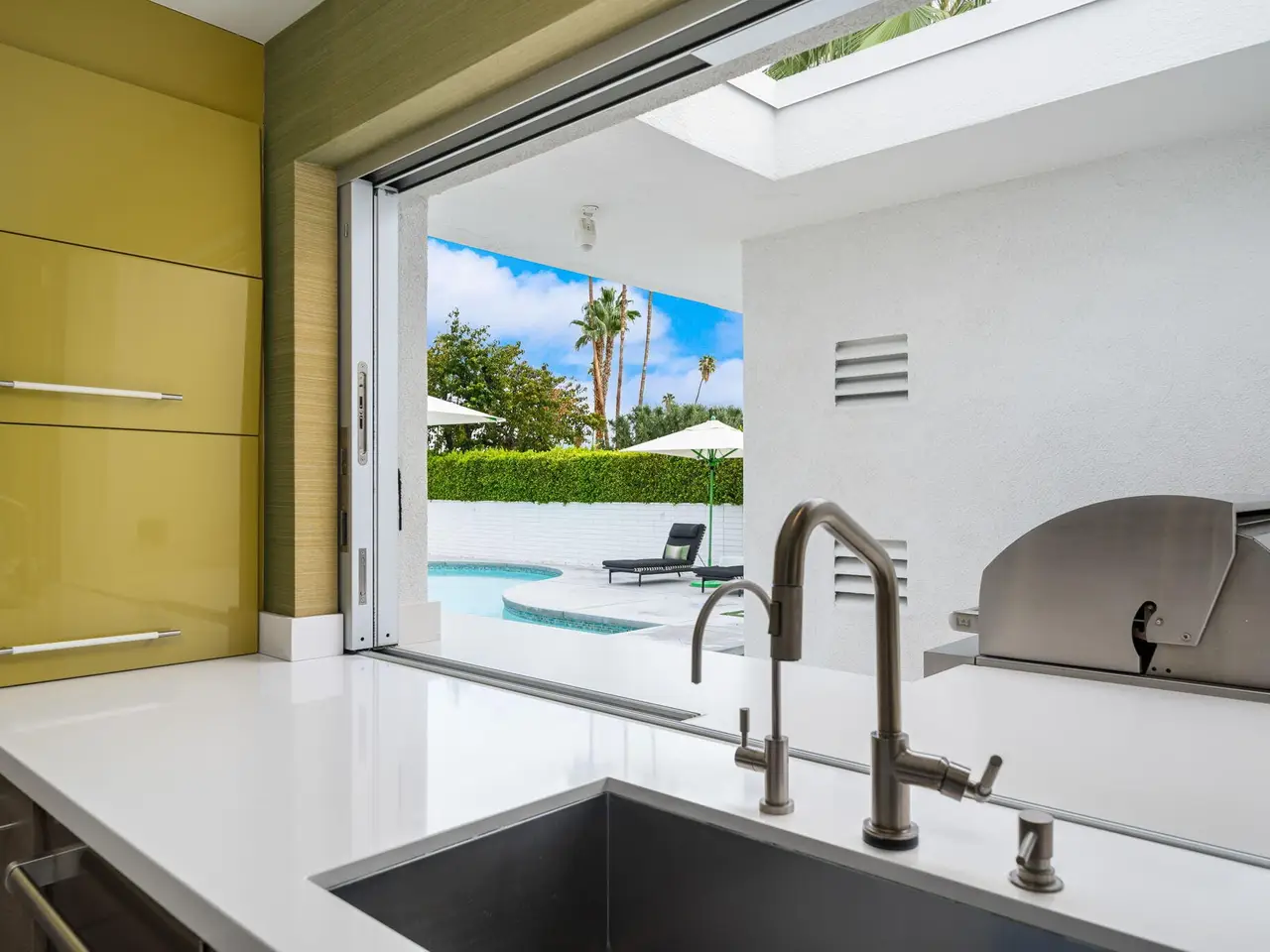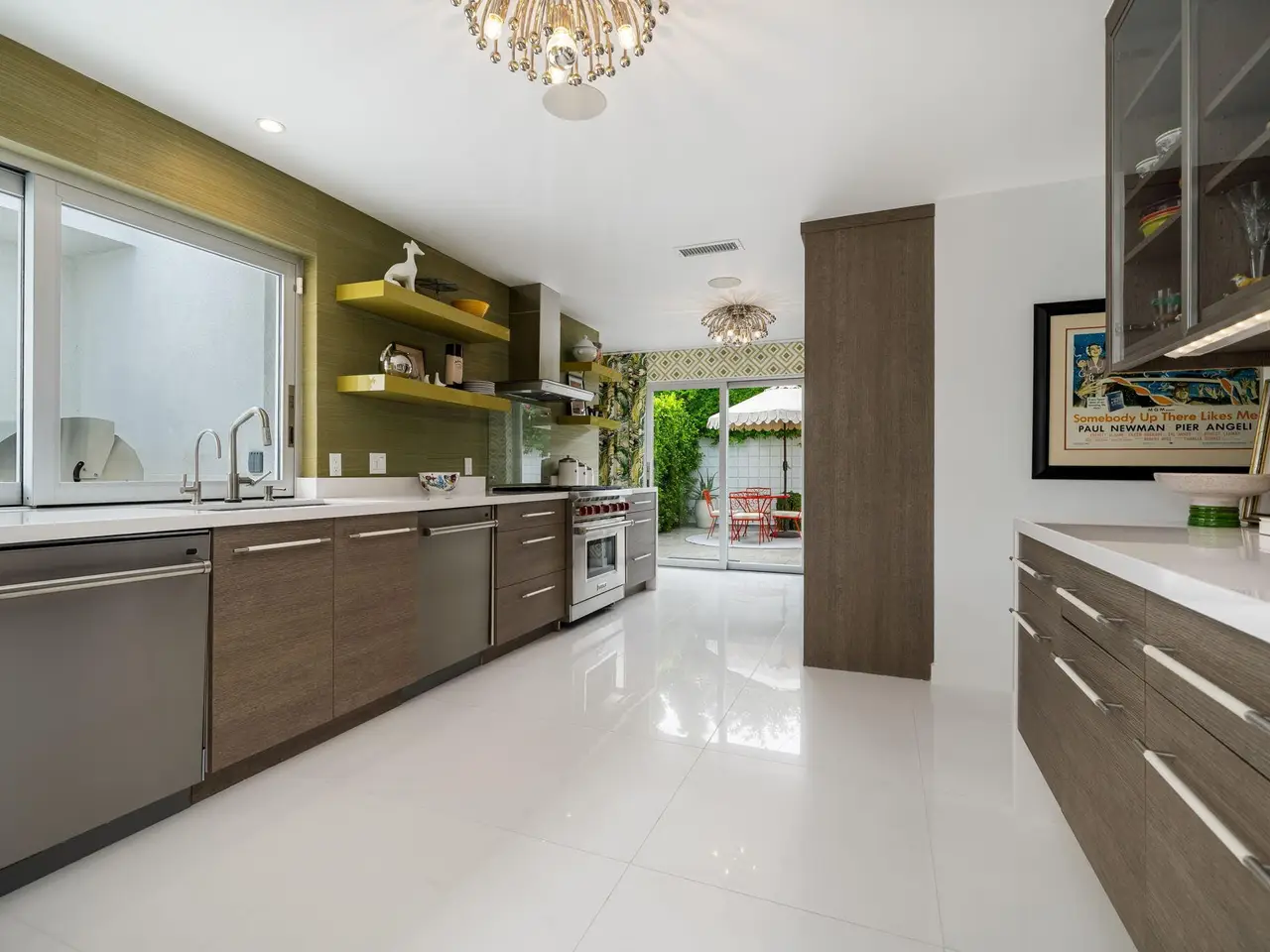 This exceptional midcentury residence is located on the 17th fairway of the Indian Canyons golf course in South Palm Springs, offering 360-degree mountain views. Meticulously remodeled by renowned Palm Springs designer Christopher Kennedy and previously showcased as the Modernism Week Showhouse, this home seamlessly integrates stunning La Cantina folding and pocketing glass doors to frame the spectacular fairway and mountain vistas. The property features multiple elegantly appointed outdoor living areas, including a convenient pass-through window from the kitchen for effortless entertaining. Upgrades include new front gates, a dedicated catering kitchen adjacent to the main social kitchen equipped with Wolf and Sub-Zero appliances, two dishwashers, and premium plumbing fixtures from Dornbracht, Brizio, and Duravit. Additional highlights include designer wall treatments, custom window coverings, bespoke cabinetry in the fully finished garage, a 35-panel owned solar system, automated blinds, and oversized porcelain slabs throughout the exterior spaces. Situated in one of Palm Springs' most desirable neighborhoods, this home exemplifies sophisticated, high-end design.