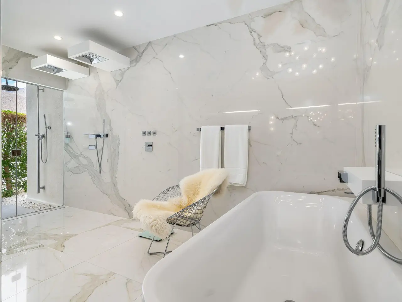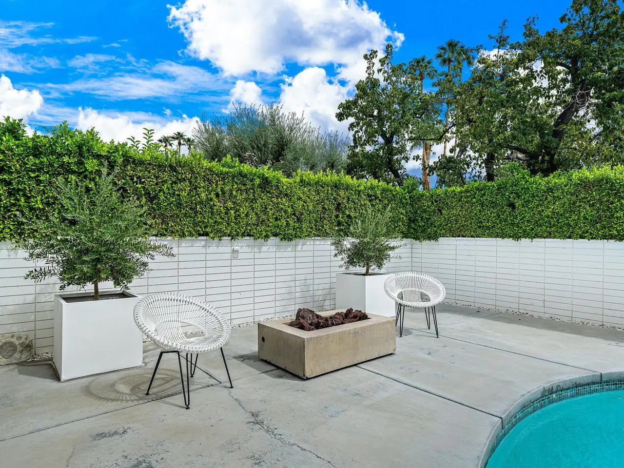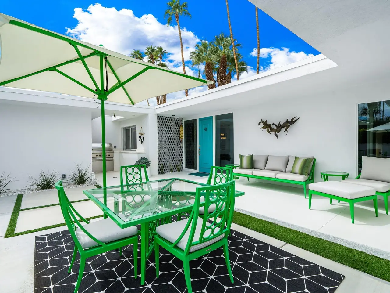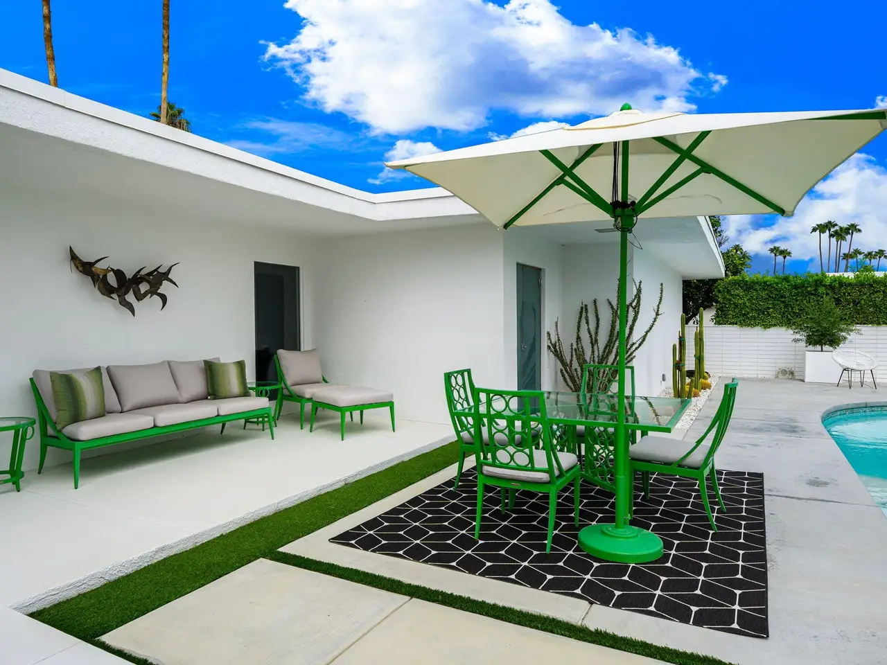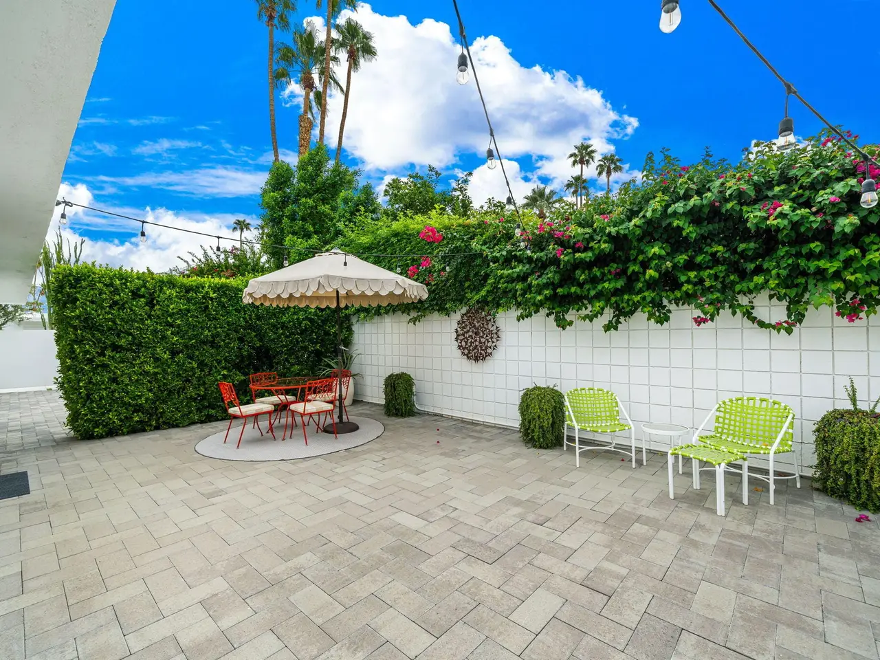 This exceptional midcentury residence is located on the 17th fairway of the Indian Canyons golf course in South Palm Springs, offering 360-degree mountain views. Meticulously remodeled by renowned Palm Springs designer Christopher Kennedy and previously showcased as the Modernism Week Showhouse, this home seamlessly integrates stunning La Cantina folding and pocketing glass doors to frame the spectacular fairway and mountain vistas. The property features multiple elegantly appointed outdoor living areas, including a convenient pass-through window from the kitchen for effortless entertaining. Upgrades include new front gates, a dedicated catering kitchen adjacent to the main social kitchen equipped with Wolf and Sub-Zero appliances, two dishwashers, and premium plumbing fixtures from Dornbracht, Brizio, and Duravit. Additional highlights include designer wall treatments, custom window coverings, bespoke cabinetry in the fully finished garage, a 35-panel owned solar system, automated blinds, and oversized porcelain slabs throughout the exterior spaces. Situated in one of Palm Springs' most desirable neighborhoods, this home exemplifies sophisticated, high-end design.
