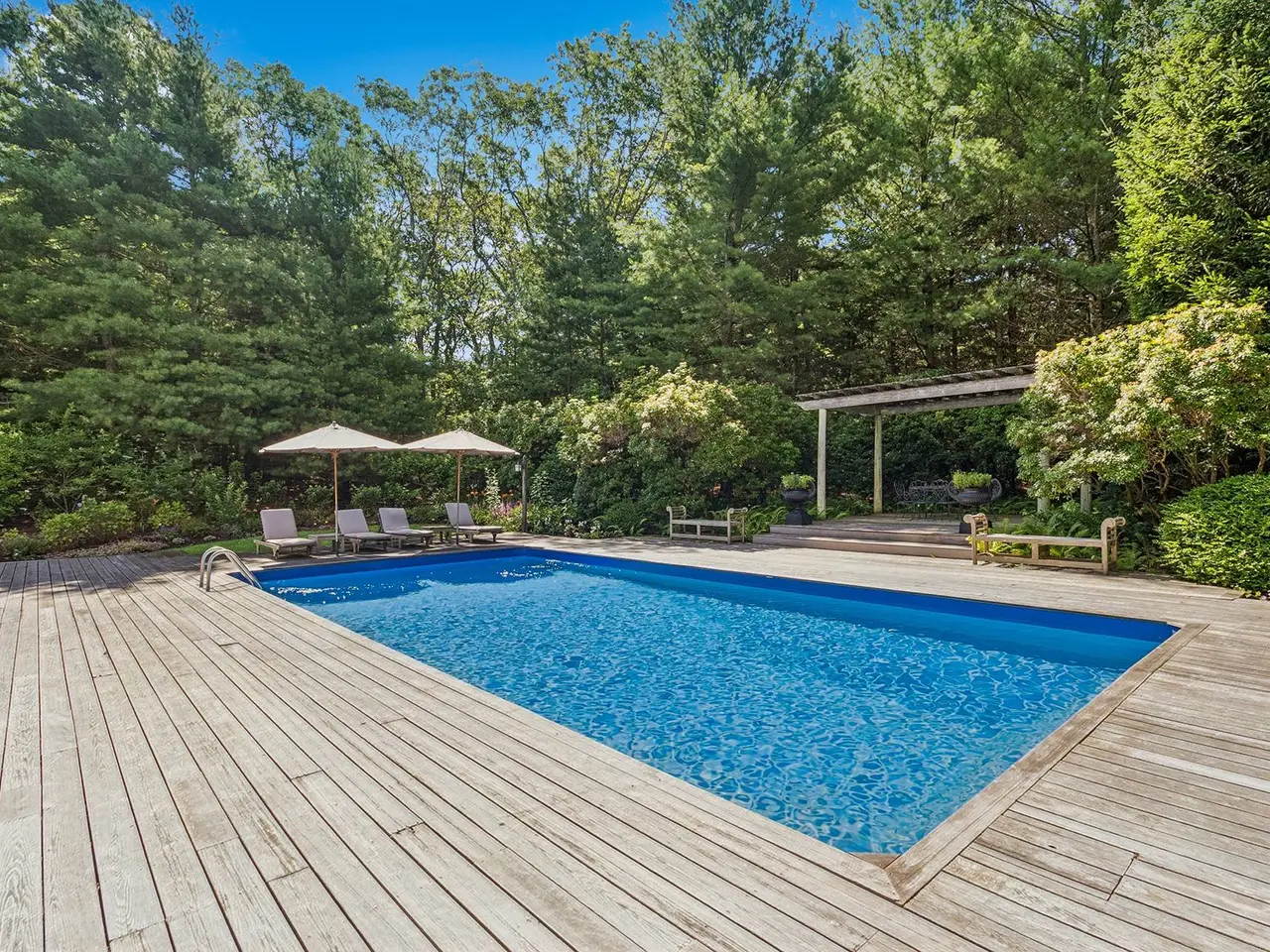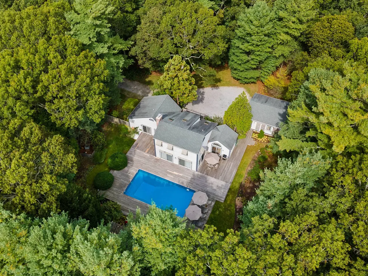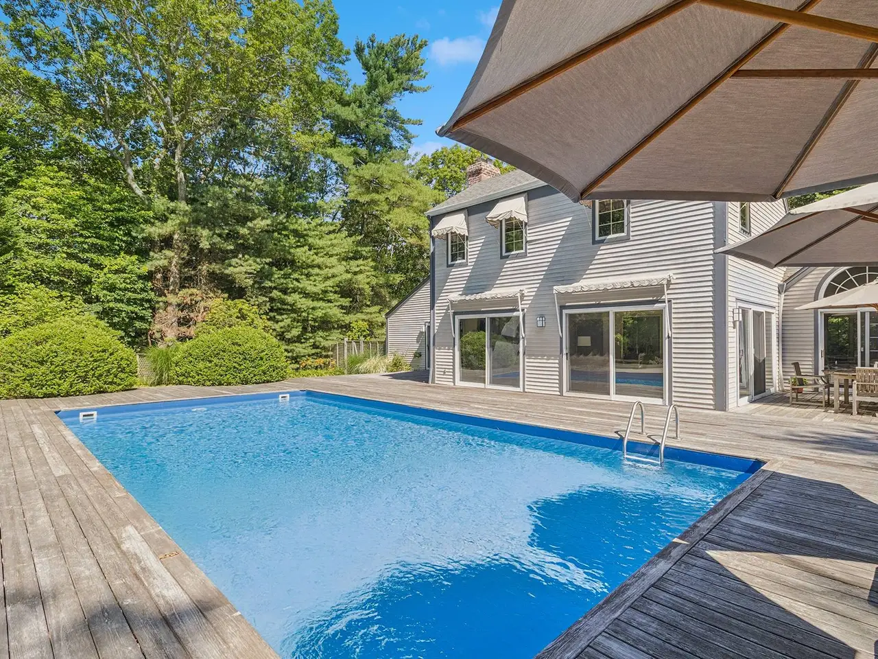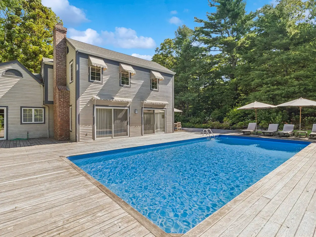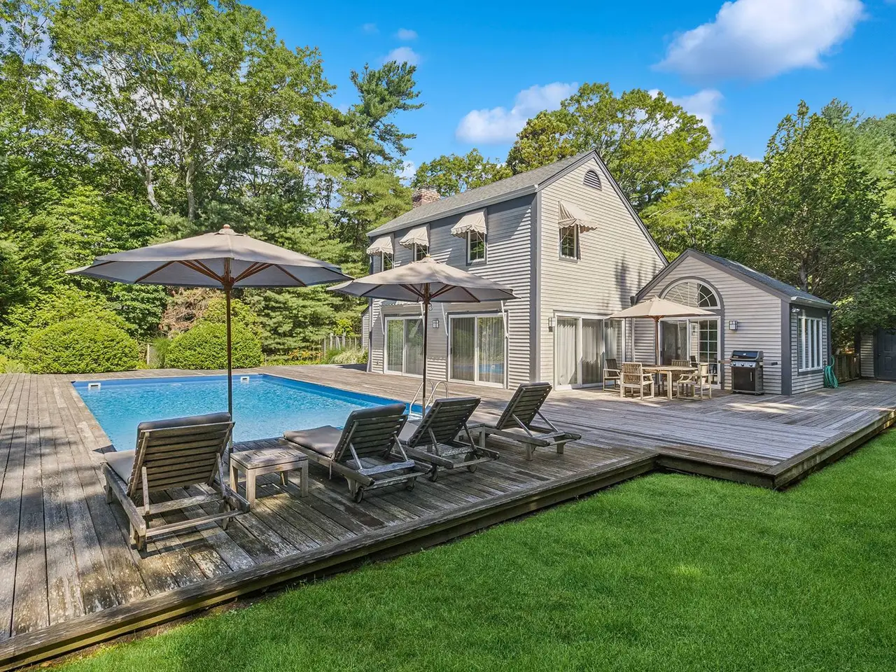 Set on 2.26+- private acres close to both East Hampton and Sag Harbor Villages, this three-bedroom traditional offers the perfect blend of comfort, style, and indoor-outdoor living across 2,100+- sf of living space. Thoughtfully designed for entertaining and relaxation, the home features a spacious living room with two sitting areas and a wood-burning fireplace. Multiple sets of glass sliders flood the space with natural light and lead to an expansive deck, where lounge and dining areas surround the pool, creating a true outdoor oasis. The kitchen is equipped with integrated refrigeration and modern updates, making it as functional as it is attractive. With three bedrooms and two and a half bathrooms currently, there's potential to expand the existing 1st and 2nd levels to 7,000 sf in addition to finishing the lower level. A detached two-car garage offers additional convenience, while the peaceful setting ensures privacy without sacrificing proximity to the best of the Hamptons.