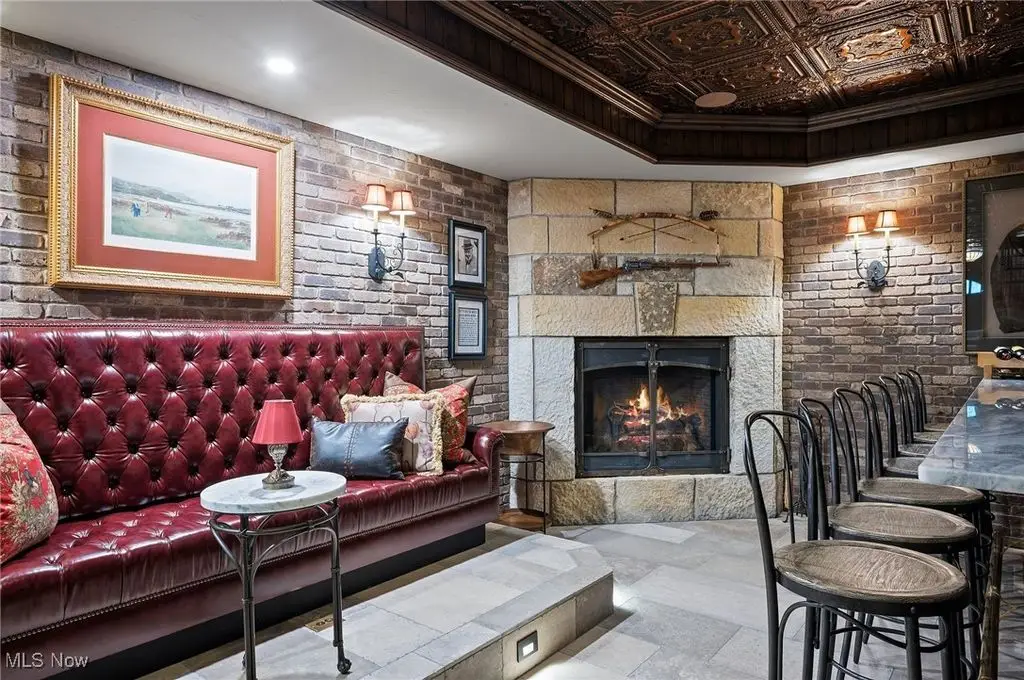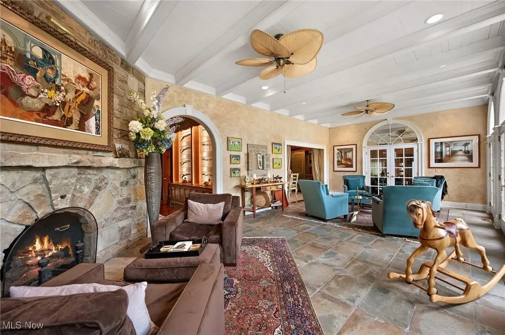 Set on 24 scenic acres of sweeping lawns & woodlands with 3 stocked fishponds, this magnificent English country estate, reimagined by renowned Cleveland architect Anthony Paskevich, offers an unparalleled living experience. A long, illuminated drive winds past original farmhouse & barn complex, leading through a tree-lined allee flanked by stunning gardens to the impressive main residence. A turreted entrance welcomes guests. The stone & clapboard exterior gives way to magnificent millwork, vaulted ceilings, arched doorways, oversized windows, and carefully selected stone & wood flooring. Designed for everyday living and grand entertaining, the generously sized gathering areas incl. a great room, formal dining room, family room, and solarium, all with fireplaces. A tranquil haven, the primary bedroom suite has dual baths and 4 additional suites incl. private baths. Enclosed by walls of glass, a spectacular pool pavilion opens to a stone patio overlooking breathtaking scenery and the exercise room, incl. sauna and steam room, epitomizes luxury & relaxation with a view. Approached by a brick courtyard, the custom-built, 1-bedroom guesthouse has an expansive brick terrace with geothermal heat, a fireplace and outdoor kitchen & pizza oven. With the richness & warmth of stone, brick, and wood, the bar room on the walk-out lower level exudes the charm of a traditional Scottish pub. The 2-car garage has an additional 1-bedroom, 1-bath guest suite on its upper level. Original farmhouse and one-room schoolhouse, moved to the property in the 1930s, are fully updated with modern amenities. The farmhouse has 3 bedrooms, 1.5 baths, wraparound porch, A/C and whole-house generator. The estate also has a fully restored, authentic barn complex - 4 frame buildings connected by a covered walkway: barn with 4 stalls & hayloft, greenhouse/studio, and detached 2-car and 4-car garages. Open fenced pastures with loafing sheds have ample space for horses, alpacas, or sheep to graze freely.