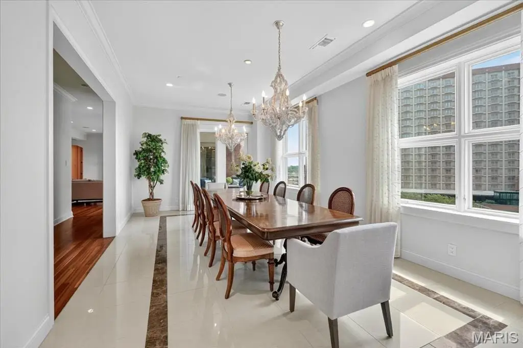 A rare opportunity to own a stunning 4-bed condo in the exclusive The Crescent, located in the heart of downtown Clayton. This 6th-fl residence offers sweeping views of Clayton and the St Louis skyline from 2 inset balconies. An expansive open floor plan with 9-10 foot ceilings, floor-to-ceiling windows, and high-end finishes throughout. Rich wood floors, custom built-ins, and gas fireplace create an inviting ambiance. The gourmet eat-in kitchen with Wolf and SubZero appliances flows into the spacious dining and family rooms, perfect for entertaining. The luxurious primary suite features 2 custom closets, remote operated shades, and a spa-like bath. 3 additional beds with ensuite baths provide ultimate comfort and privacy. Addtl. highlights include an office, sitting rm, 2 laundry rms, and 4 parking spaces. Enjoy world-class amenities such as a fitness center, concierge, dog park, secure heated garage, 24-hour doorman, valet, onsite manager, moments from fine dining and shopping. Location: Interior Unit