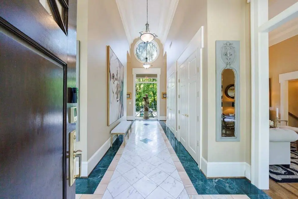 Inspired by Andrea Palladio's masterpiece, Villa Poiana, this exquisite Tuxedo Park custom home offers truly beautiful and unique architecture throughout the property including custom window details, elegantly designed front entry and custom crown molding. Grand entrance foyer with marble flooring leads to oversized dining room and living room, both featuring a fireplace. Beautiful floor to ceiling windows throughout the home offer a lot of natural light. French doors throughout the entire back of the house all open to the pool, ideal for entertaining. Kitchen opens to the breakfast room and includes island, gas range, wood burning oven from Provence, stone counters and marble flooring. Handsome solid walnut paneled den sits in the back of the house, ideal for an office or den. Spacious guest suite on main with full bath. The primary suite has its own wing on the upper level with walk-in closet, ensuite primary bath with dual vanities, and shower. The primary suite also has its own private balcony. Additional two bedrooms and one bath on a separate upper level wing from the primary suite. Basement has access to the three-car garage (one garage in tandem). Gorgeous manicured grounds include a lap pool, spa and level yard. Parking pad in the front of the house as well.