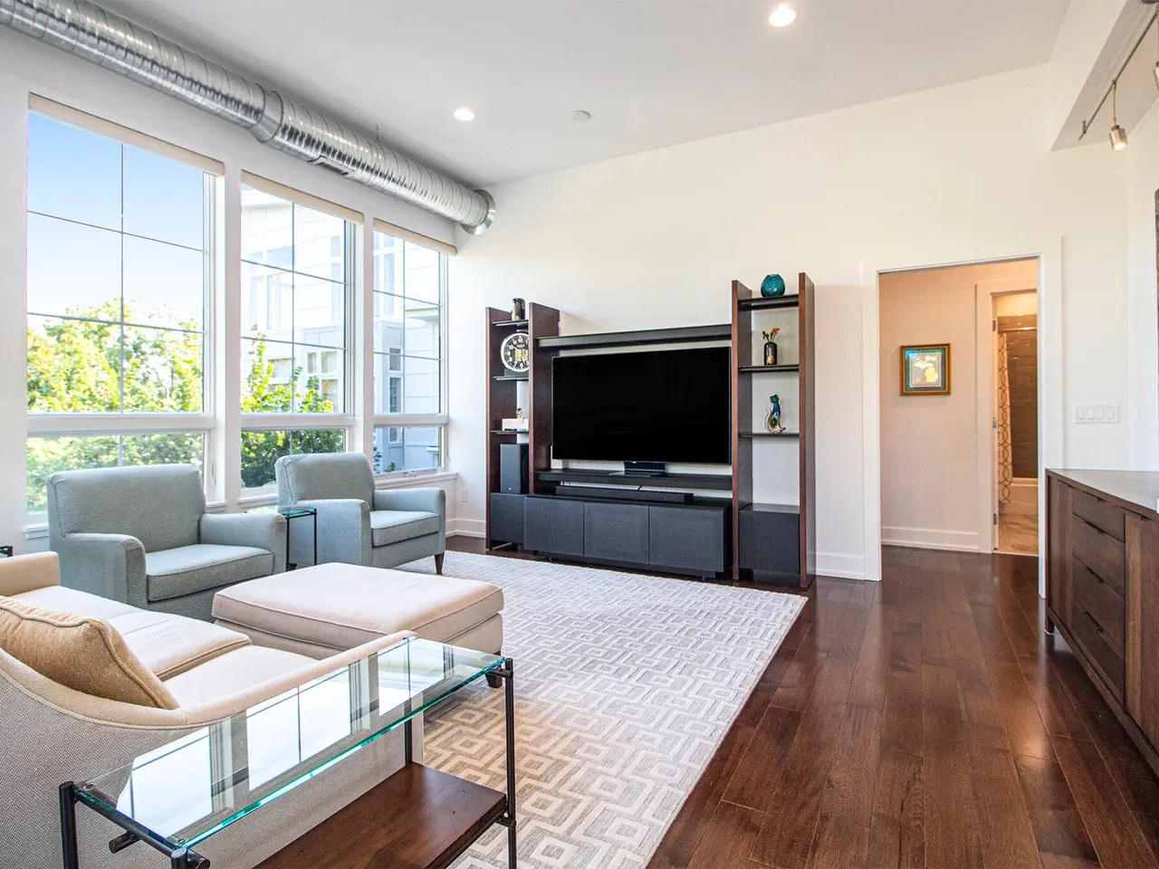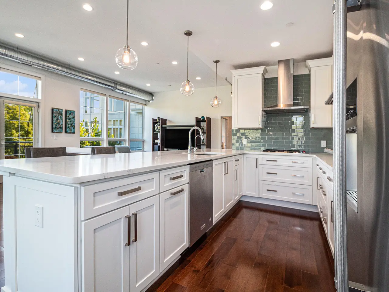 Experience the best of downtown Ann Arbor living in this nearly 2,000 SF ranch-style corner unit condo at 410 N. First. Just steps from Kerrytown's vibrant shops, award-winning dining, the Ann Arbor Farmers Market, and the University of Michigan Central and Medical Campuses, this upscale residence puts you in the heart of it all - yet offers peaceful, unobstructed views of Fish Park right next door. With a Walk Score of 95, this is truly a walker's paradise and a dream for city lovers. Inside, the sun-filled open floor plan is perfect for both everyday living and entertaining. The sleek kitchen features clean white cabinetry, quartz countertops, and premium Wolf and KitchenAid stainless appliances. A central breakfast bar connects seamlessly to the dining and living areas, making it easy to host friends or enjoy a quiet evening at home. The dining room opens to its own balcony, while a spacious deck near the entrance to the unit is ideal for grilling and dining al fresco and provides an additional opportunity to enjoy the outdoors. The luxurious primary suite is your personal retreat, offering a vaulted ceiling, expansive walk-in closet with custom organization, and spa-inspired bath with dual vanities and oversized shower. This bedroom also shares a balcony with the bedroom next door. The two guest bedrooms (one currently an office/den) share a hallway full bath, while wood floors, in-unit laundry with bonus storage, and upgrades like reverse osmosis, water softener, Hunter Douglas window treatments, and whole-house air purification add comfort and ease. In addition to three private outdoor spaces in the unit, you'll have access to the community terrace located on the first floor, as well as the shared bike and storage rooms and a dedicated mail room. This unit also enjoys two assigned spaces in the covered garage. No need to wait for new construction - with its prime downtown location, abundant natural light, and three private outdoor spaces, this well-maintained and stylish condo is the epitome of city living - move right in and enjoy!