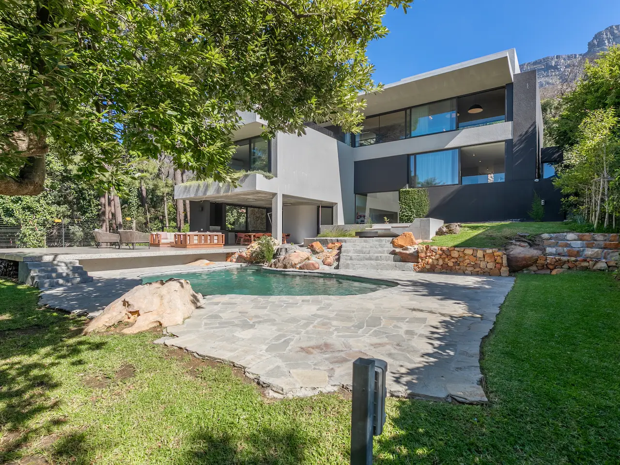 Set high on the slopes of Table Mountain in the prestigious suburb of Oranjezicht, this multi-level home captures the essence of fine Cape Town living. It is tastefully designed for elegant entertaining, relaxed everyday comfort and privacy. The sweeping views of the mountain, the city, and the bay provide a spectacular backdrop for every season. Main Living Level: Open-Plan Kitchen & Dining — A beautifully appointed space with seamless sightlines to Table Mountain, the city skyline, and the blue sweep of the bay. Entertainment Lounge & Bar — A sophisticated indoor bar and lounge that flows through sliding doors to an outdoor sitting area, perfectly placed to enjoy the adjacent forest during the day and the city lights by night. Study — A quiet, private workspace framed by mountain views. Guest Toilet — Discreetly positioned for visitors’ convenience. Bedrooms & Private Spaces: Main Suite — A north-facing sanctuary with a luxurious en-suite bathroom. The shower opens via sliding doors onto a secluded courtyard — a rare touch of resort-style luxury. Second & Third Bedrooms — Share a generous bathroom, with a separate toilet and basin for practicality. Fourth Bedroom (Guest Suite) — Ideal for guests or extended family. A private courtyard and its own street entrance ensure independence and ease. Pajama Lounge — A warm, north-facing snug for family time or quiet evenings. Laundry room. Outdoor Living Downstairs: Covered Entertainment Terrace — Suited to all seasons, perfect for long lunches or evening drinks. Pool & Sun Deck — Set for full enjoyment of Cape Town’s summer days. Built-In Braai Pit with Seating — An inviting, social space for casual gatherings. Guest Toilet & Basin — Conveniently located without interrupting indoor living. A Rare Offering This residence pairs contemporary comfort with the drama and calm of nature — a home that allows its owner to choose daily between retreat and celebration. A truly exceptional opportunity to live above the city, beneath the mountain, in one of the most coveted pockets of Cape Town.