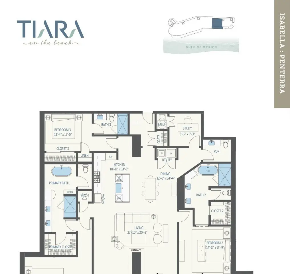Open House November 1st 11:00AM-3:00PM. Now under construction! Welcome to the Isabella Penterra floorplan at Tiara on the Beach - a new way to experience life on the water's edge. Isabella is located on the 3rd floor and features 11' ceilings, a stunning fireplace, and all Gaggenau appliances. Contemporary and sophisticated, Tiara on the Beach will be an architectural gem nestled along one of Galveston Island’s prime locations. This luxury residence will offer an amenity-rich lifestyle on Galveston Island. Features include spacious open floor plans and endless water views. Distinctive finishes such as Italian cabinetry and the highest levels of design and craftsmanship await you. Visit our one-of-a-kind sales gallery that includes a scaled model to showcase the architecture and amenities on 300ft of beachfront. Total square footage includes square footage of balcony. Completion scheduled for Summer of 2027. The Sales Gallery is open Tuesday-Saturday 10:00am - 5:00pm.