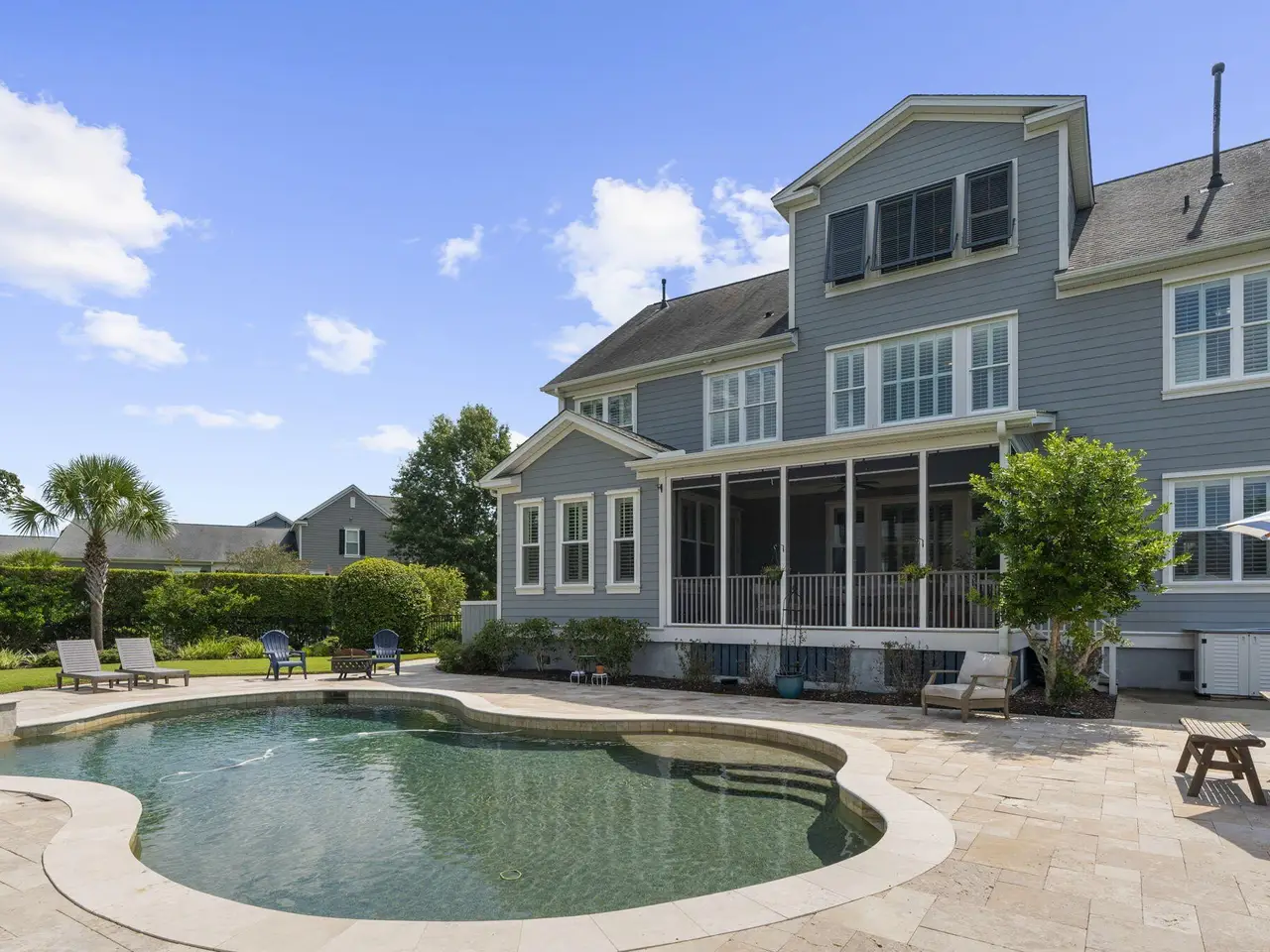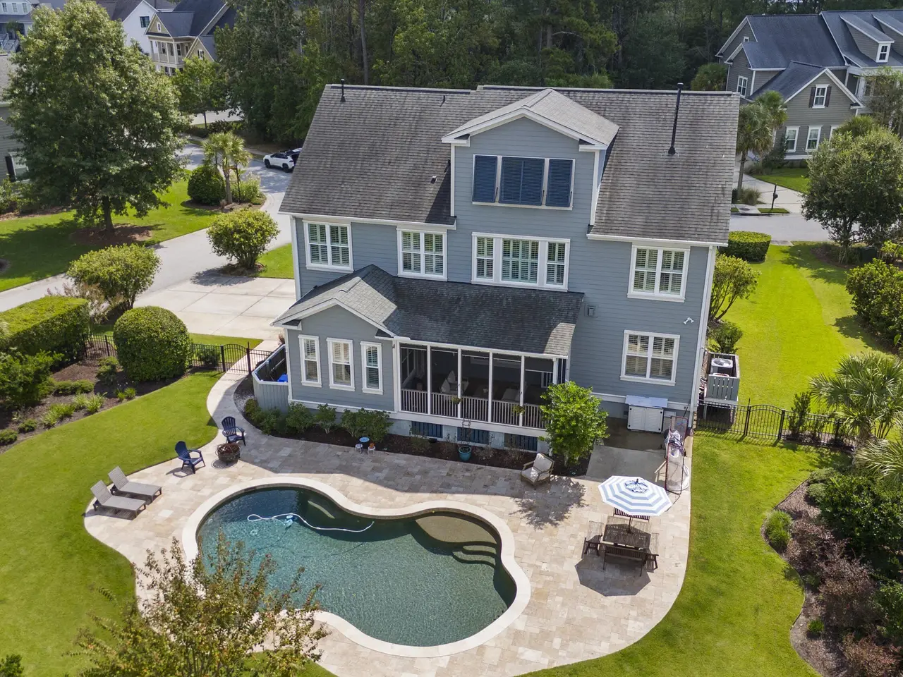 Enjoy resort-style living in The Harbour section of Dunes West, Mount Pleasant's only neighborhood with a gated entrance staffed by a security guard, offering an extra sense of comfort and privacy in a serene, island club-caliber setting--where the focus is on relaxation, recreation, and community. 2991 River Vista Way is an elegant seven bedroom five bathroom home offering over 4,200 square feet of refined living on an expansive pond-view corner lot. The first floor features a home office/sitting room, spacious kitchen, breakfast room, separate dining room, large living room, and guest bedroom and bath. On the second floor are five additional bedrooms and three bathrooms, including a spacious primary bedroom with sitting area and spa-like primary bath. And on the third floor are the huge seventh bedroom and fifth bathroom, with abundant walk-in attic storage. The home's spectacular outdoor space features a screened porch overlooking a sparkling saltwater pool with a waterfall feature and travertine decking. A large two-car garage rounds out the offering. Beyond the home itself, the Dunes West neighborhood offers an unmatched lifestyle with secured entry, walkable access to exceptional amenities including a golf course, swimming pool, tennis courts, walking and jogging trails and a clubhouse with fitness center--and proximity to award-winning public schools. Combining spacious design, convenience, and a setting of natural beauty, this home embodies the very best of Mount Pleasant living.