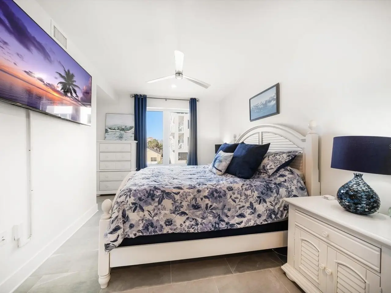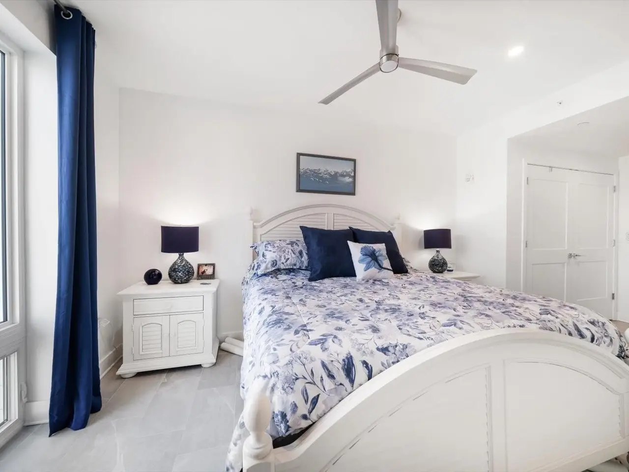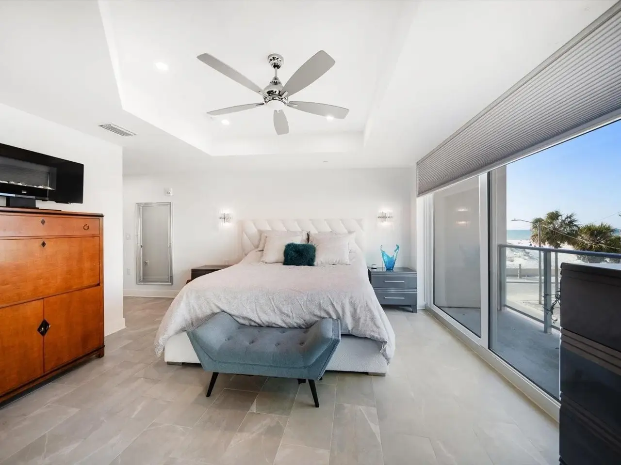 Motorized cellular shades in primary suite