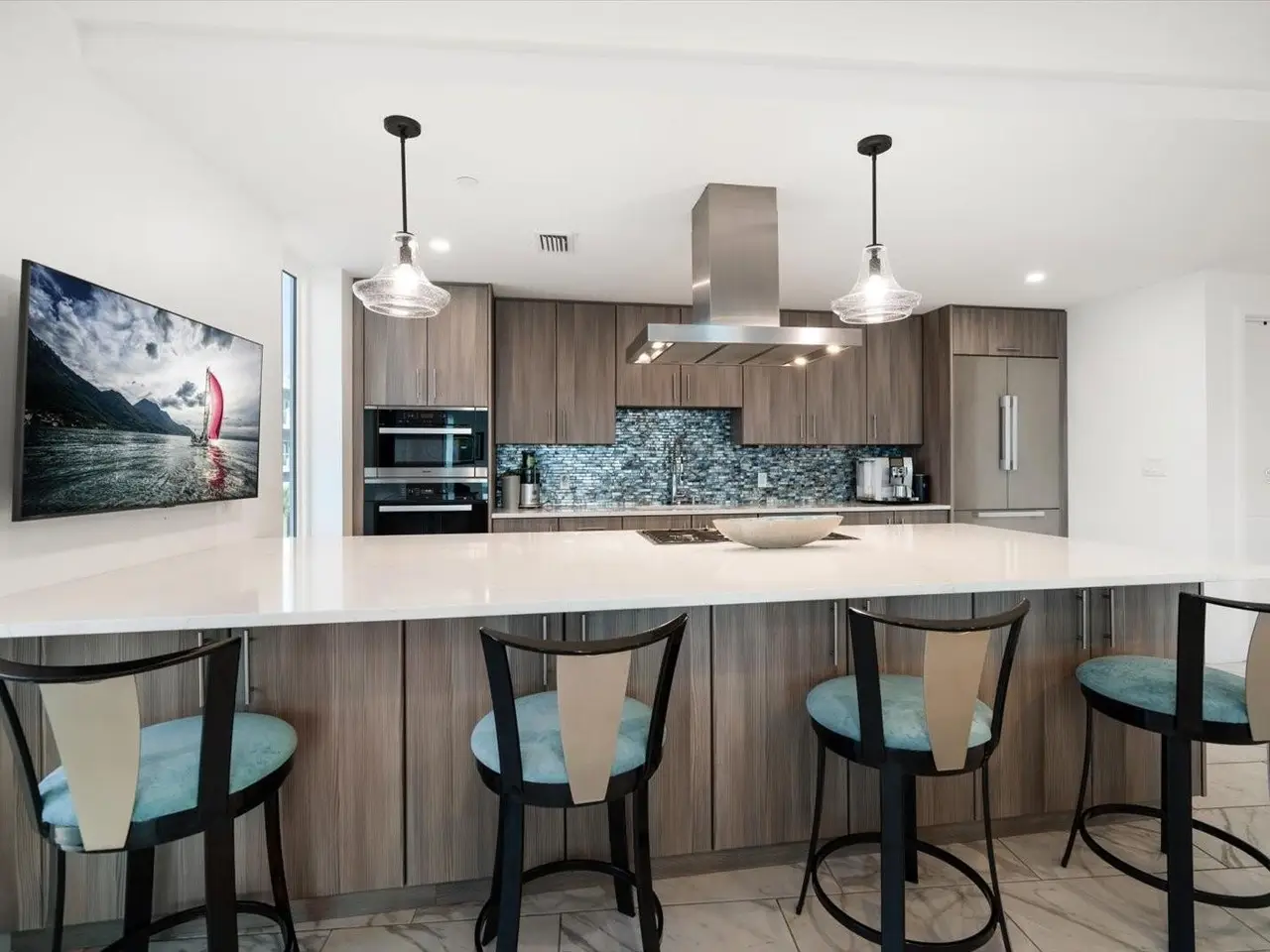 Oversized kitchen island with quartz countertops