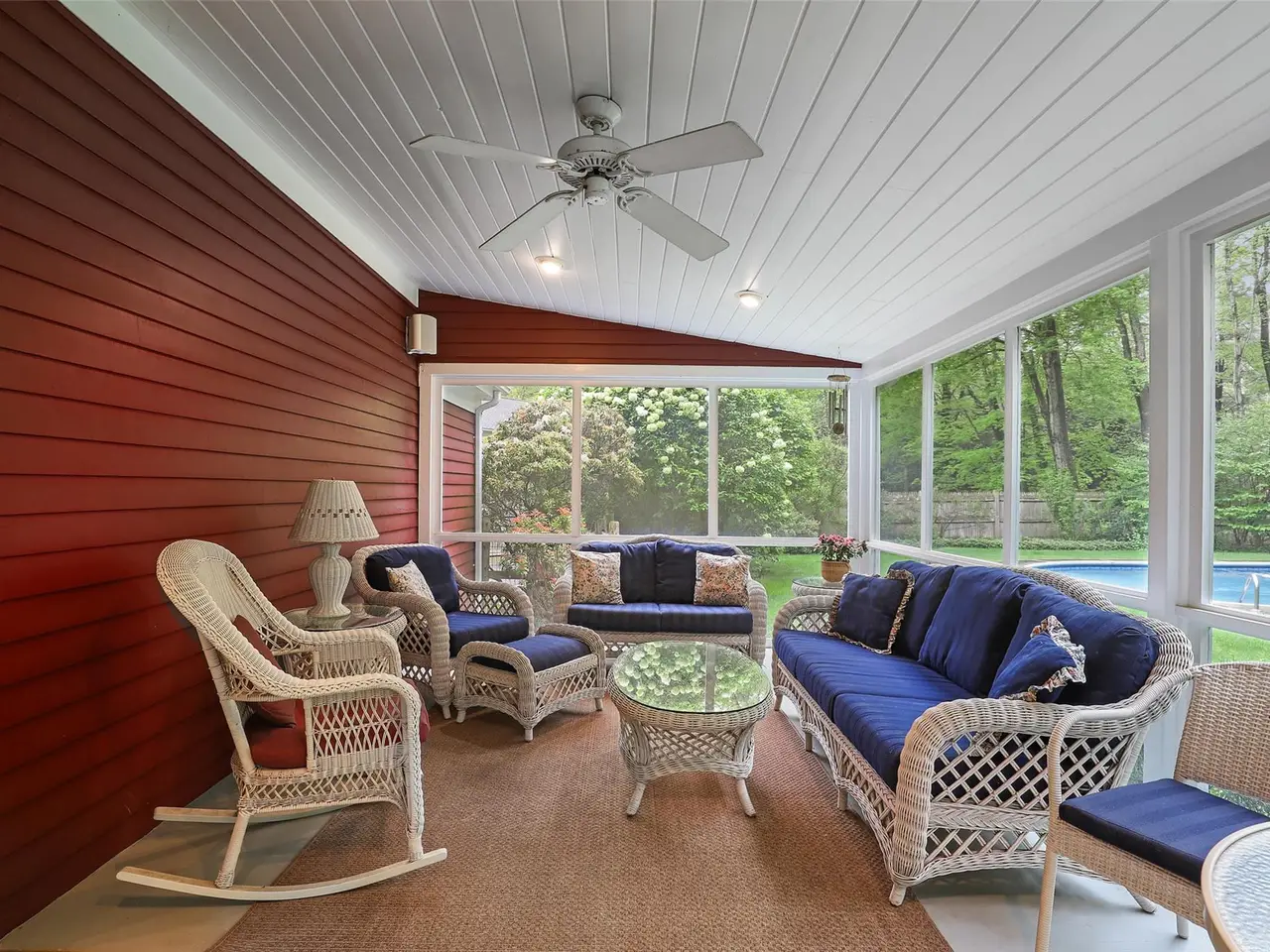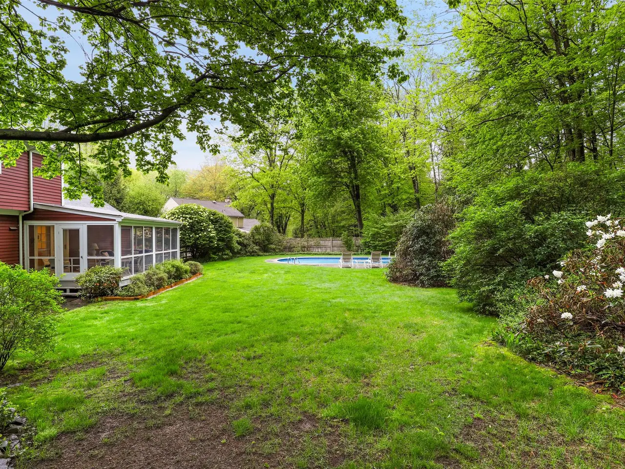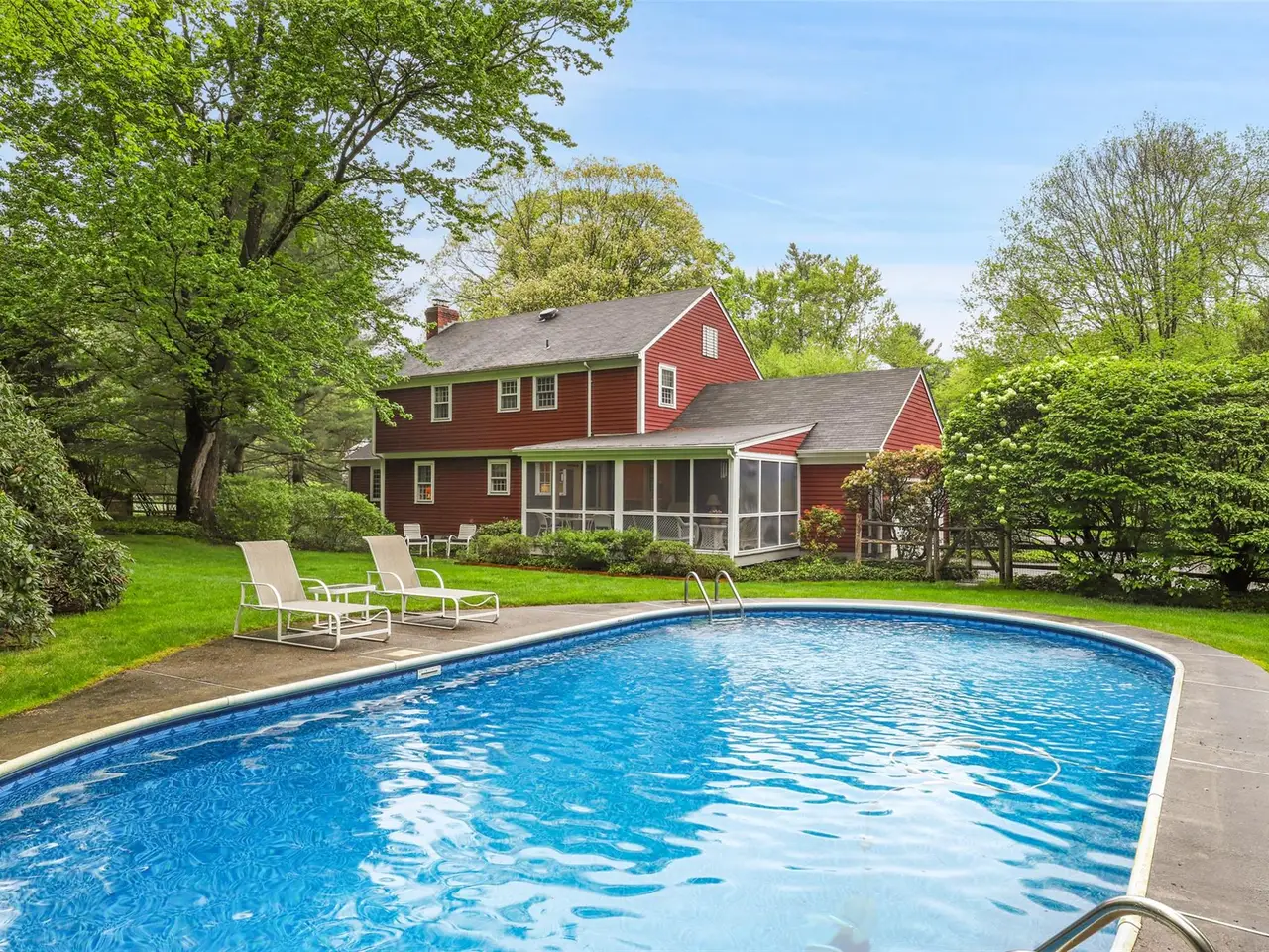 Classic charm meets modern convenience in this one-of-a-kind home. Quintessential Bedford Colonial nestled in Deepwood Estates, a sought-after enclave of 33 homes built in the late 1960s. Set on just under one acre of beautifully manicured perfectly flat property, in both the front and back. This classic residence offers an entry foyer and main level with formal dining room off the kitchen, a powder room, a formal living room with a fireplace and built in bookshelves, leading to the den. Stepping into the den you discover a unique piece of Bedford history, with original wood beams and a mantle over the fireplace built with reclaimed wood from the third Bedford Presbyterian Church, built circa 1780. The upper-level features 4 bedrooms, including a spacious primary suite with walk-in closet and ensuite bath, plus three additional bedrooms, a hall bath and a pull-down attic. Serene, tranquil and private is the screened-in sunroom addition off the kitchen and the inviting inground pool in the lush backyard, the ideal setting for outdoor living and entertaining. Central air, above-ground oil tank, 2-car garage, and a portable generator provide modern comfort and peace of mind. Whether you love it as-is or envision an expanded dream home this property is a rare find. A true MUST SEE in a storybook setting!