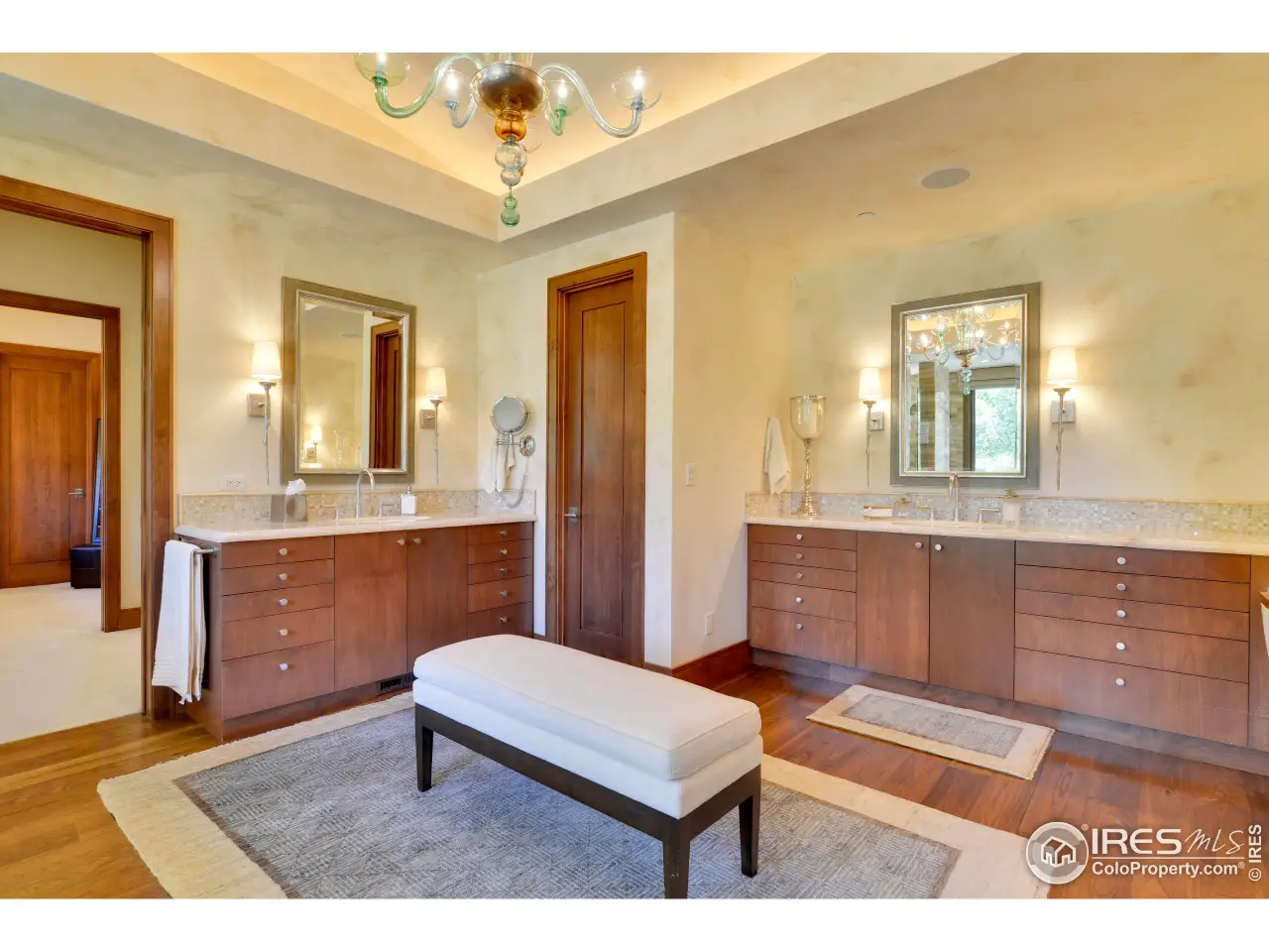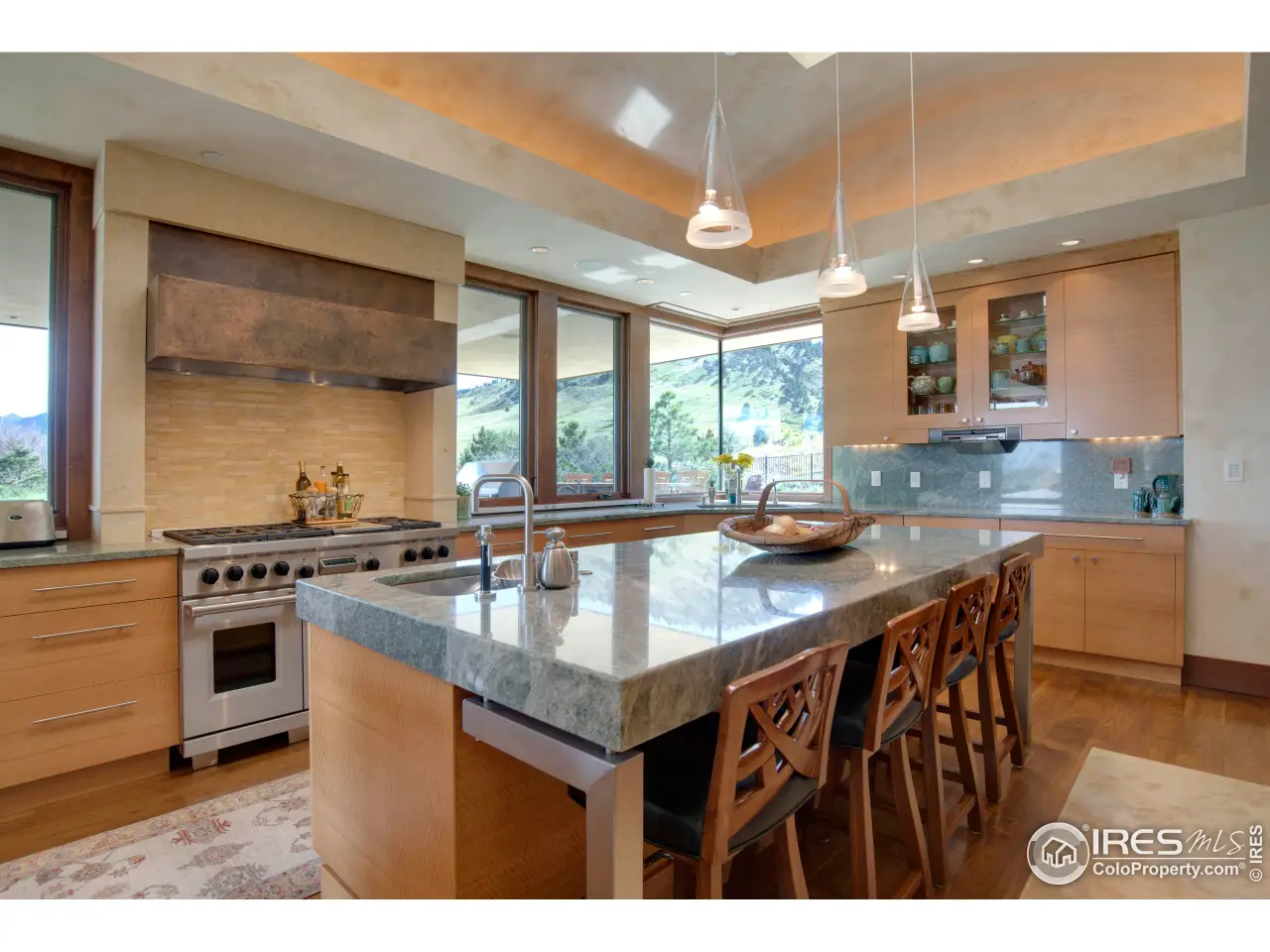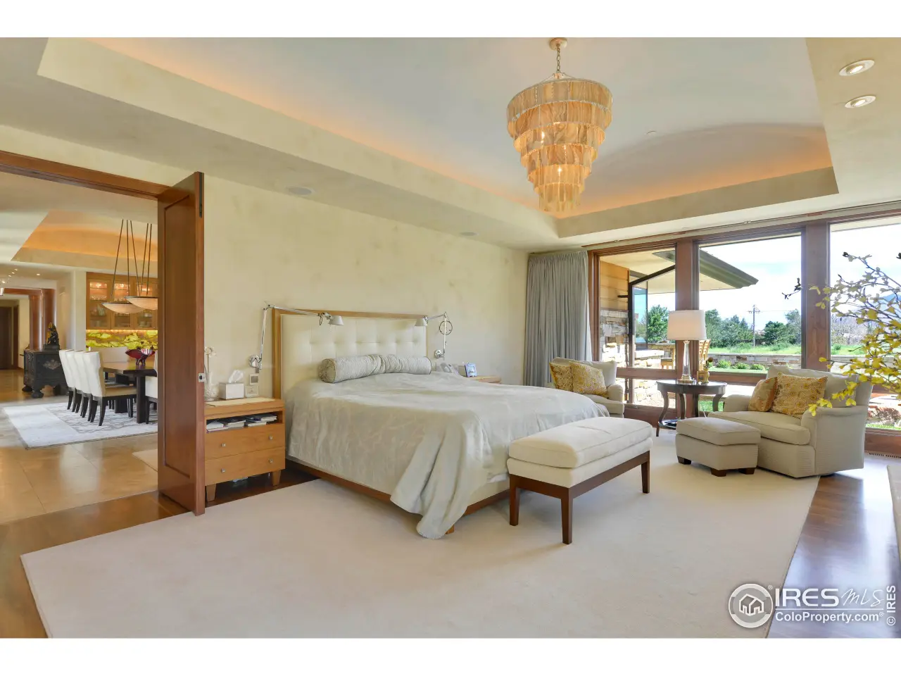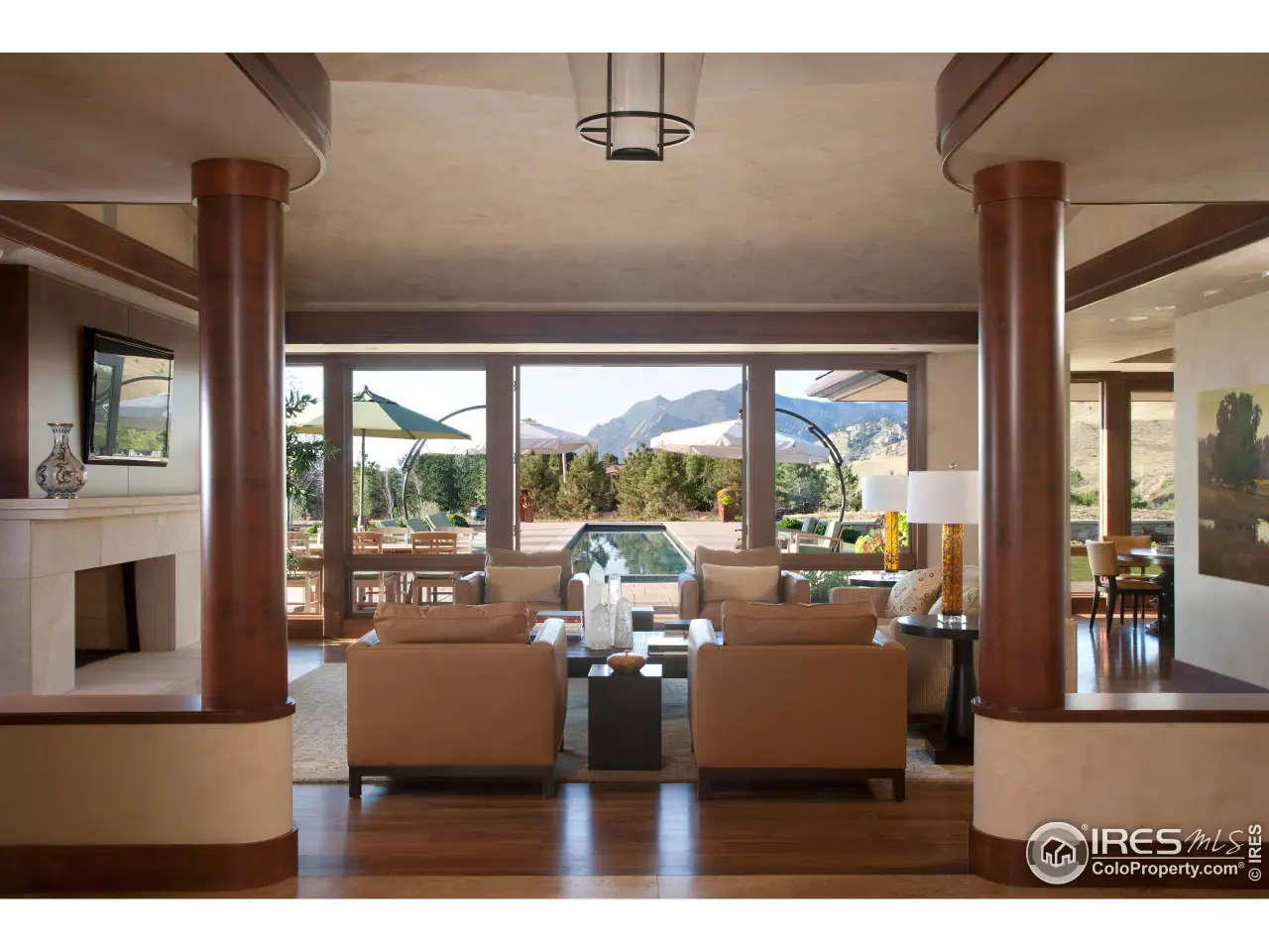 One of the premier residences on Colorado's Front Range. Inspired five-acre setting nestled against the foothills yet just blocks from restaurants, bakery, coffee shops. Sweeping views throughout this dramatic 8,700 square foot home. No expense spared - built by Tim Harrington, arguably the preeminent builder of Boulder's finest homes. Four limestone fireplaces, custom millwork, venetian plaster walls, travertine and walnut floors, and state-of-the-art systems throughout. Chef's kitchen with double islands, walk-in and butler pantries, Wolf and Sub-Zero appliances, Miele coffee. Exquisite primary retreat with postcard views, striking fireplace, onyx and marble bath. Resort-like amenities redefine outdoor luxury - 90-foot lap pool and hot tub surrounded by 100-foot-long stone deck, al fresco Viking kitchen, water features, terraced lawns, fire pit. Three-car garage plus six-car show garage. Blending naturally with the adjacent foothills - gated and private for tranquil seclusion.