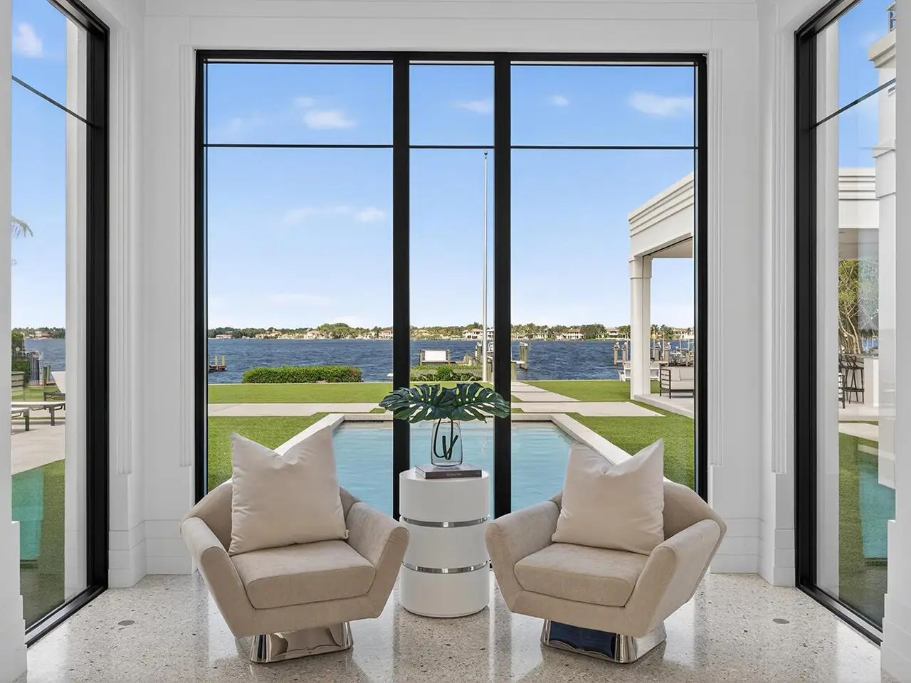 Experience the art of luxury living in this spectacular modern estate on the scenic Loxahatchee River in Jupiter, Florida. Tucked away on a private street, this custom-built masterpiece blends architectural sophistication, advanced technology, and the serene beauty of South Florida waterfront living.Beyond the stately gates, the resort-style setting offers 127' of waterfrontage, a covered outdoor kitchen with large island and seating area and a 20' x 40' pool with spa. The meticulously landscaped grounds feature artificial turf lawns ensuring a pristine look year-round. The private dock, with boat lift and floating dock for smaller boats, provides direct boating access to the Intracoastal Waterway and the Atlantic Oceanaperfect for those who treasure the coastal lifestyle.