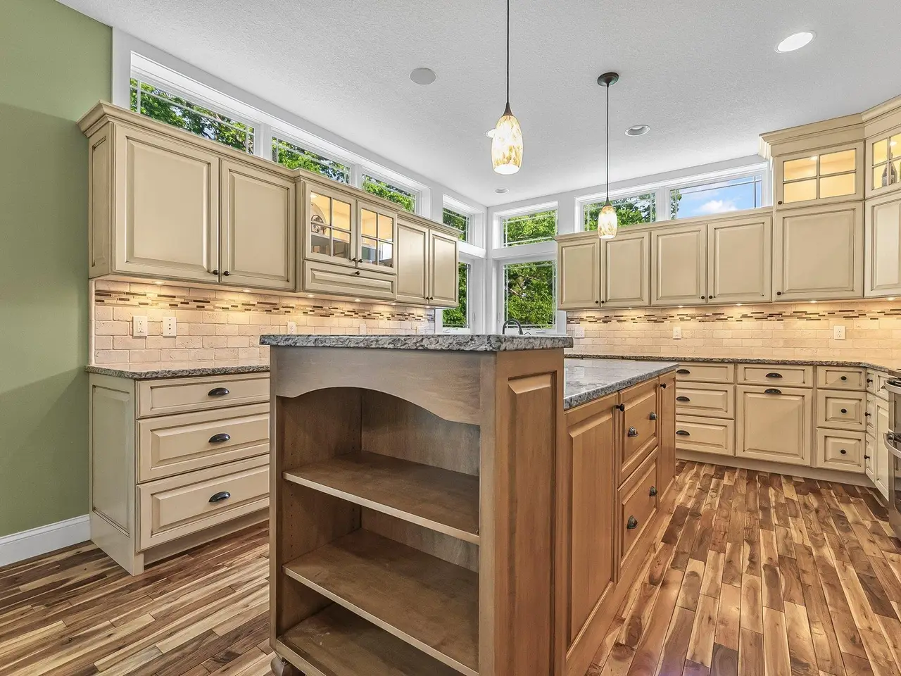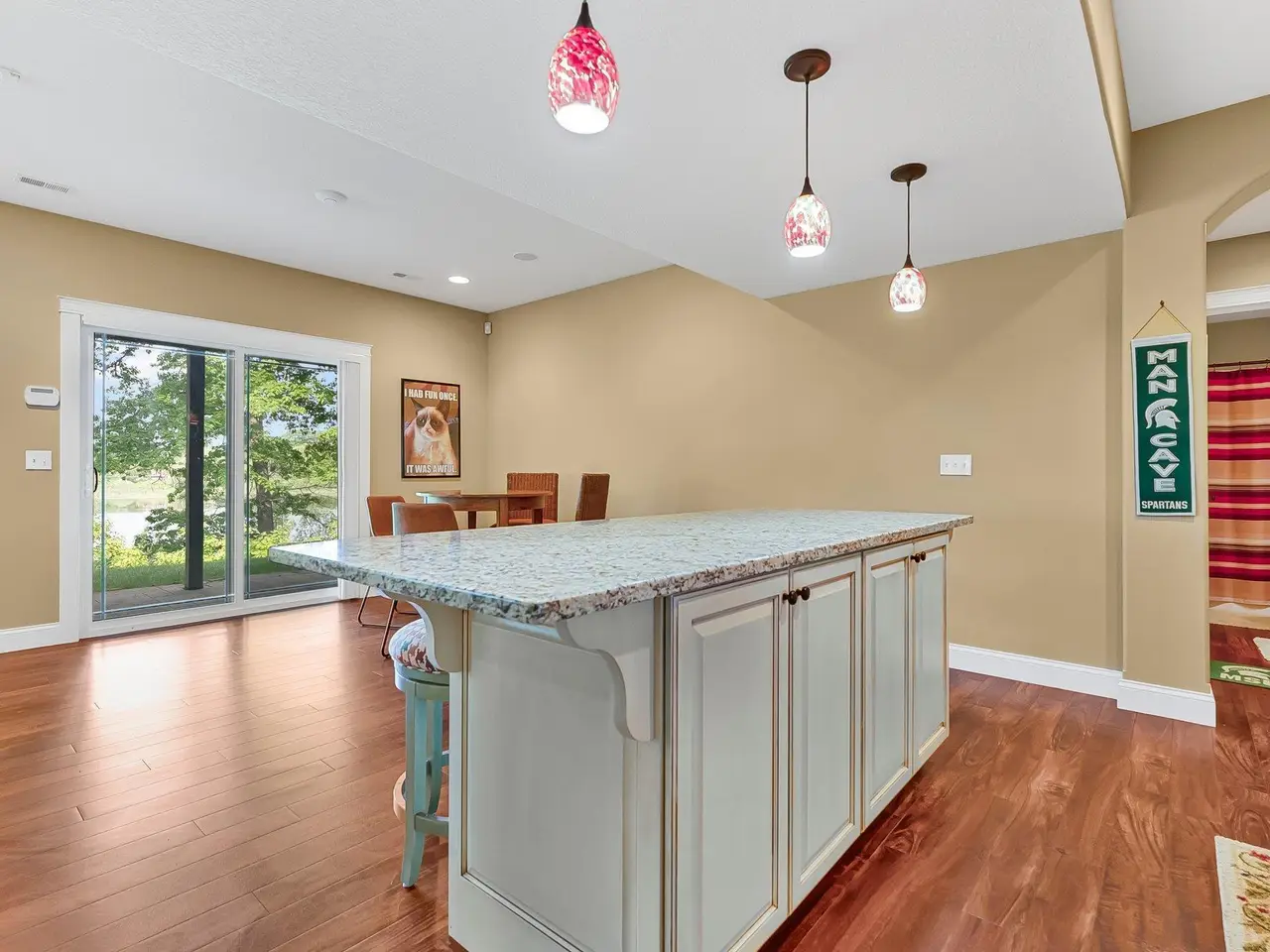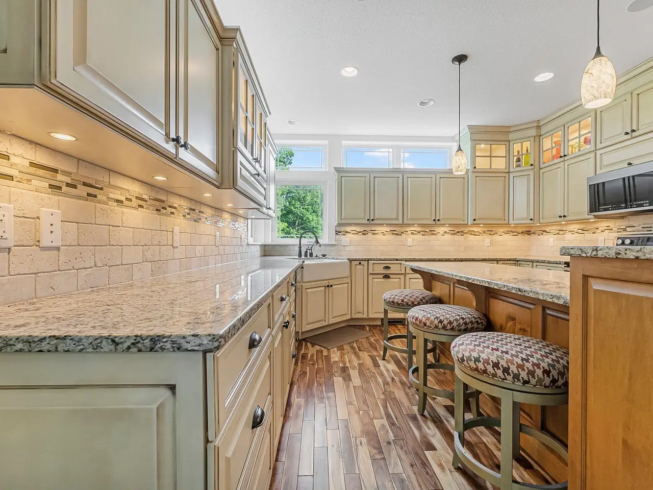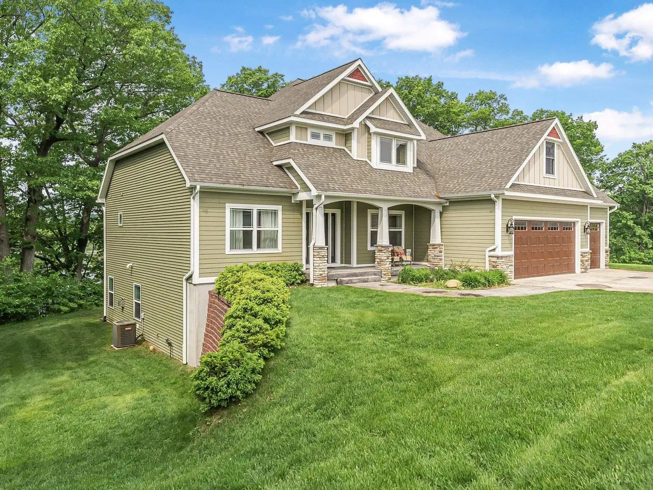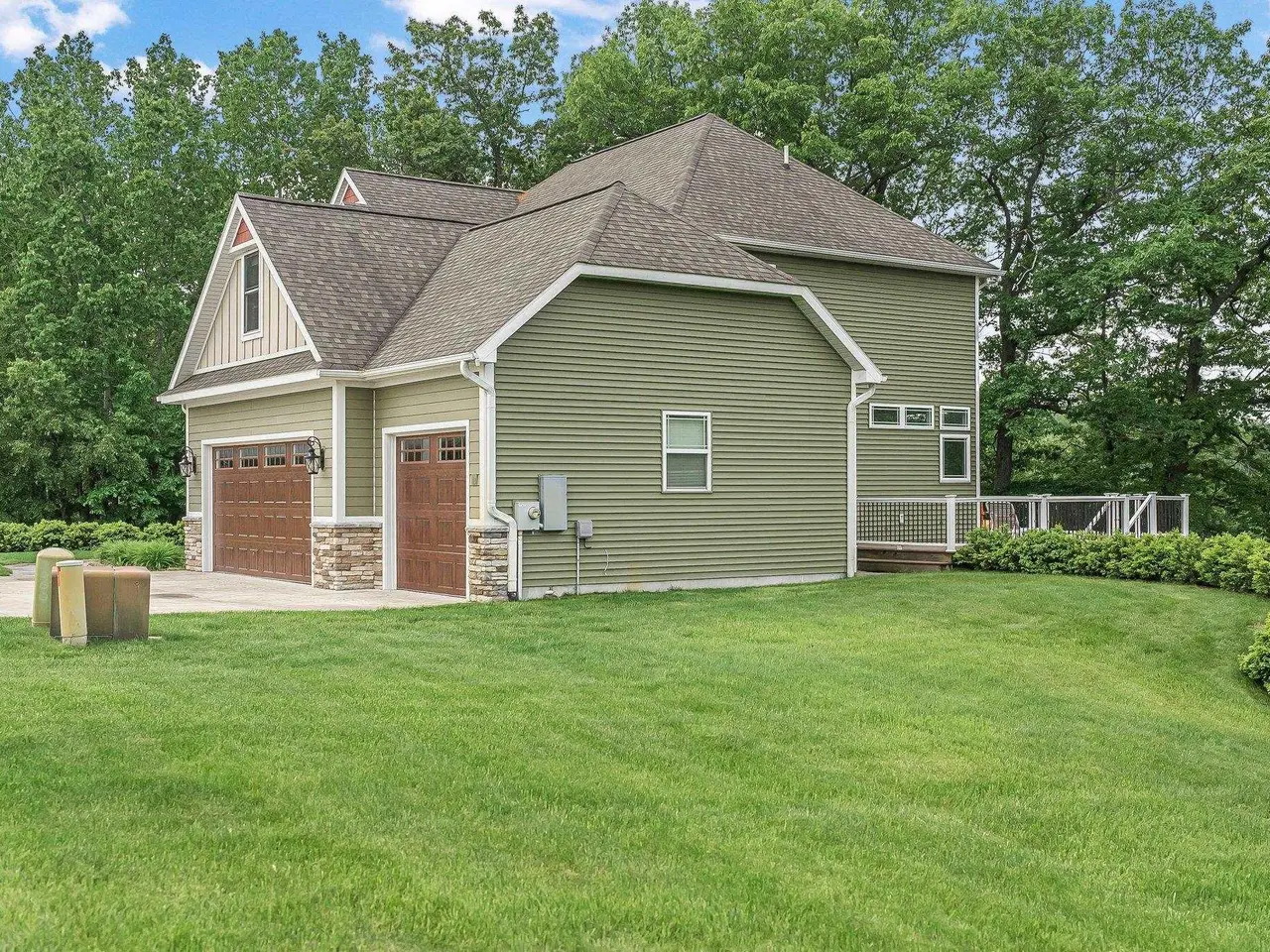 Experience luxury lakefront living in this stunning 5-bedroom, 4.5-bath home on Huellmantel Lake, featuring vaulted ceilings, breathtaking water views, and an open-concept living room. The gourmet kitchen offers top-of-the-line Wooden Hammer cabinetry, granite countertops, and a spacious island, along with an elegant foyer, mudroom, and main floor laundry. Enjoy two private office spaces, a main-level en suite, and a walk-out lower level with a large family room and wet bar. Complete with a 3-car garage and private lake frontage, this home combines comfort, style, and an unbeatable setting.