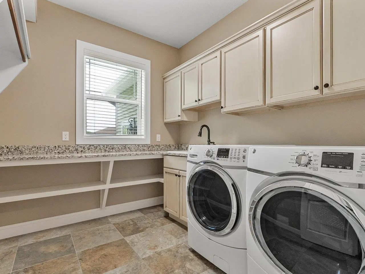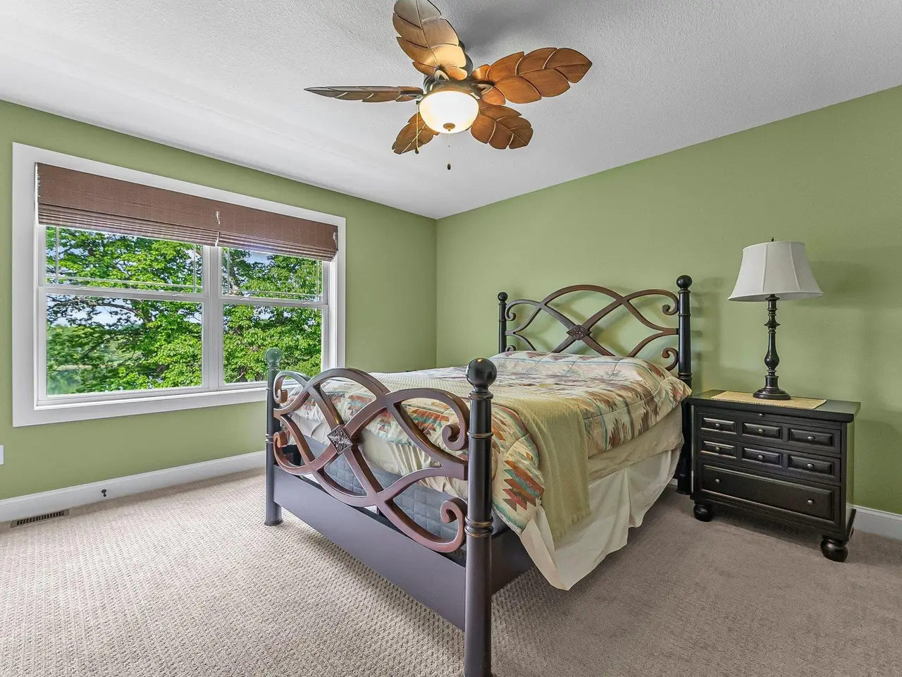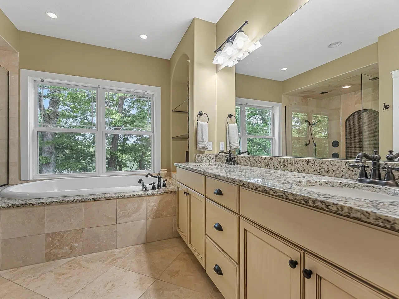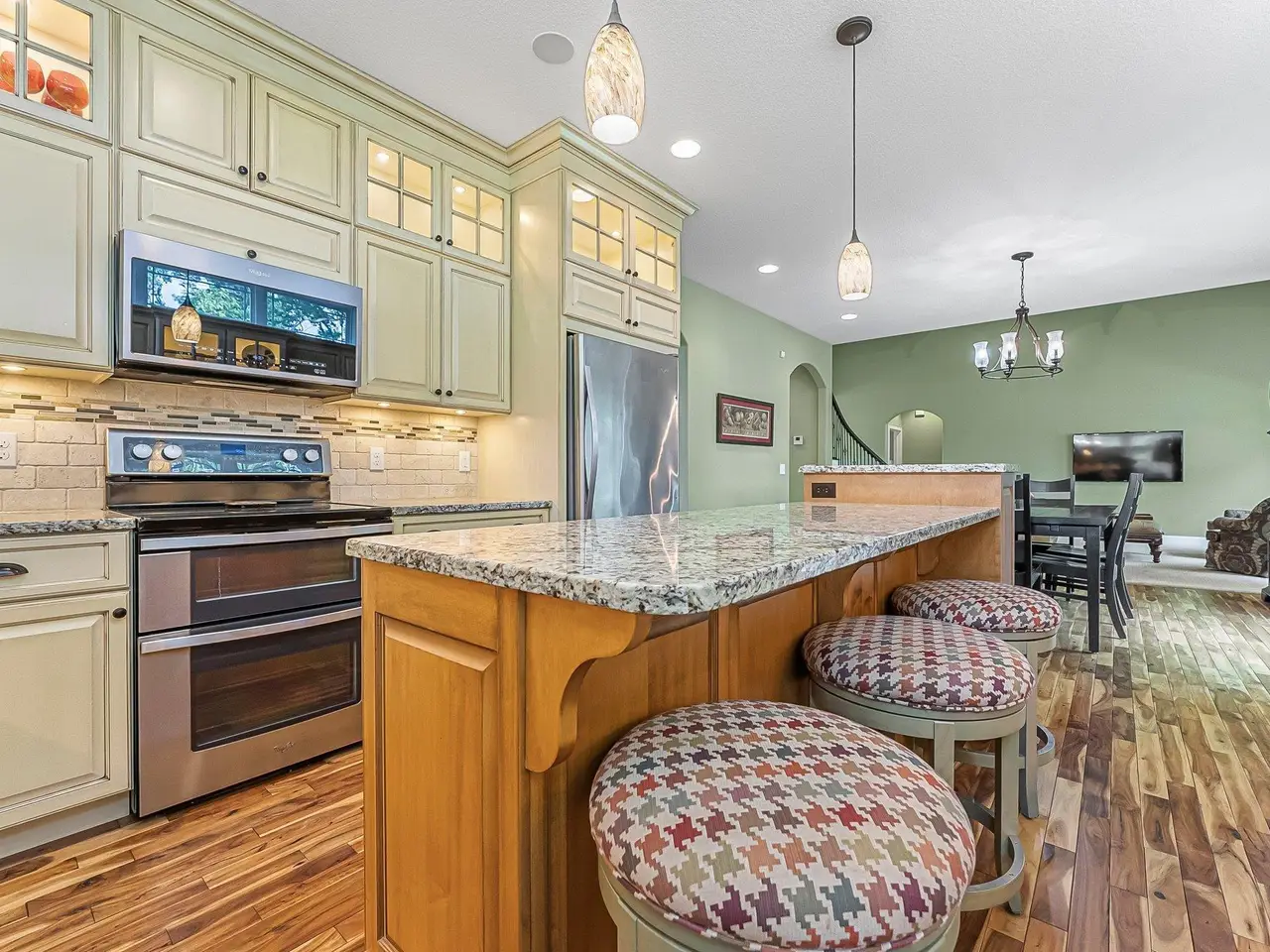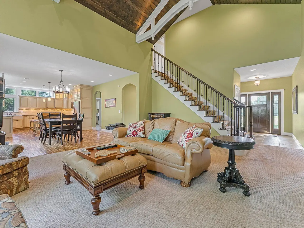 Experience luxury lakefront living in this stunning 5-bedroom, 4.5-bath home on Huellmantel Lake, featuring vaulted ceilings, breathtaking water views, and an open-concept living room. The gourmet kitchen offers top-of-the-line Wooden Hammer cabinetry, granite countertops, and a spacious island, along with an elegant foyer, mudroom, and main floor laundry. Enjoy two private office spaces, a main-level en suite, and a walk-out lower level with a large family room and wet bar. Complete with a 3-car garage and private lake frontage, this home combines comfort, style, and an unbeatable setting.