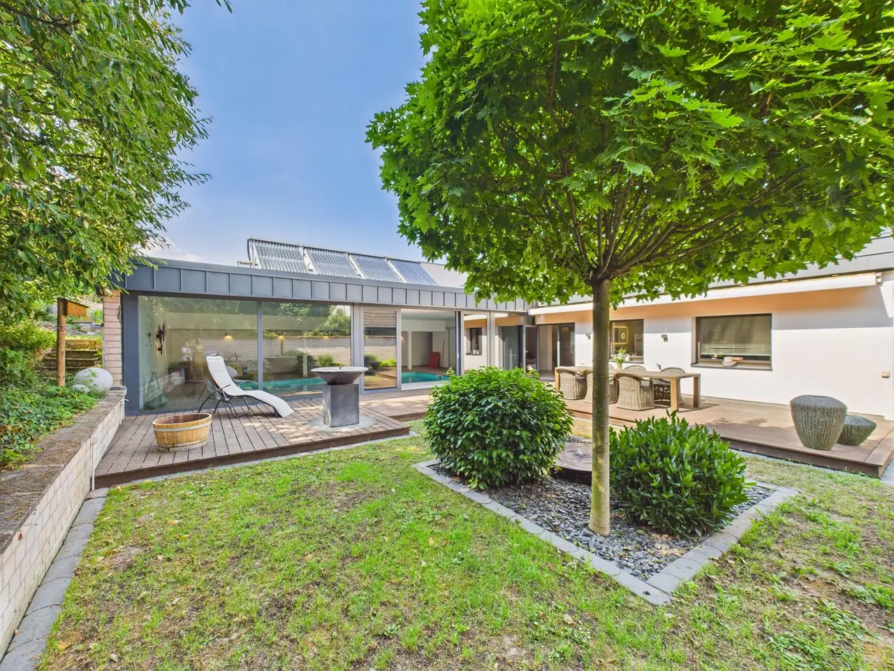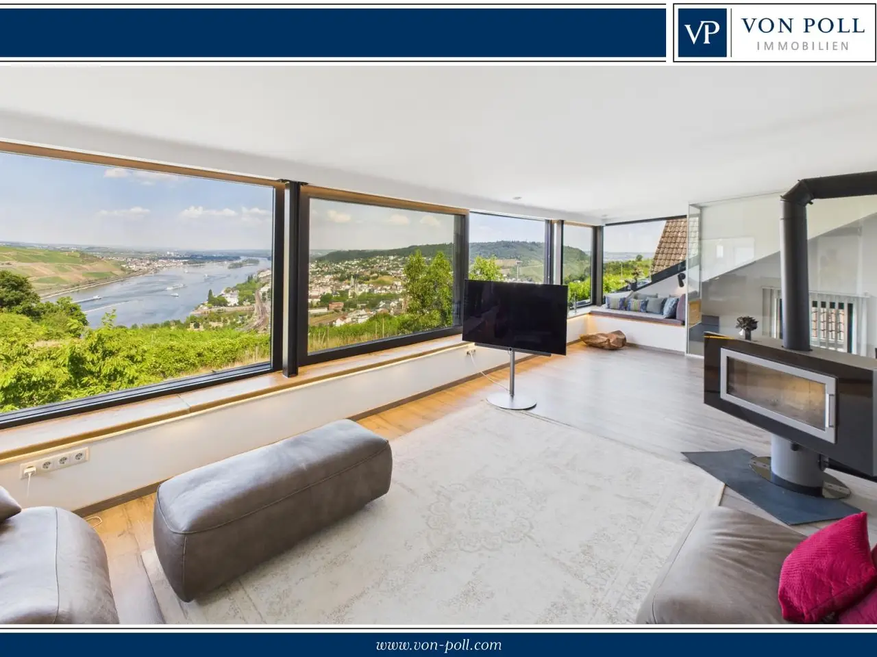 Welcome to your new home - a light-flooded property in a prime location in Bingen am Rhein. This stylish and well-kept house from 1974, which was extensively renovated in 2017, impresses with a successful combination of modern living comfort and spectacular panoramic views. Situated on a lovingly landscaped plot of approx. 778 m², the property offers a living space of approx. 351 m² and approx. 190 m² of usable space, spread over six generously proportioned rooms. The house is ideal as a family home and offers plenty of space for personal development. The inviting entrance area leads directly into the open-plan living and dining area, where a high-quality fitted kitchen offers space for culinary delights. The adjoining large window front with direct access to the terrace not only provides plenty of natural light, but also opens up a breathtaking view of the picturesque landscape of Bingen, the Rhine and, on a clear day, even as far as Frankfurt am Main. The first floor is complemented by a guest WC, two stylish bathrooms and two further well-designed rooms that can be used flexibly. A special highlight is the private relaxation and spa area, which invites you to enjoy relaxing moments within your own four walls. The adjoining terrace with sheltered garden area offers a peaceful outdoor retreat - ideal for lingering and enjoying. Another architectural highlight awaits you on the upper floor. Here you will find a spacious TV and relaxation room with a cozy fireplace corner and a light-flooded work area that extends across the entire Rhine front thanks to floor-to-ceiling windows. The open design of these rooms creates an inviting and versatile atmosphere - perfect for concentrated work, leisurely reading or relaxing. This level is completed by a daylight bathroom, a bedroom with dressing room and a direct view of the Rhine from the bed - an incomparable sight that will delight visual connoisseurs in particular. The house also offers generous possibilities in the basement. The rooms are spacious and offer ample storage space for hobbies, storage or housekeeping. A double garage and the parking spaces in front of it ensure maximum convenience in everyday life. The location of the property impresses with its quiet, mature neighborhood and at the same time its proximity to all important infrastructure such as schools, shopping facilities and public transport. This special property combines generous living space, modern facilities and a location that offers both tranquillity and proximity to urban life. If you are looking for a bright, spacious home with exceptional views and plenty of room for you and your family, then this house is just right for you. We would be happy to arrange a personal viewing so that you can see the benefits of this unique property for yourself.
