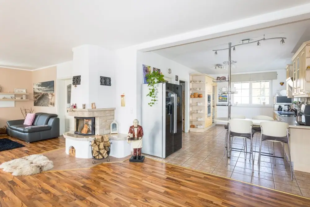 In one of the most beautiful locations not far from the capital, this very well-kept detached house, built in 2001, stands on a magnificent plot with a beautifully landscaped garden of approx. 1,550 m². The approx. 200 m² of living space is spread over two floors, plus the very usable basement with an area of approx. 100 m². The solidly built house offers you an upscale living ambience throughout the interior! Right down to the smallest detail, this house impresses with its high technical standard, high-quality fixtures and fittings and special features! The well thought-out floor plan and the perfectly designed outdoor area are also impressive. The first floor welcomes you with a radiantly spacious entrance area. The living room with open fitted kitchen, large windows and sun terrace is both cozy and bright. From the terrace, you have direct access to the beautiful garden. The living room is particularly cozy on cold winter days thanks to its wood-burning stove. There is also a spacious shower room and a storage room on the first floor. A solid wooden staircase leads you to the upper floor - here you have enough space for your family with three further rooms. The bathroom on the upper floor also impresses with its high-quality fittings and offers bathing fun for young and old. The basement, equipped with underfloor heating, leaves nothing to be desired. Whether office, living space or hobby - everything is possible. For high-speed home office or Smart TV, fiber optics will be available after completion. Access to the garden is also granted here via a floor-to-ceiling window element. The property is fenced with high-quality fence elements and access is convenient via an electric gate with remote control. The very well-kept garden has been lovingly landscaped and is supported by an irrigation system. At the rear of the large plot is the high-quality pool area in a sheltered location, allowing you absolute peace and privacy. A cover simplifies maintenance. The attractive offer is rounded off with several parking spaces and a large double garage with an enlarged usable area and adjoining workshop.