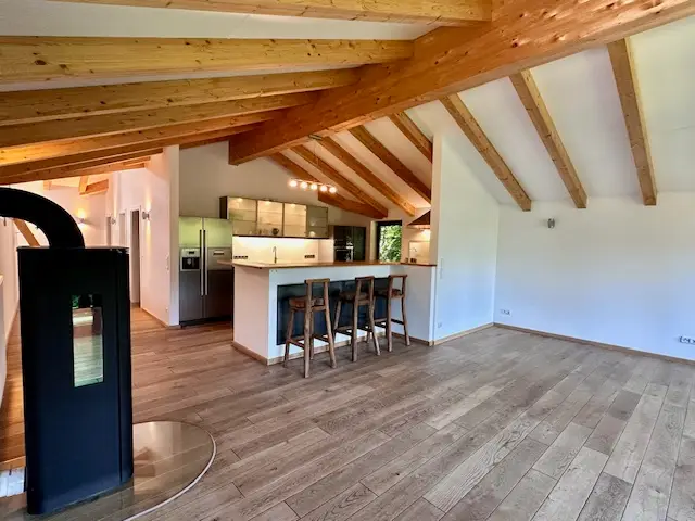 Those who arrive here immediately sense it: This country house is no ordinary home, but a place that combines security, history, and generosity. Located at the end of a quiet cul-de-sac in one of Garmisch-Partenkirchen's most beautiful residential areas, the property opens up like a little world of its own – sheltered, sunny, with unobstructed views of the majestic Wetterstein massif. This prestigious house was designed in 1964 by the renowned architect Hanns Ostler and built on a level plot of approximately 1,715 m². Twenty years later, it underwent a renovation and initial conversion, followed by an expansion and modernization in 2007. Today, the villa comprises more than 550 m² of living and usable space, which can be flexibly divided into up to four units – perfect for families, multi-generational rentals, or living and working under one roof. The moment you arrive, you immediately sense a sense of spaciousness: The electric roller shutter door opens onto a spacious courtyard surrounded by two heated garages. There's space for up to four vehicles before the path leads directly to the main entrance. There, you enter the house's largest and most prestigious residential unit. The architecture speaks of a time when rooms were designed with care and attention to detail. The large living area with a coat rack and guest toilet sets an impressive tone. From here, the view opens into the traditional country-style kitchen – cozy, functional, and equipped with a pantry. The real focal point, however, is the living areas: A spacious living room with panoramic windows, polished shell limestone floors, a historic wooden ceiling, and an open fireplace invites you to enjoy the changing seasons with all your senses. Through an open archway, you enter a true gem – a 300-year-old stone pine room from South Tyrol. With its ornamental ceiling and artfully crafted tiled stove, it exudes an incomparable warmth. This room is not just a living and dining room, but also a retreat, a hearth, a spiritual retreat. Large sliding glass elements connect the interior with the exterior, opening onto sunny southwest-facing terraces and the spacious garden. Peace and privacy are guaranteed here – a place to pause, breathe, and recharge. A few steps lead to the private part of this living unit. Two rooms, a dressing room, and a bathroom are grouped around the spacious master area. The master bedroom, with its private balcony, is particularly bright and offers breathtaking views of the Wetterstein massif, a place that inspires every day. A separate side entrance leads directly to the stairwell, which connects all levels of the house, allowing for flexible use of the various units. The garden level offers further possibilities: Here, a sunny 2-3-room unit with a small kitchen, bathroom, and two additional shower rooms is located. With direct access to the terrace and garden, this area is perfect for use as a granny flat or for professional work with client traffic – discreet, charming, and yet independent from the rest of the living area. Purely utility rooms (two cellars, boiler room, and laundry room) are located separately in the basement. The upper floor offers two light-filled residential units: an extremely charming three-room apartment with dark wood floorboards throughout, spacious sliding doors, and a fireplace. Two balconies – one facing south, a deep loggia facing east – make this apartment a sunny retreat with stunning views. Finally, the attic is the modern highlight of the house: Here, the roof was raised and a contemporary alpine loft was created in 2007. Open-plan design, exciting galleries, balconies in every room, a spacious designer bathroom with a steam shower, and an elegant kitchen with an island and counter – this area combines alpine charm with modern design. The Swedish stove, the oak floorboards throughout, and the exposed gable create an atmosphere that is both cozy and prestigious. The unobstructed view of the Wetterstein massif crowns this unique living experience. This house is more than just a country house – it's a place with history, soul, and perspective. Whether as a spacious family home, a multi-generational home, a combination of living and working, or for partial rental: the flexible floor plan opens up numerous possibilities. This traditional Ostlerhaus impresses with its impressive architecture, spacious grounds, and unique location offering peace, sunshine, and unobstructed mountain views. Here, privacy, nature, and prestigious living come together – a property of rare quality, designed to last for generations.