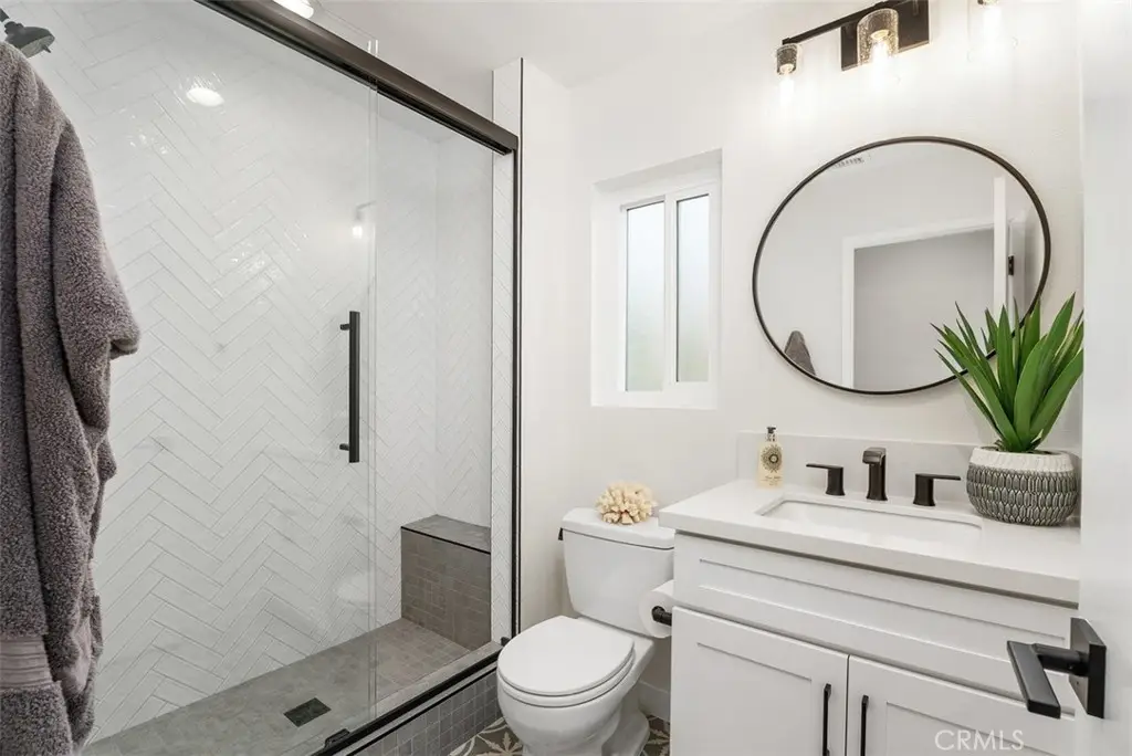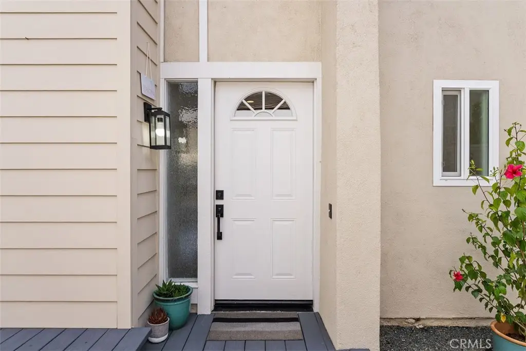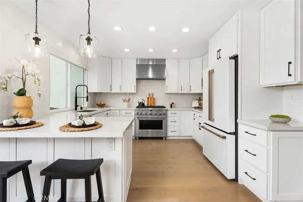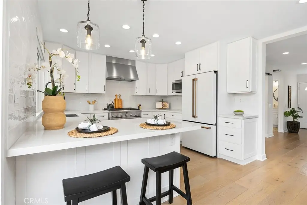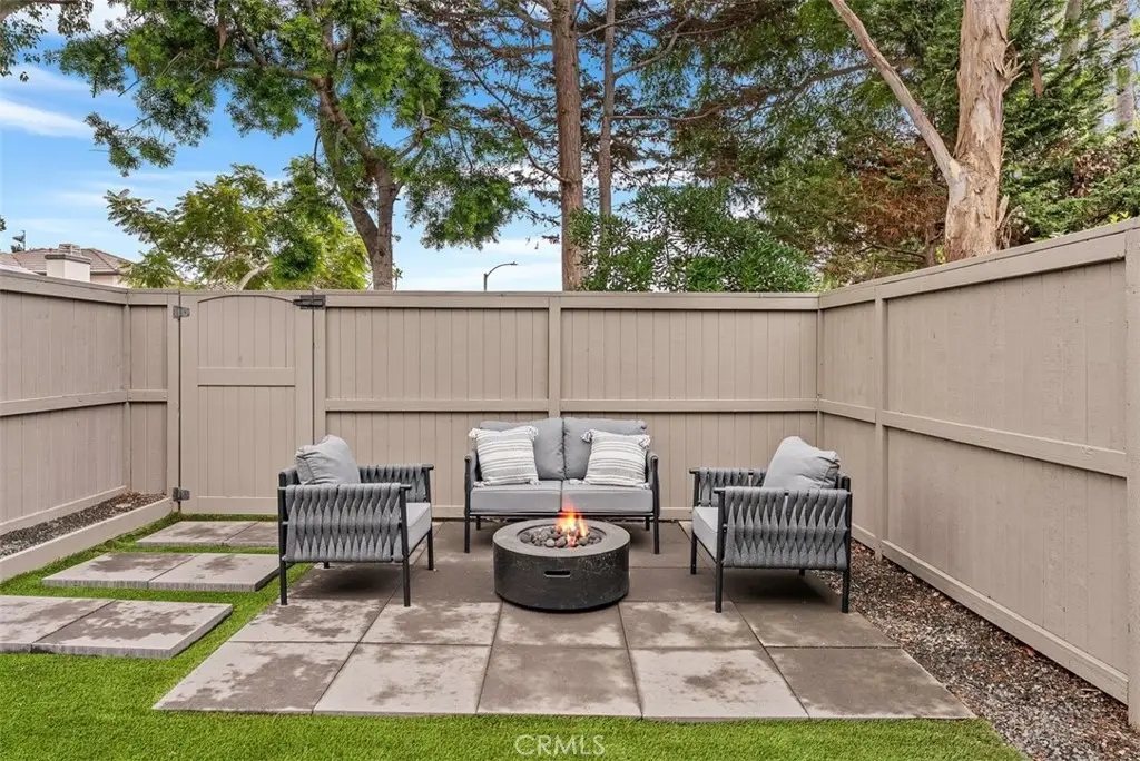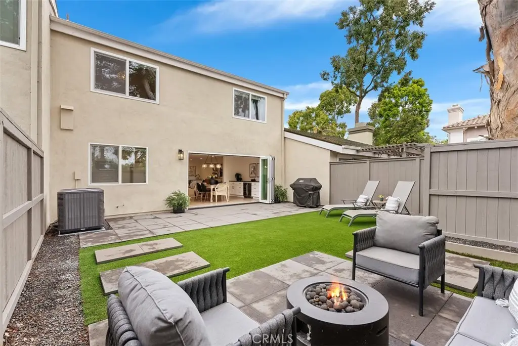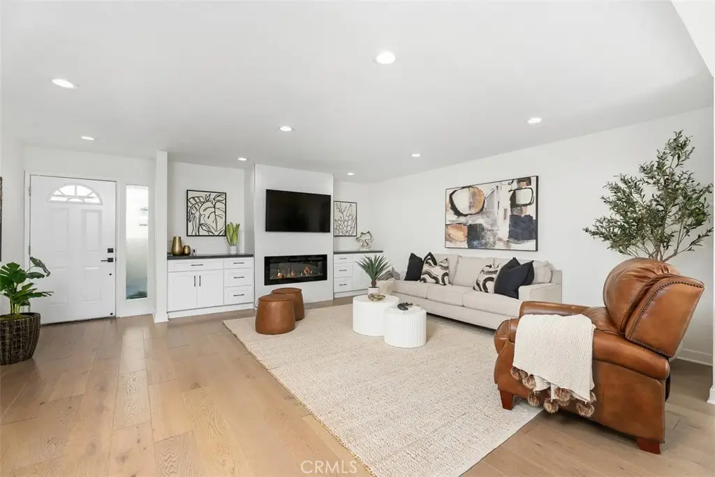 Beautifully remodeled down to the studs in 2021, this 3-bedroom, 3-bath single family attached home showcases high-end finishes from that renovation, including a quartz-topped built-in buffet with under-counter dual refrigeration, full home automation, new HVAC and ducting, new windows, recessed lighting and designer fixtures, and soft-close drawers and cabinets. Current upgrades include brand-new carpet, custom roller shades, epoxy garage floor, Noritz tankless water heater, and new built-in quartz-topped cabinetry that frames a sleek, modern tiled electric fireplace. The chef's kitchen boasts quartz countertops, breakfast bar, premium GE Cafe appliances, and a walk-in pantry with an additional lighted storage area under the staircase. The open, light-filled layout features beautiful hardwood flooring and flows through a 12-foot accordion glass door to a serene private backyard, perfect for indoor-outdoor entertaining. All bedrooms feature vaulted ceilings and abundant natural light. The primary suite includes a walk-in closet, dual vanities, and a large walk-in shower, while the downstairs bathroom also offers a spacious walk-in shower. Additional highlights include a gated private front patio with potential for a room addition connecting to the garage, overhead garage storage with utility sink and laundry hookups, and ADU potential within this Beachwalk community. The home is ideally located near one of the four additional satellite pools located throughout the neighborhood. Set on a quiet cul-de-sac with plentiful guest parking, residents enjoy the community's Jr. Olympic-sized saltwater pool, spas, saunas, lush greenbelts, sand volleyball courts, and newly renovated clubhouses. Access includes an automated gated entrance from 17th Street as well as non-gated guest access from Goldwest Street. Just minutes from the sand, Pacific City, top-rated schools, and all the amenities of Downtown Huntington Beach, this home delivers resort-style living and modern coastal elegance.