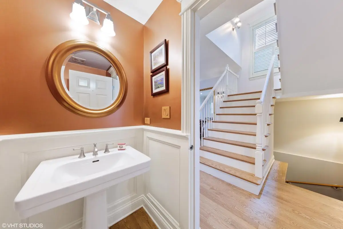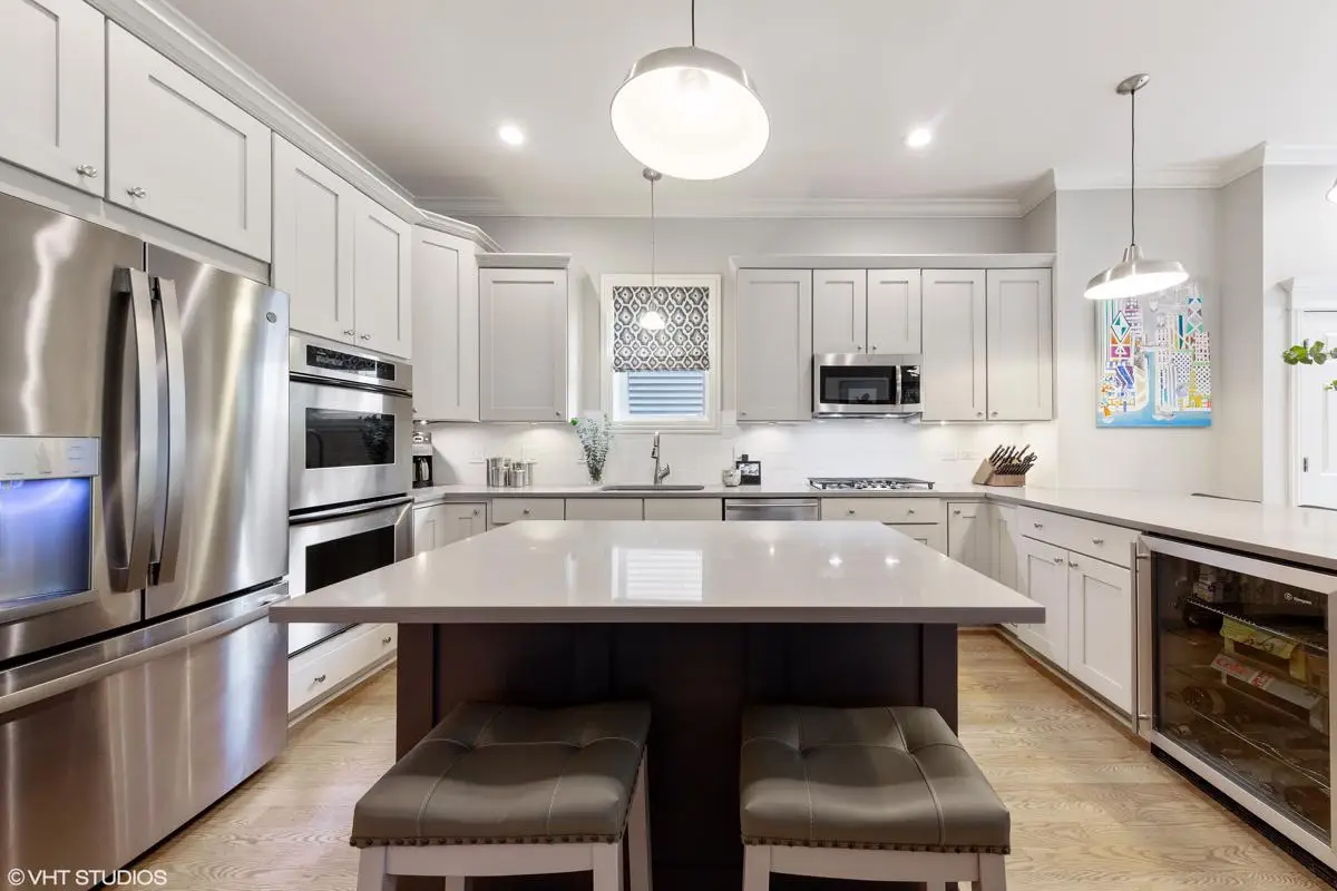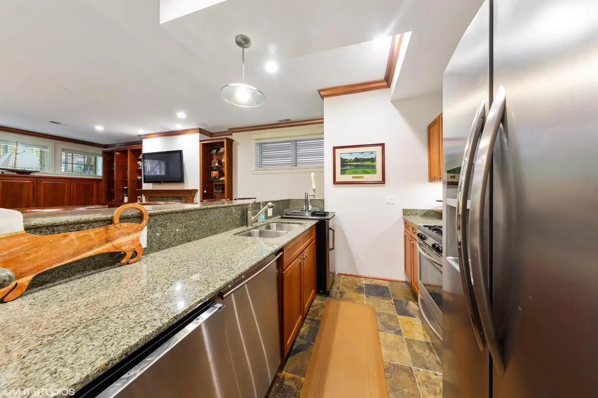 Gracious center staircase and powder room mark the passage to the open kitchen (quartz counters/new subway backsplash/stainless steel appliances) with island AND peninsula AND eating area. Family/great room offers bench seating flanked by pantry and coat closet and faces the second fireplace.