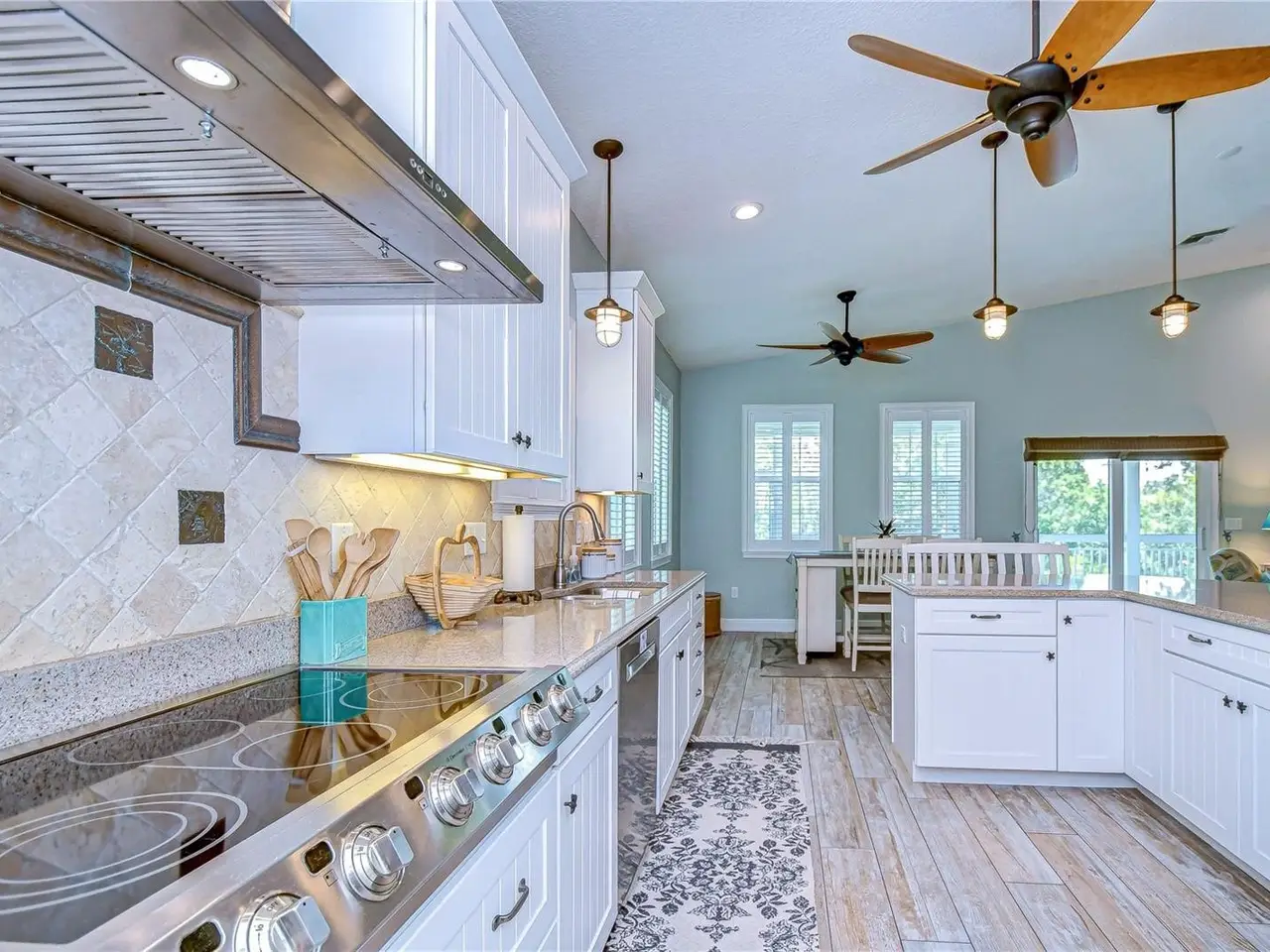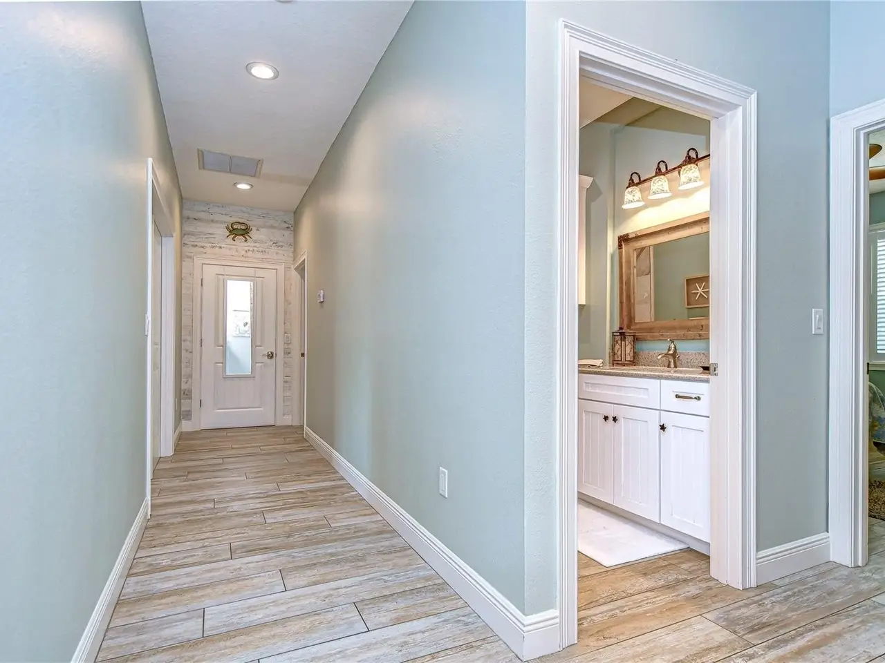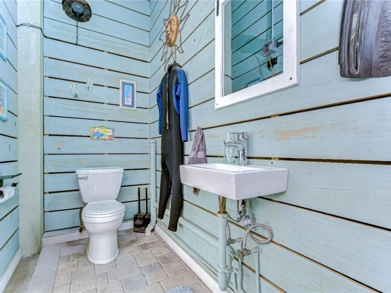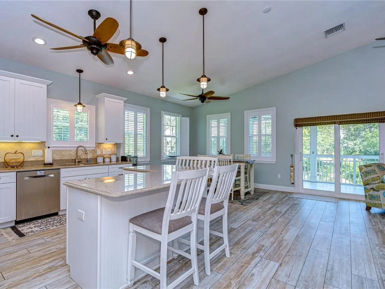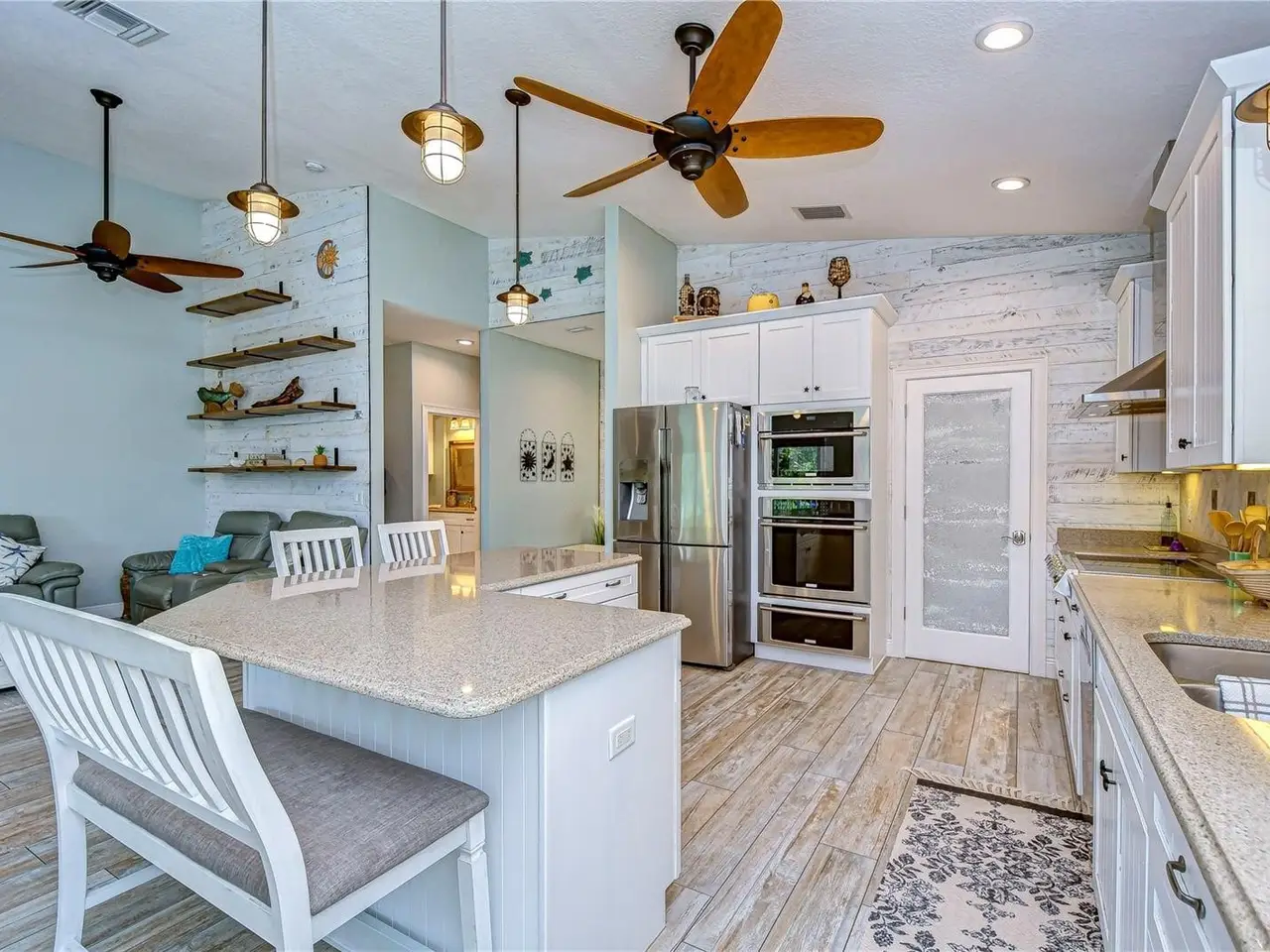 • Coastal-inspired shiplap walls and vaulted ceilings