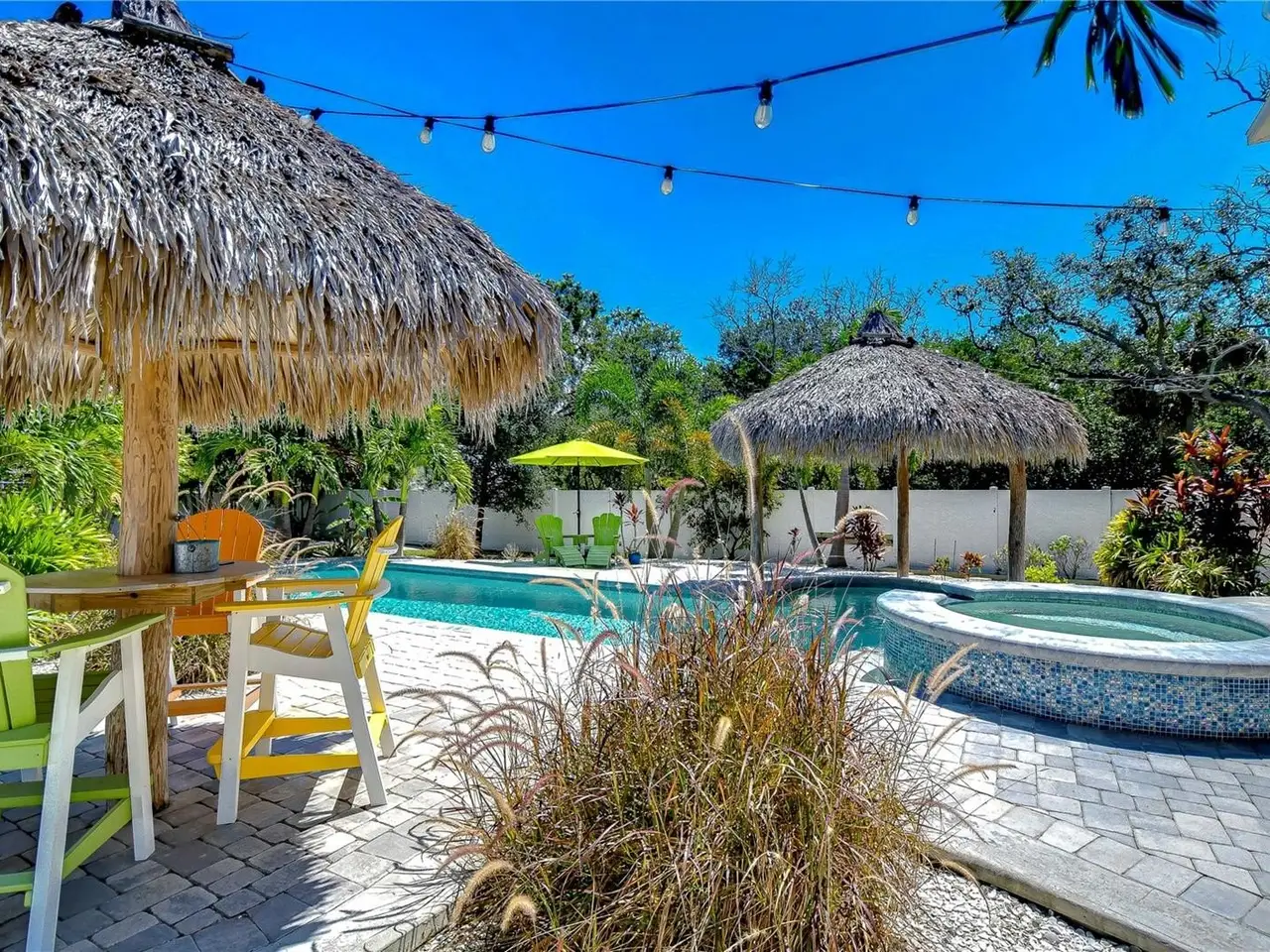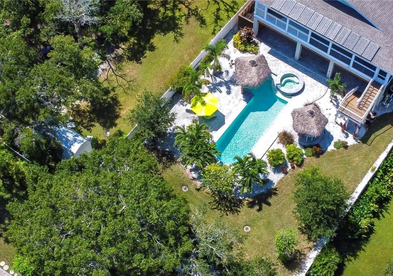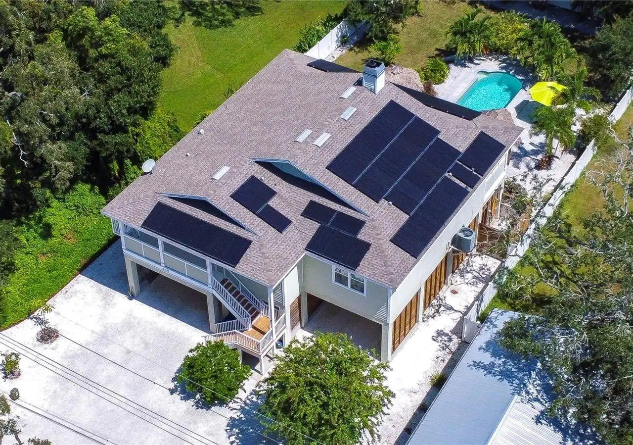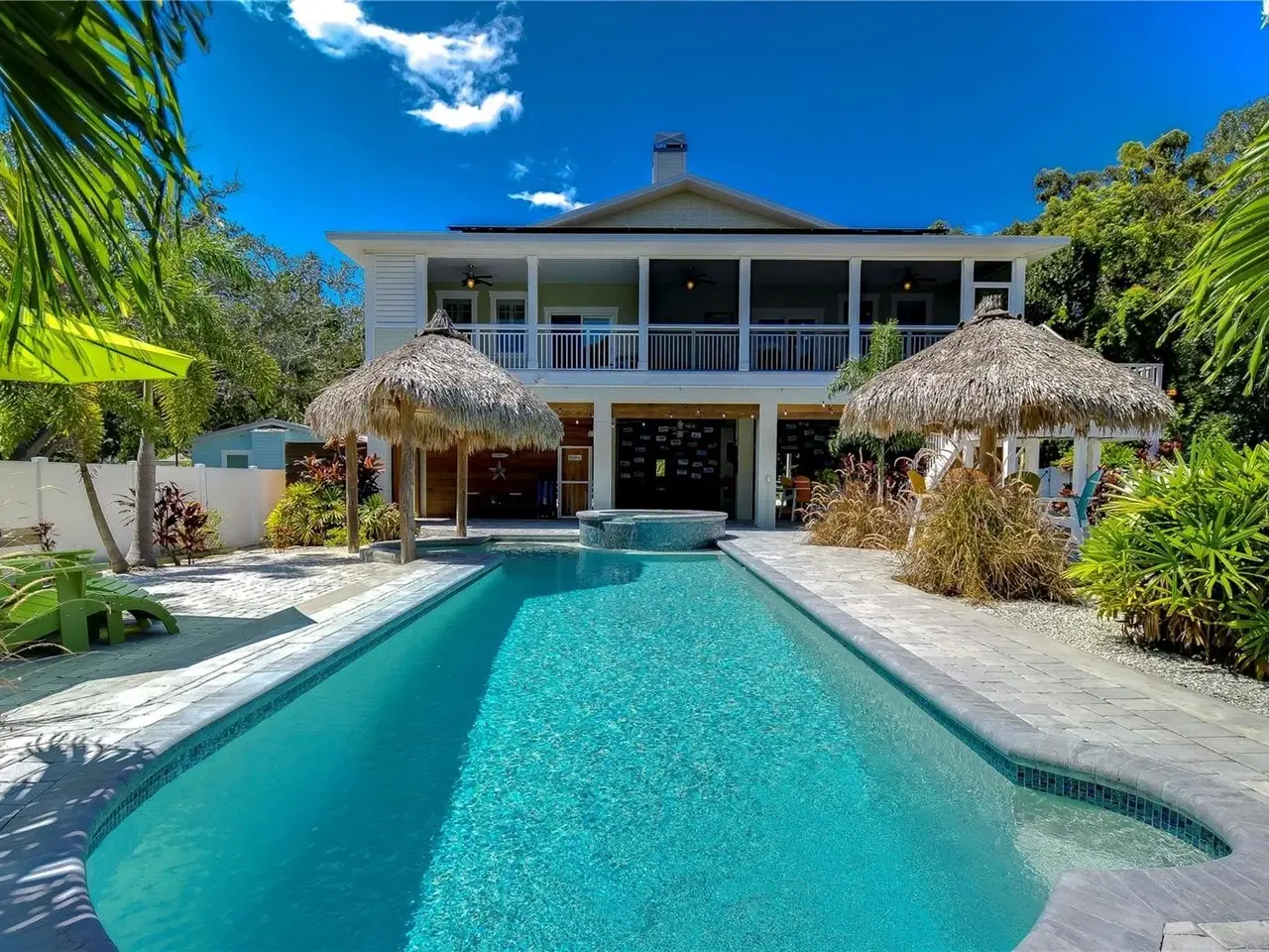 Experience upscale Coastal living in this elevated home...where meticulous construction meets comfortable luxury. Designed to embrace the Florida lifestyle inside and out, this wonderful property offers so much to enjoy.  From a Breezy, light and bright interior to a tropical oasis backyard, it was Custom designed and built in 2016 with impeccable attention to detail and fortified for strength. This private stilt home offers both casually luxurious living and peace of mind.  It proudly sits 17 feet above sea level on a private .32 acre lot and was constructed to rigorous FEMA standards.  Crafted for resilience and eco-conscious living, the home features Hurricane-rated impact windows and doors, 55 solar panels that keep electric bills to an astonishing $30 per month, 140-gallon propane tank powering on-demand hot water, a grill, and generator connections, and all of the under home lumber is desirable "saltwater splash" dock grade, and pilings, headers, footers are concrete. Inside you will discover a space that wows with high quality and uniquely designed finishes.. custom shiplap walls, barn door accents, soaring vaulted ceilings with dimmable LED lighting and fans, and plantation shutters throughout.  The floorplan is fun and functional and just right for everyday living or entertaining.  Enjoy generous bedrooms, laundry utility room, and walk in pantry.  Sliders from Living Room and primary bedroom open to an amazing screened in patio overlooking the backyard.  1000lb exterior elevator lift, 240 sqft of under home storage and under house/carport parking for up to 8 vehicles!  And the Backyard...will truly take your breath away! It is private oasis that would make Jimmy Buffett proud! Showcasing a 2020 heated and cooled sparkling saltwater pool complete with spillover spa a shaded grotto seating, two locally designed and hand crafted tiki huts, and over 1,500 square feet of pavered patio space, and just under 2000 square feet of covered patio space for shady lounging and outdoor living,  a whole house mosquito misting system and a retro fabulous custom outdoor surfboard and cypress lined shower. Your guests will never want to leave! Ozona is a unique community with coastal charm, 5 marinas, restaurants that are loved, and a waterfront with the most beautiful sunsets! Ride your bike or drive your golf cart all around town! This area is in unincorporated Pinellas -- possible short term rental and available fully furnished! Come make 262 Banana Road your Coastal Paradise! View matterport and virtual tour at https://my.matterport.com/show/?m=t4Nu3C1amJL&mls=1