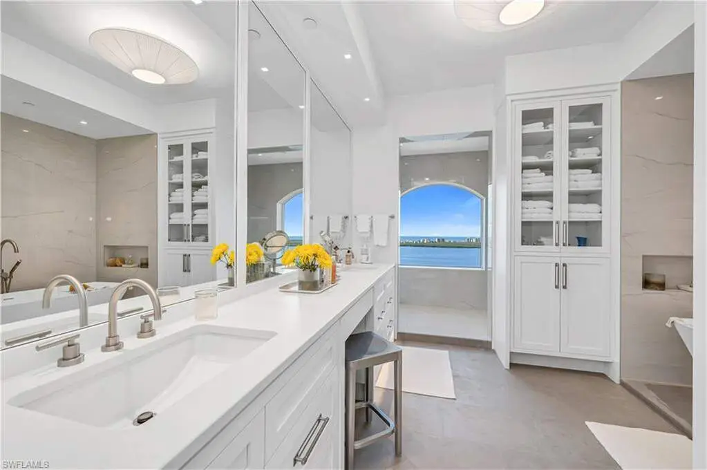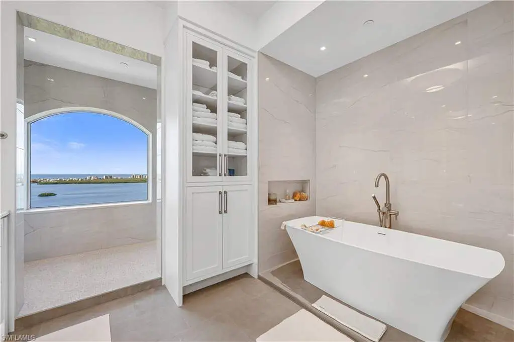 An extraordinary, rarely available total remodel-masterfully crafted by a premier Nantucket builder-this residence embodies sophistication and refinement at every turn. Sleek 36" porcelain tile flooring sets the tone, complemented by an abundance of recessed lighting and linear air diffusers that create a modern, gallery-like ambiance. The chef's kitchen is a showpiece, featuring waterfall quartz countertops, a Sub-Zero refrigerator and freezer tower, Wolf ovens and cooktops, and designer fixtures that exude elegance. Spa-inspired baths showcase extraordinary finishes, with a dramatic Gulf-view walk-in shower, a freestanding soaking tub, and bespoke custom closets that marry beauty with function. From the 18th-floor, south-facing lanai, enjoy panoramic vistas that sweep across the skyline to Naples and capture magnificent Gulf sunsets. A true extension of the living space, the oversized lanai is appointed with motorized screens and shutters, as well as a hand-crafted cypress ceiling-an exquisite private retreat with unmatched views, unobstructed by neighboring towers. Designed to live like a private estate yet with all the ease, safety, and security of a luxury high-rise, this 4,482-square-foot residence (as per developer's brochure) welcomes you through a dramatic gallery entrance opening to walls of glass and endless Gulf horizons. With three ensuite bedrooms, a powder bath, and a private study overlooking the water, the layout is both functional and indulgent. Additional features include soaring ceilings, electric storm shutters, two premium second-level parking spaces, and a private storage unit. Arrive at Horizons through a tree-lined, paver drive leading to its elevated tower presence. Residents enjoy a host of refined amenities, including newly redesigned social and card rooms, a resort-style geothermal pool and spa (cooled in summer, heated in winter), fitness center, massage room, and two guest suites for family and friends. The experienced on-site manager ensures seamless service, while terraces throughout the tower perch dramatically over Estero Bay-where dolphins and wildlife create a living panorama. Set within the prestigious gates of Bonita Bay, residents enjoy a lifestyle unlike any other. The community's brand-new private beach club on the Gulf of Mexico is easily accessed via resident shuttle. Twelve miles of walking trails. three parks. Full-service 400-slip marina. Optional membership in the Bonita Bay Club offers access to five championship golf courses, 15 pickleball courts, 12 tennis courts, and a 29,000-square-foot state-of-the-art fitness center featuring Pilates, spin, TRX, and more. The full-service spa includes massage, facials, hair, nail treatments. When it comes to luxury towers in Southwest Florida, Horizons Residence 1801 at Bonita Bay stands alone-an incomparable offering for the most discerning buyer seeking the perfect blend of sophistication, lifestyle, and Gulf-front grandeur.