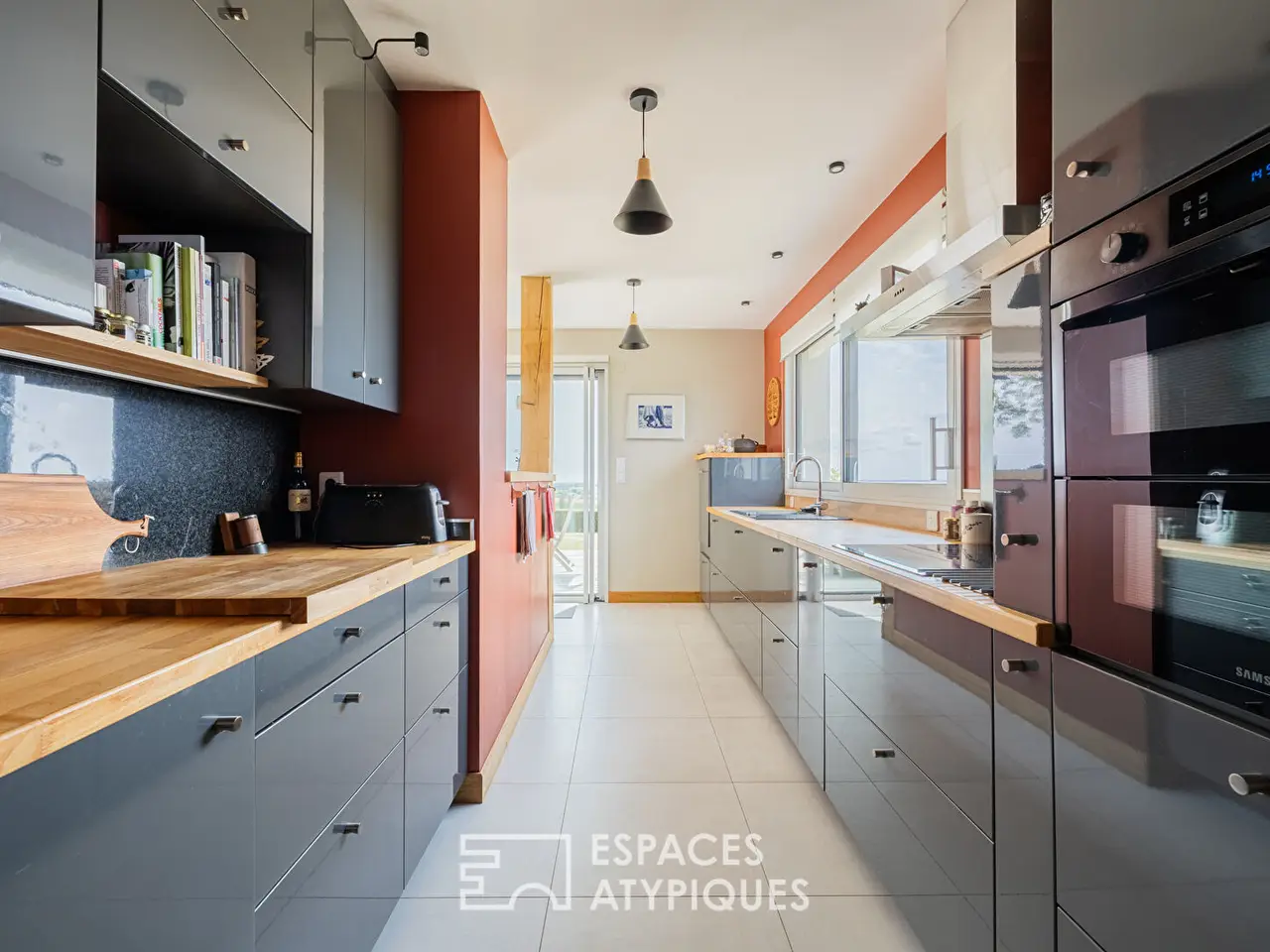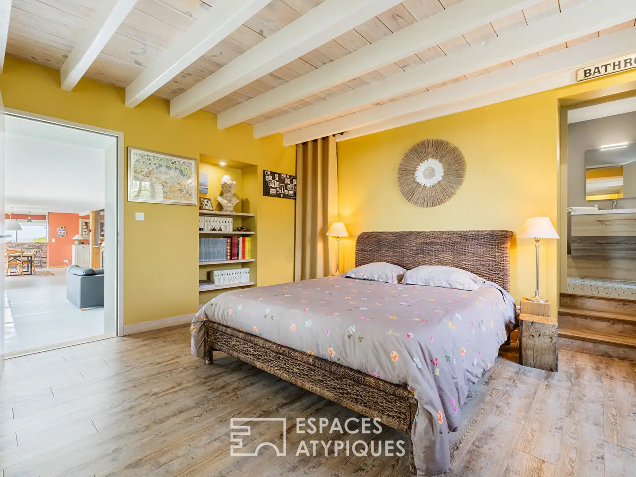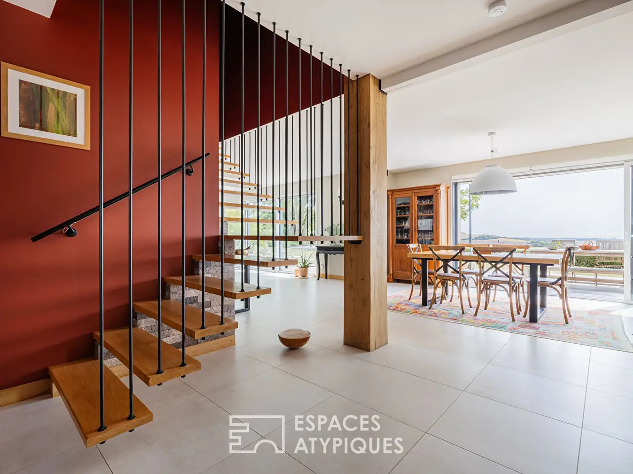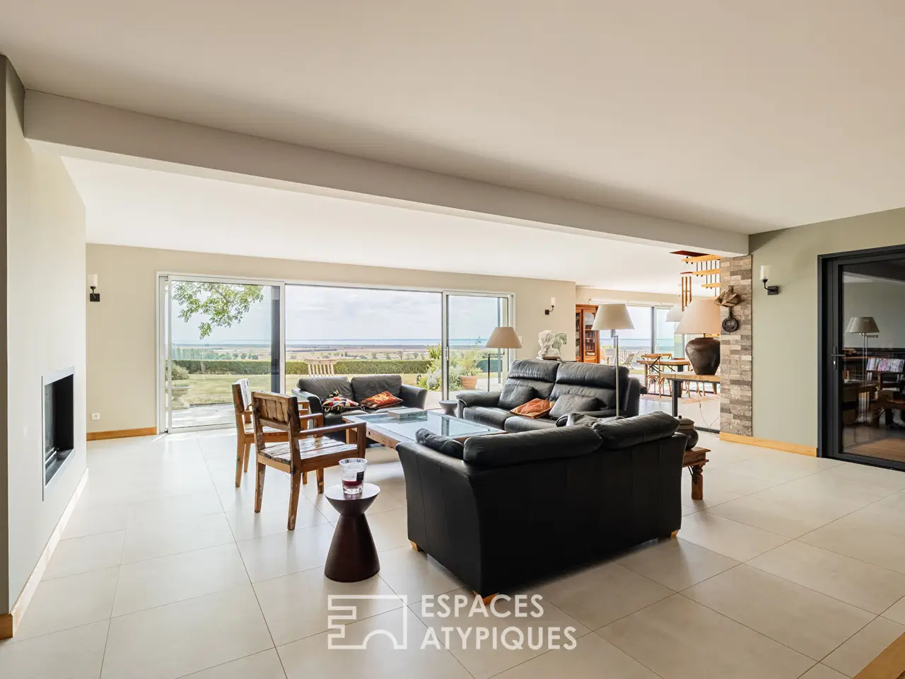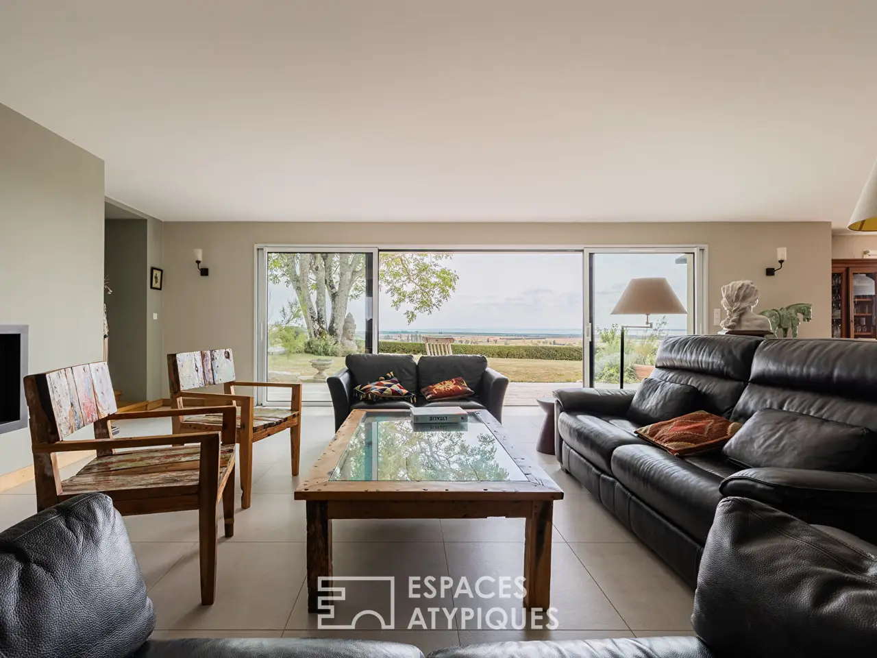 Nestled on the heights of Mortagne-sur-Gironde, an emblematic town on the Gironde estuary, an exceptional property is revealed. Born from the bold transformation of an old estuary house, this contemporary residence, built mainly with a timber frame, offers a unique living environment, where nature and design harmonize. This unique property, located on a plot of over 9,300 m2, including a wooded garden of approximately 1,900 m2 and a leisure plot of over 7,400 m2, enjoys an exceptional 180° panoramic view of the Gironde. The high-end design and quality construction add a subtle blend that conveys a particularly soothing atmosphere. The front door opens onto a bright and modular interior. The vast living room, the true heart of the house, is designed to adapt to all desires, combining a reception room, a TV corner, and an office. This space is designed to be open to the outside thanks to more than 10 meters of bay windows, but pleasure and comfort are not left out inside either: the real wine cellar, the large insert fireplace, the functional kitchen overlooking the estuary are all indications that life there is sweet and epicurean. The sleeping areas are functional and also modular. A bedroom on the ground floor has an individual shower room and allows for single-story living. Upstairs, a large master suite offers a vast independent space including a bathroom and a dressing room. Also upstairs, an additional bedroom equipped with a shower room and an office, which can become an additional bedroom if necessary, completes a well-designed floor equipped with a solarium overlooking the estuary. The magnetic view is never far away. All the rooms of the house benefit from a view of the estuary and its very special light, giving each of them a particular identity and softness. Modern and visionary, this house combines design and technology for comfort. Designed bioclimatically and equipped with high-performance materials, its photovoltaic panels produce more energy than it consumes. Outside, the landscaped grounds invite relaxation. The wooded garden offers several spaces that allow you to fully enjoy the iconic view and absolute peace and quiet. The property enjoys a dominant and privileged position that ensures total tranquility. Located just minutes from shops and services, this house offers a perfect balance between country living and practicality. This residence is a unique product, a successful marriage of environmentally friendly architecture and resolutely contemporary design. This atypical property, with its sublime view and absolute comfort, represents a rare opportunity to enjoy an exceptional property and an unparalleled view. ENERGY CLASS: A / CLIMATE CLASS: A Estimated average amount of annual energy expenditure for standard use, established from the average energy prices for the years 2021, 2022 and 2023: between EUR910 and EUR1290. REF. EALR2153 Additional information * 5 rooms * 4 bedrooms * 2 bathrooms * 1 bathroom * Floor : 1 * 1 floor in the building * Outdoor space : 9300 SQM * Property tax : 1 355 € Energy Performance Certificate Primary energy consumption a : 51 kWh/m2.year High performance housing