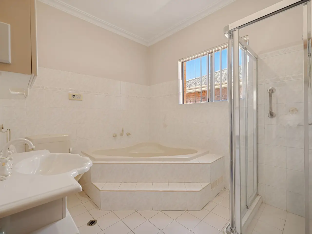 Corner spa tub in main bathroom