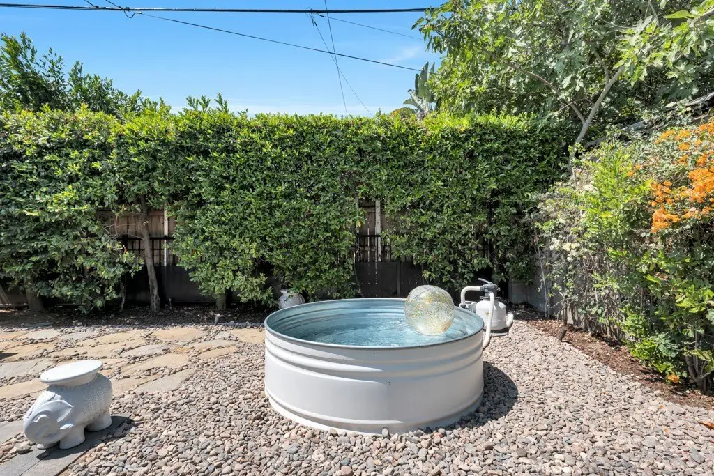 Landscaped backyard with cowboy soaking tub Meticulously designed landscaping