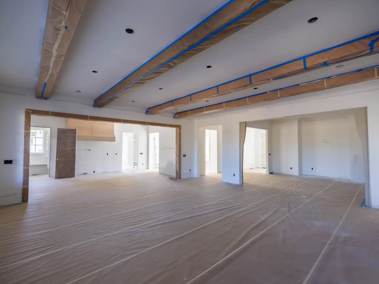 • Vaulted ceilings with wood beam accents