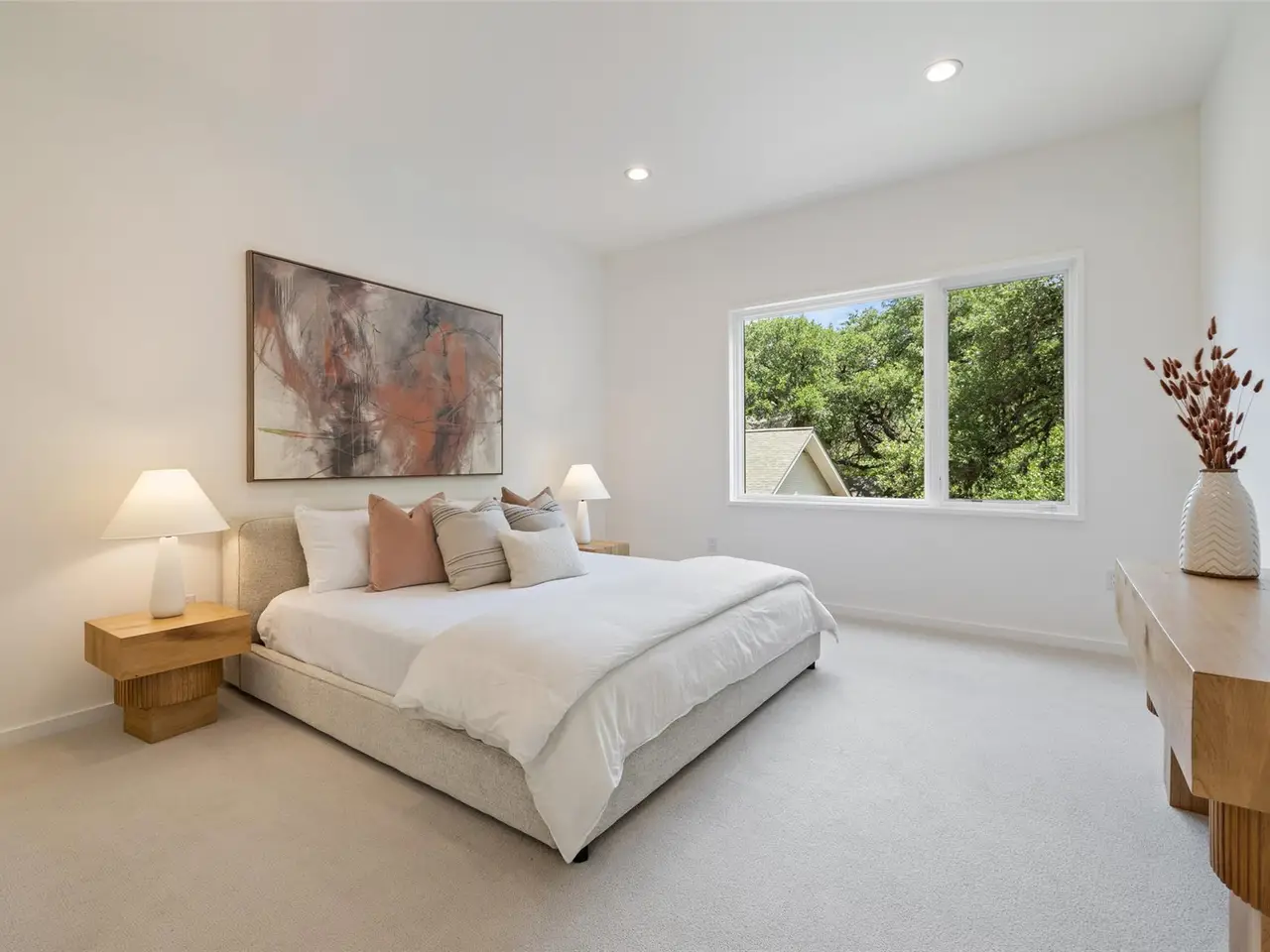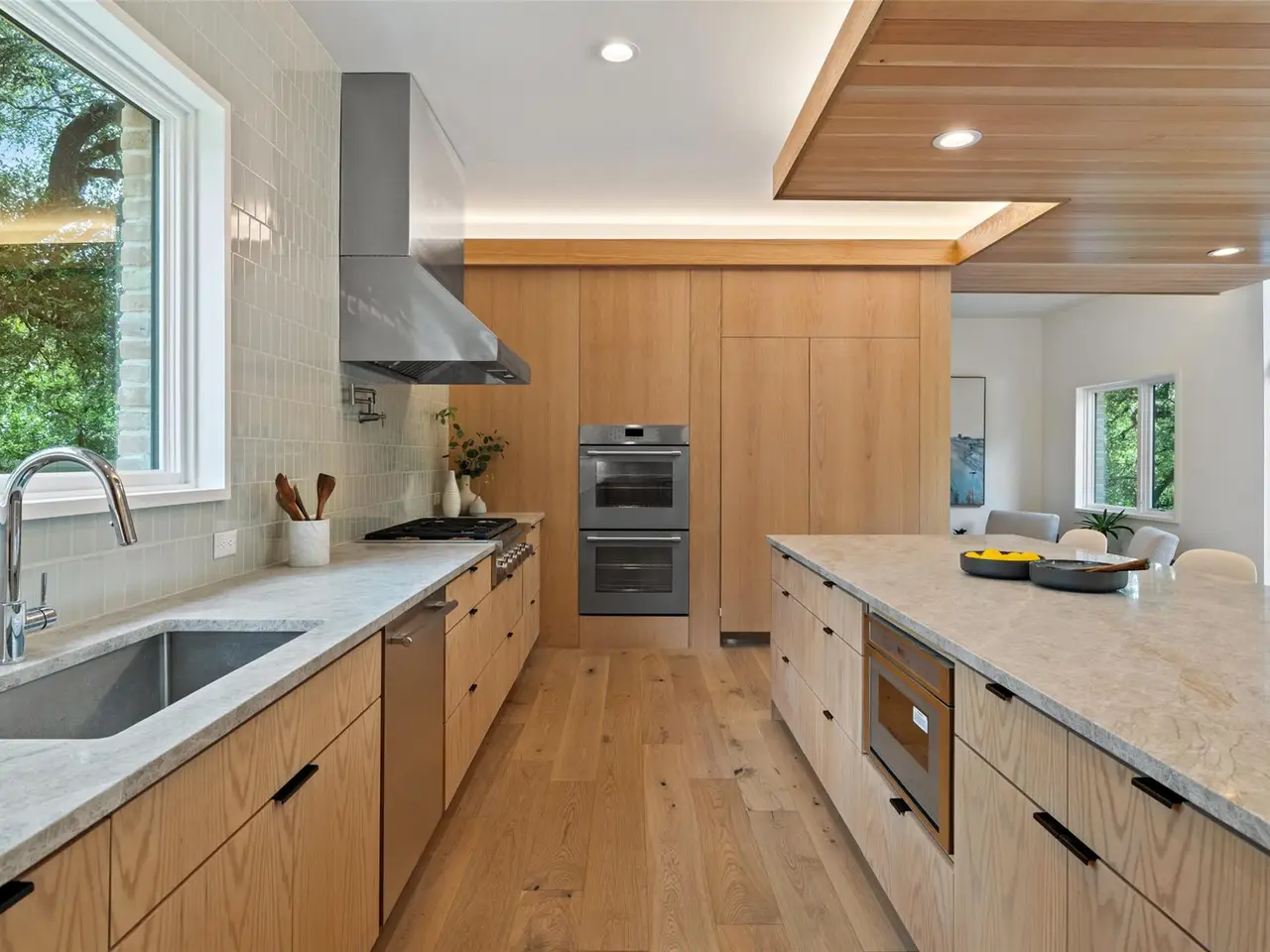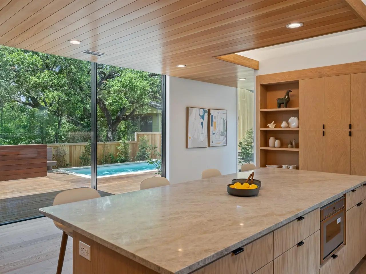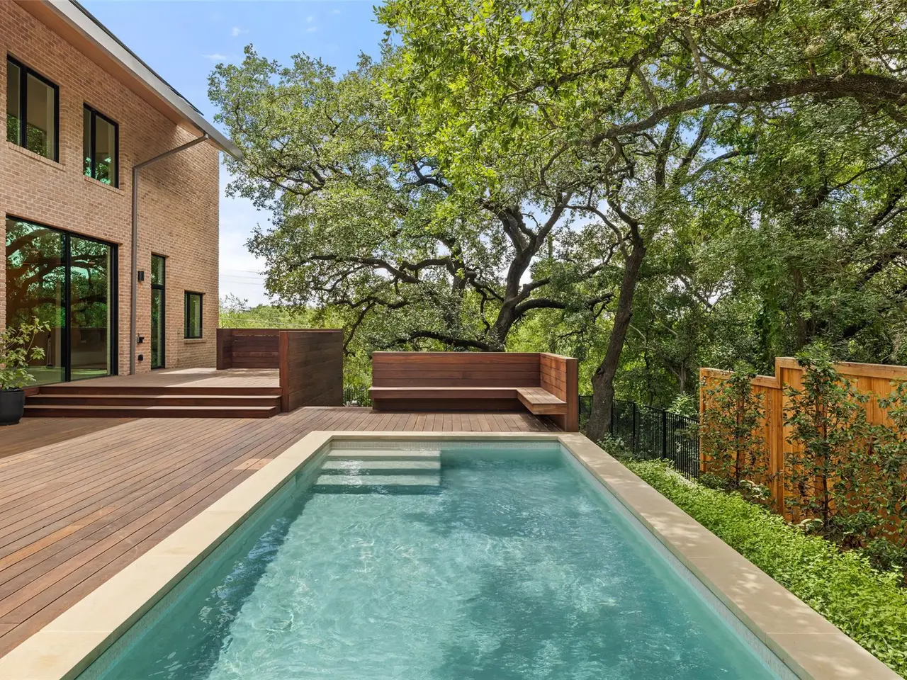This extraordinary new construction with masterful architectural attention to space and light provides the rare opportunity to live in a modern luxury home in Travis Heights. Surrounded by majestic live oaks, this thoughtfully designed home maximizes indoor/outdoor living, with a show- stopping wall of sliding glass doors connecting the entire first floor to a sweeping Brazilian hardwood deck and pool. Every detail focuses on first-class materials that bring nature inside. Beautiful hardwoods, marble, quartzite, and handmade tile imbue the home with warm sophistication. Gathering areas feel both intimate and expansive with a huge entertaining kitchen containing two sinks, two dishwashers and butler pantry, and a generous open living/dining area. The primary suite features a large closet, wood- wrapped spa bath, walk-in shower, and ample storage. Two spacious ensuite bedrooms with walk-in closets and laundry complete the second floor, and the third floor provides a bonus attic space and wonderful roof terrace in the treetops with downtown views. The guest suite is conveniently located off the entry and a flex suite for an office, gym, or nanny suite resides next to the pool. This custom home is exceptional for its smart, sustainable design and construction quality. A full solar roof array provides significant energy savings, and a large two-car garage is wired for EV charging. A security system is installed, along with hard wiring to each room to meet every digital desire. All materials were vetted for sustainability including Forest Stewardship Certified wood, low/no-VOC paints, and no-VOC foam insulation. With care taken at every stage from framing to finish out, this energy-efficient home is built to last. Full of historic charm, tree-lined streets, and parks, Travis Heights is steps away from Lady Bird Lake, South Congress, and the East Side. This gorgeous home promises you can have it all: the very best of Austin downtown and neighborhood living.