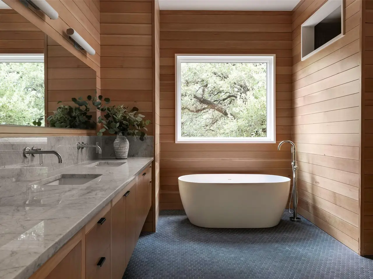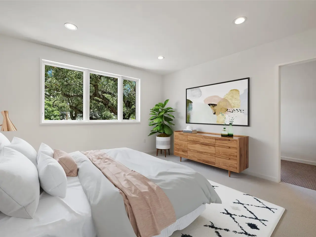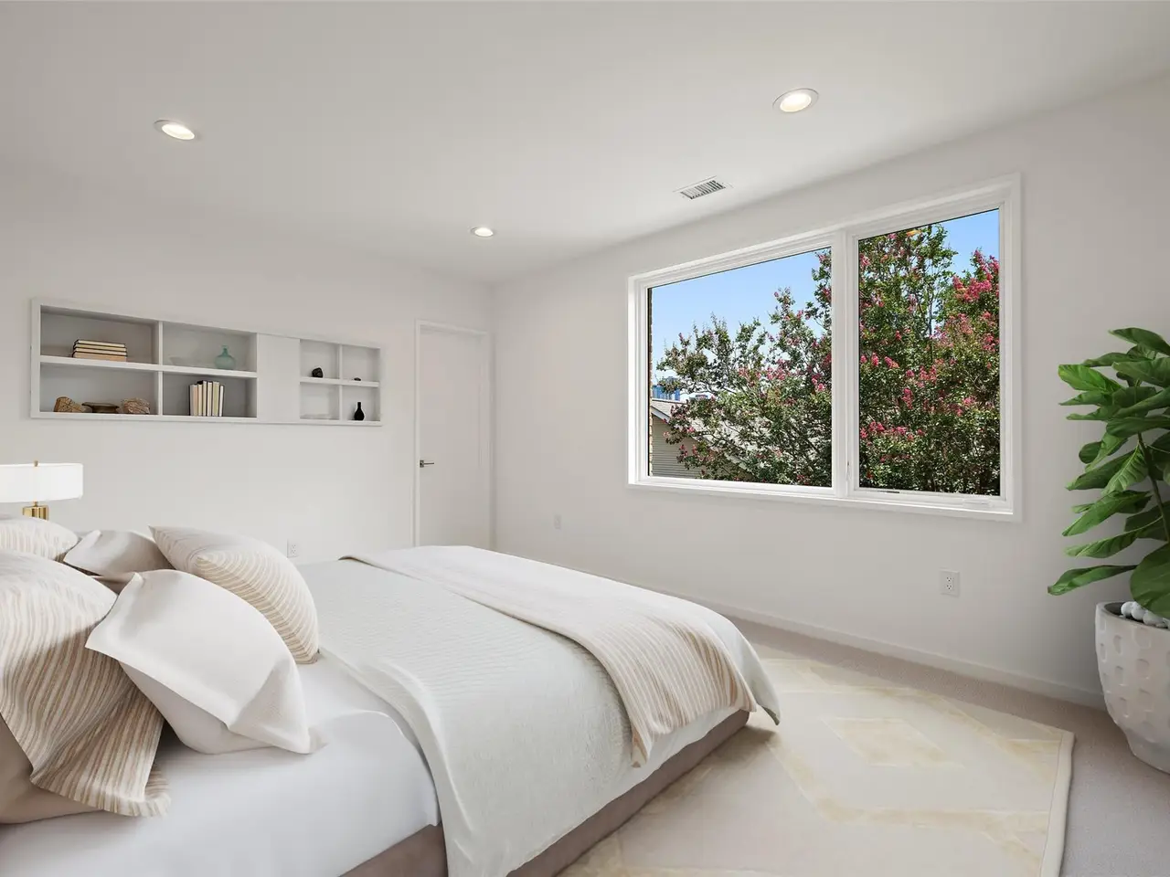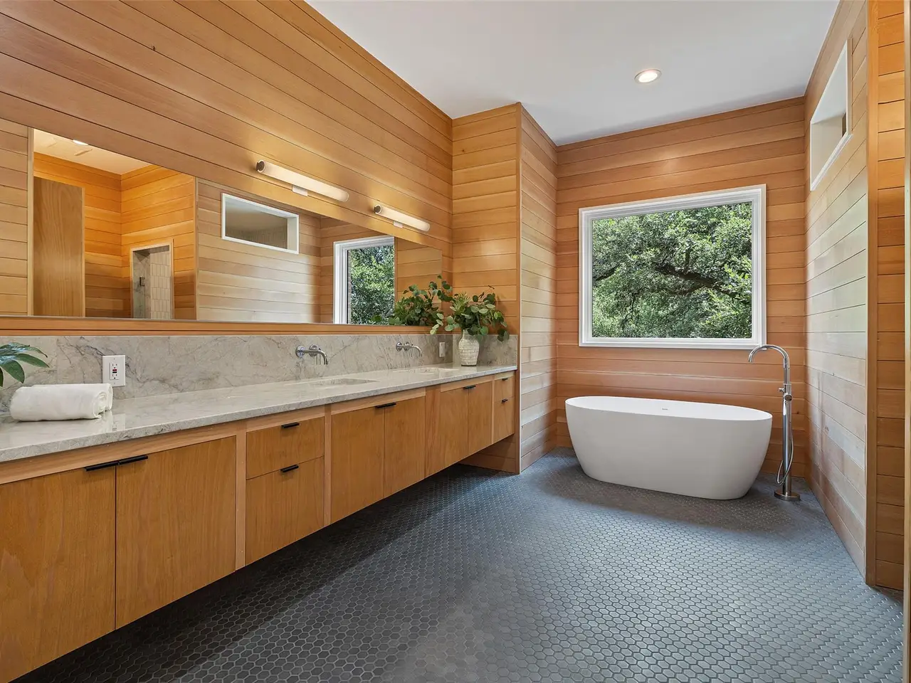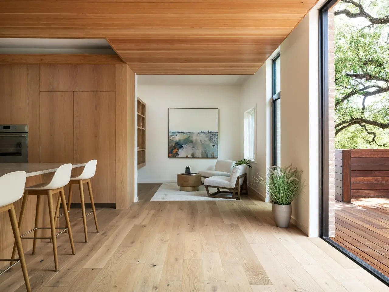 This extraordinary new construction with masterful architectural attention to space and light provides the rare opportunity to live in a modern luxury home in Travis Heights. Surrounded by majestic live oaks, this thoughtfully designed home maximizes indoor/outdoor living, with a show- stopping wall of sliding glass doors connecting the entire first floor to a sweeping Brazilian hardwood deck and pool. Every detail focuses on first-class materials that bring nature inside. Beautiful hardwoods, marble, quartzite, and handmade tile imbue the home with warm sophistication. Gathering areas feel both intimate and expansive with a huge entertaining kitchen containing two sinks, two dishwashers and butler pantry, and a generous open living/dining area. The primary suite features a large closet, wood- wrapped spa bath, walk-in shower, and ample storage. Two spacious ensuite bedrooms with walk-in closets and laundry complete the second floor, and the third floor provides a bonus attic space and wonderful roof terrace in the treetops with downtown views. The guest suite is conveniently located off the entry and a flex suite for an office, gym, or nanny suite resides next to the pool. This custom home is exceptional for its smart, sustainable design and construction quality. A full solar roof array provides significant energy savings, and a large two-car garage is wired for EV charging. A security system is installed, along with hard wiring to each room to meet every digital desire. All materials were vetted for sustainability including Forest Stewardship Certified wood, low/no-VOC paints, and no-VOC foam insulation. With care taken at every stage from framing to finish out, this energy-efficient home is built to last. Full of historic charm, tree-lined streets, and parks, Travis Heights is steps away from Lady Bird Lake, South Congress, and the East Side. This gorgeous home promises you can have it all: the very best of Austin downtown and neighborhood living.