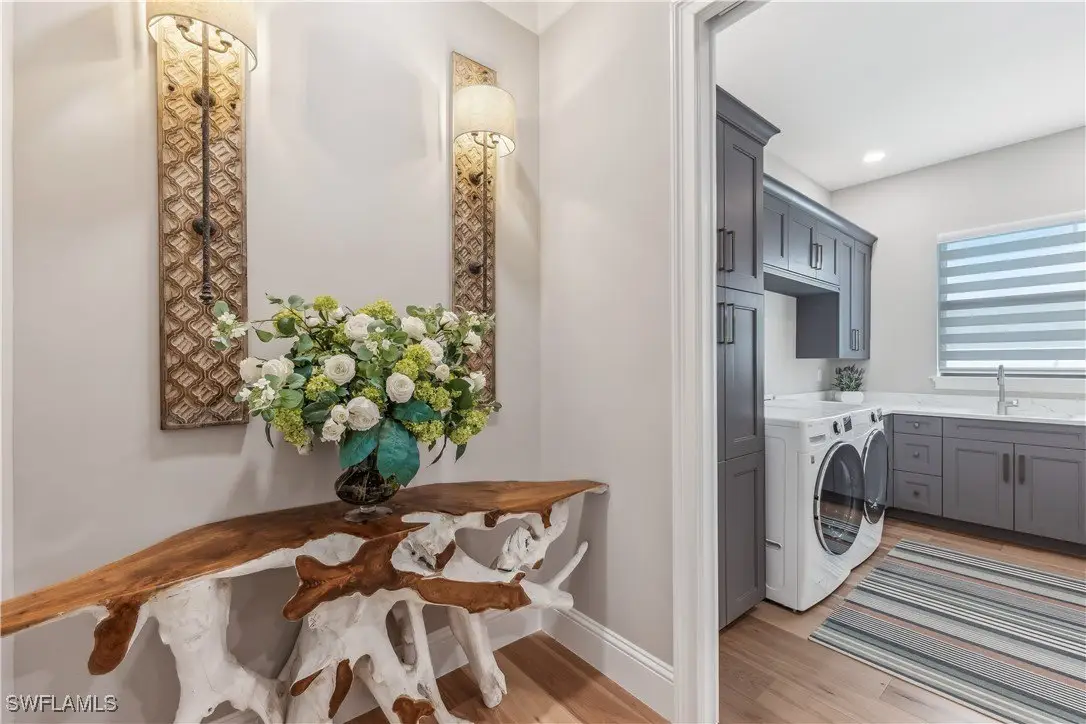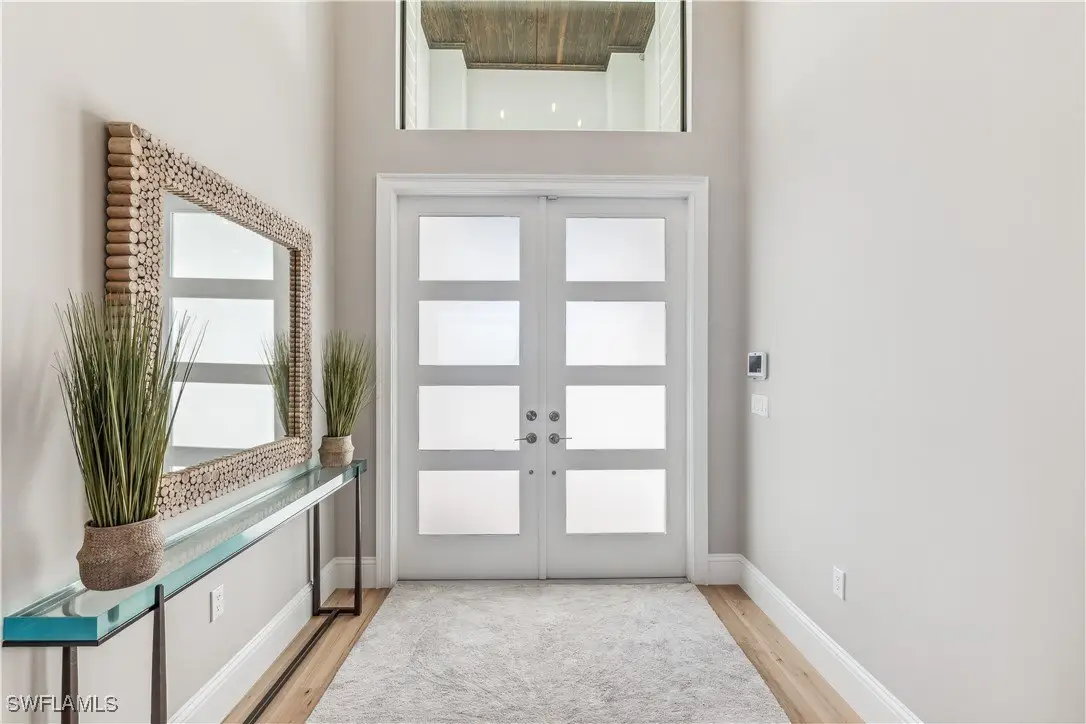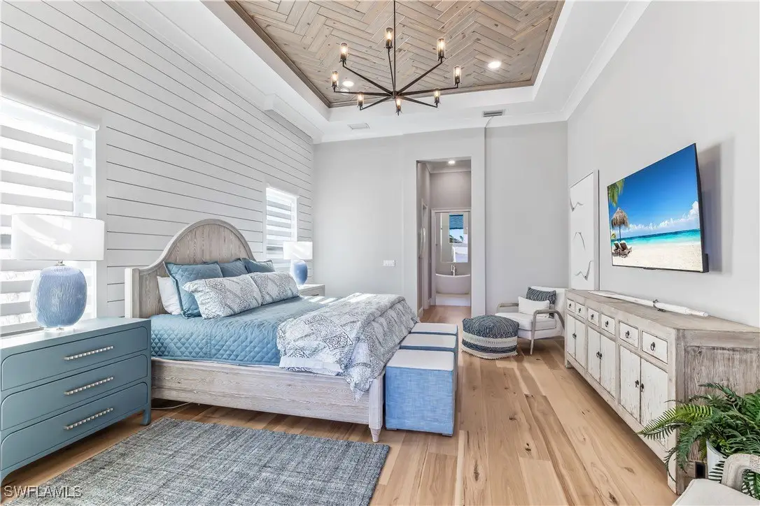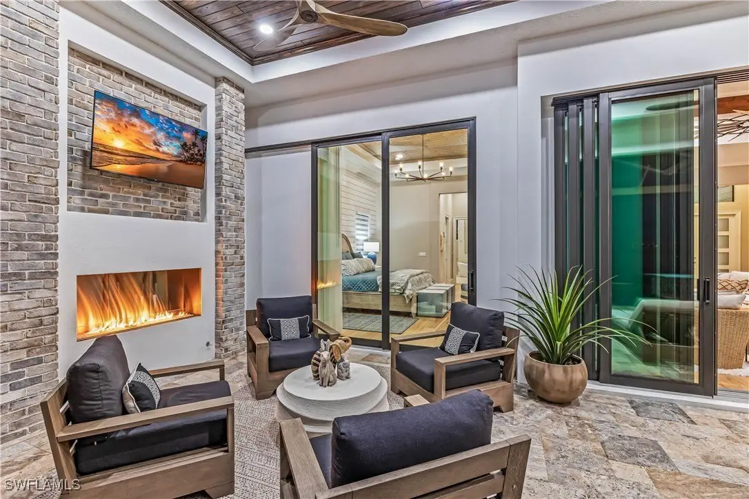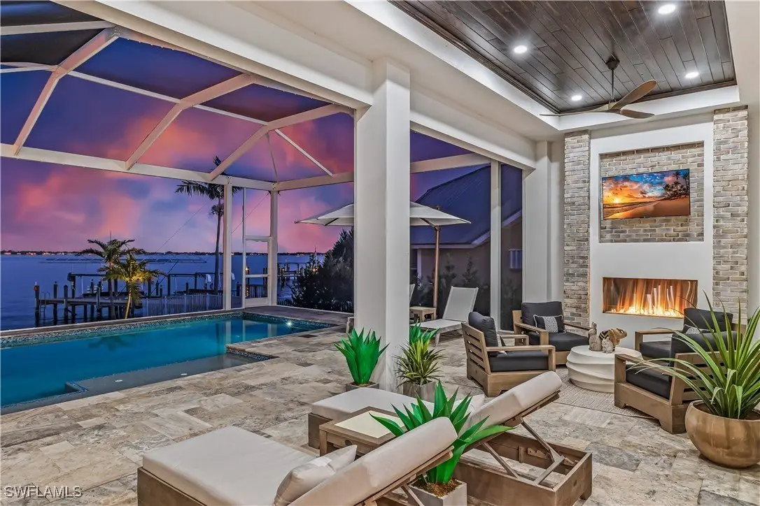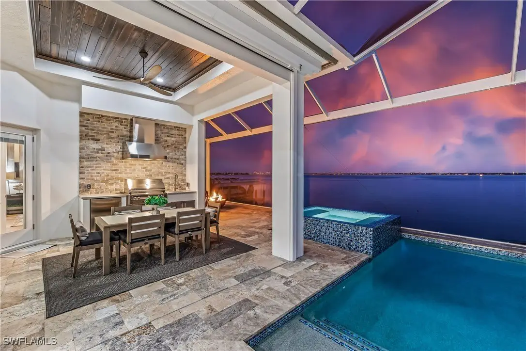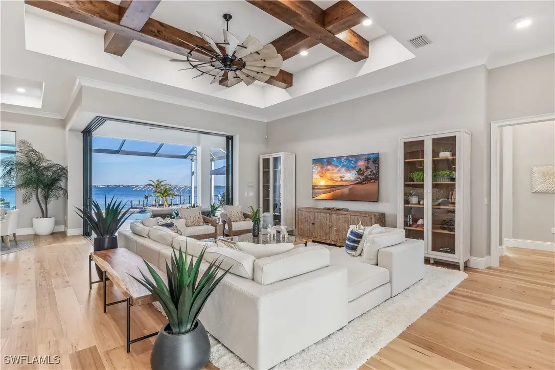 Discover the epitome of luxury living in this exquisite new construction (2023) coastal contemporary masterpiece, perfectly situated along the stunning riverfront. Designed for the discerning homeowner and avid boater, this home offers breathtaking views that transform every moment into a picturesque escape. As you step inside, you are welcomed by soaring 12 to 16-foot ceilings adorned with elegant Knotty Alder wood beams, complemented by rich American Hickory hardwood floors that exude warmth and sophistication. The culinary enthusiast will revel in the chef’s dream kitchen, featuring state-of-the-art Wolf appliances, a gas cooktop, and an expansive island topped with luxurious quartz surfaces, making it the ideal space for entertaining. A hidden door discreetly leads to a spacious butler's pantry, perfect for gourmet preparations. This home boasts four opulent en-suite bedrooms, along with a convenient half bath for guests, ensuring comfort and privacy for all. Elegant tongue and groove southern pine wood ceiling inlays further enhance the home’s exquisite design. Step outside to the breathtaking screened-in lanai, where panoramic views of the river create a serene backdrop for relaxation. This outdoor oasis is designed for entertainment, featuring a gourmet outdoor kitchen with a gas grill, a cozy gas fire pit, and a heated pool that beckons you to unwind. The harmonious elements of fire and water create an enchanting atmosphere, perfect for hosting gatherings or enjoying tranquil evenings under the stars. This is more than just a home—it's a lifestyle destination that embodies luxury and comfort. Don't miss the opportunity to claim this warm and inviting masterpiece as your own!