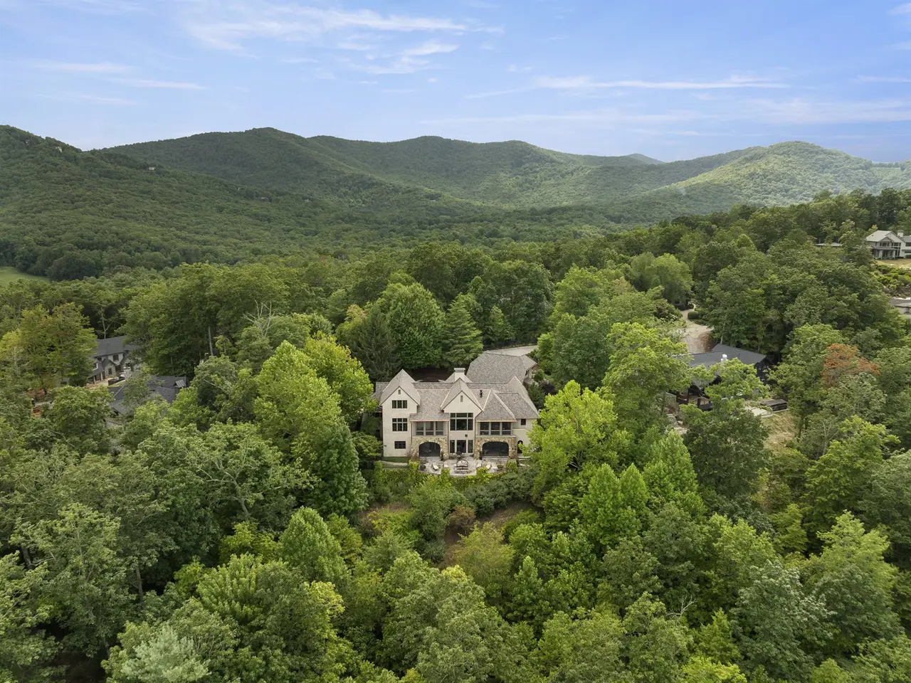 A gentle driveway and expansive brick paver private courtyard welcome you to this luxury mountain enclave. Revel in outstanding long-range mountain views throughout the house with every convenience plus some creative surprises. A fabulous French Country-style kitchen offers Oak and copper accents along with a separate pantry and breakfast room with a retractable wall opening to the outdoor dining porch. The main level primary suite has a beamed ceiling and opens to a screened porch, an elegant primary closet that flows easily into the spa-inspired bath with a steam shower, whirlpool tub, and radiant heat floors. Special highlights include two-story beamed ceilings, clerestory windows, home elevator, hidden bookcase doorways on the terrace level, gorgeous oak wet bar, and private guest quarters. Enticing outdoor living spaces include a fenced level yard, four private screened porches, and an expansive flagstone terrace framed by a stone retaining wall and a built-in gas firepit.